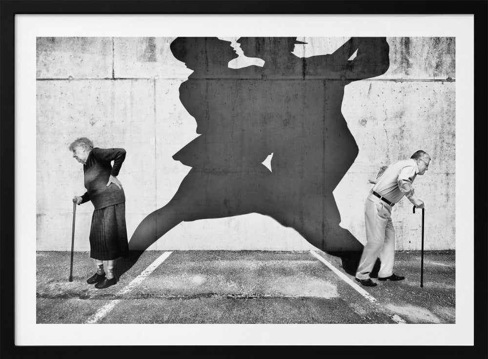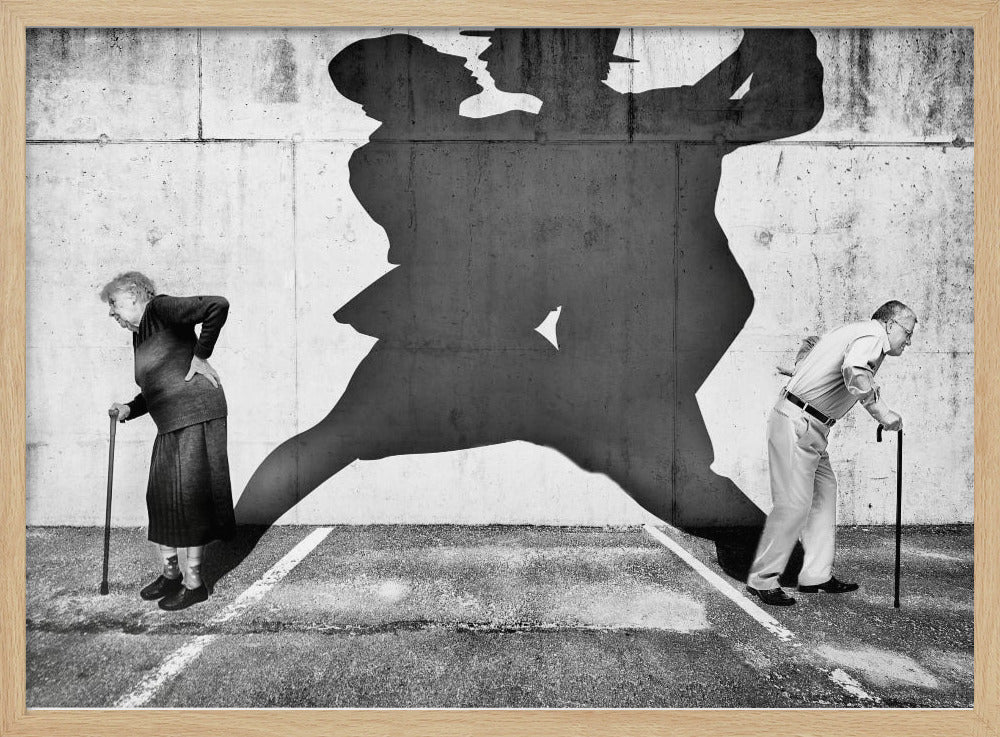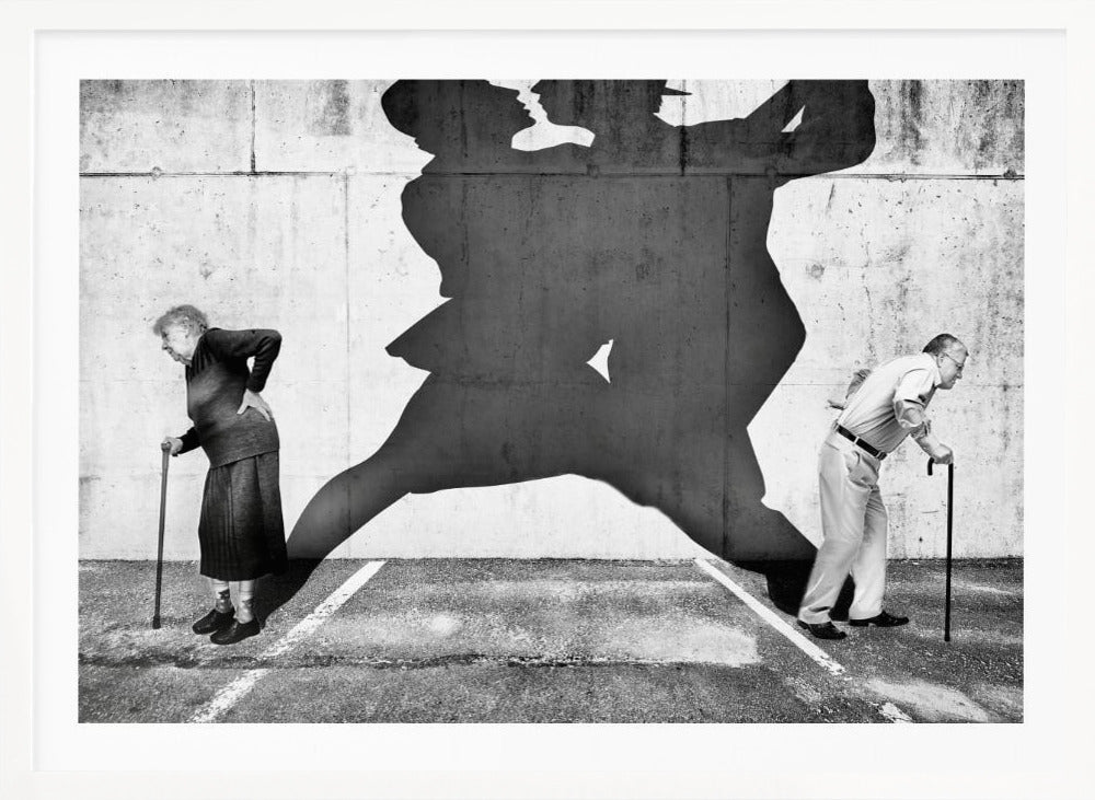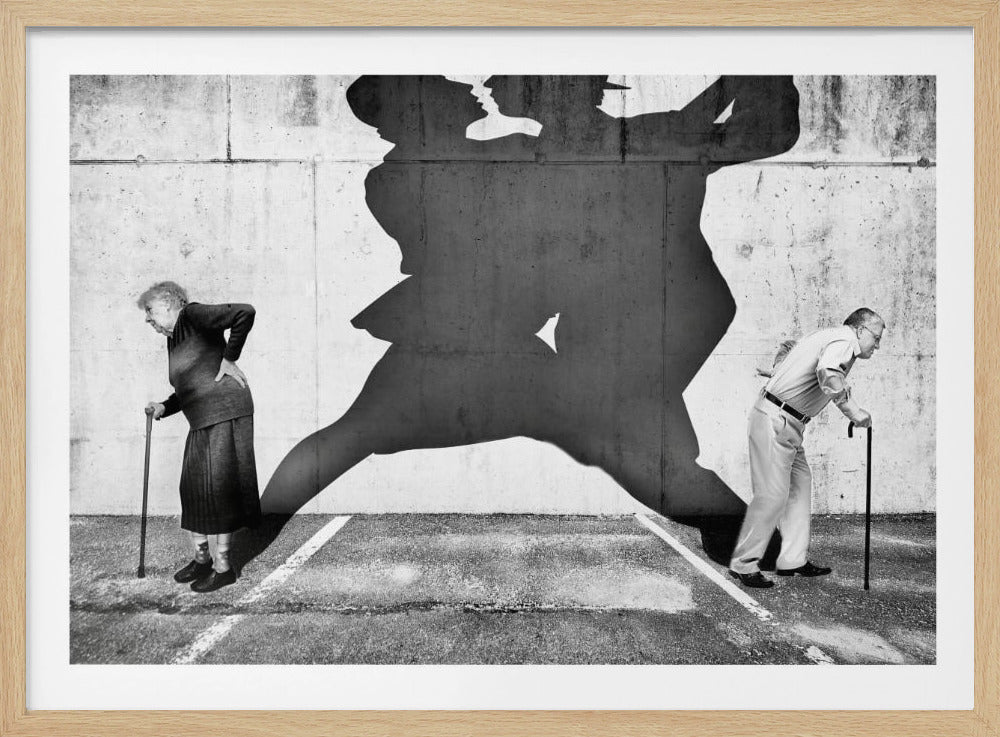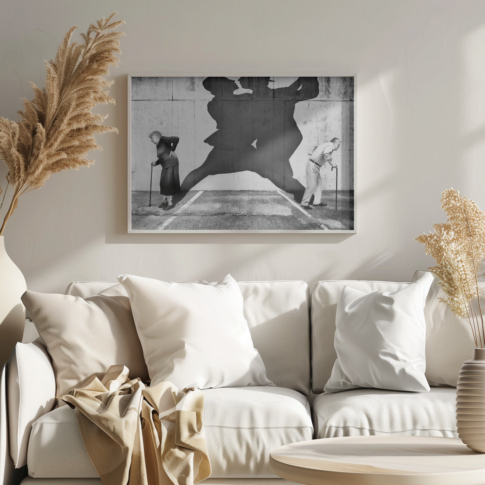 Denna unika poster 'Inside Young' från Pristine Clothes fångar en fascinerande surrealistisk berättelse i svartvitt. En äldre man med käpp och hatt dansar med sin egen unga skugga, vilket skapar en lekfull och tankeväckande kontrast mellan ålder och ungdom. Verket kombinerar humor med ett djupare koncept om livets gång.