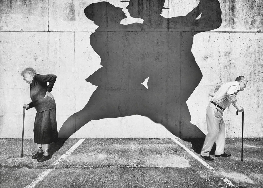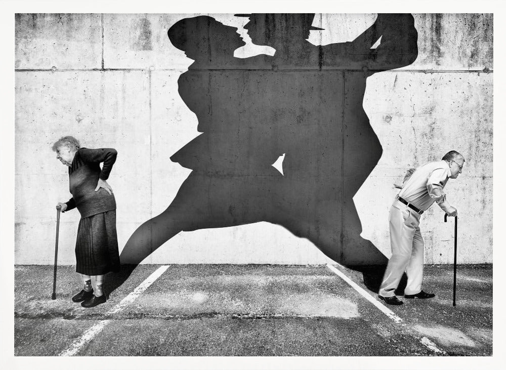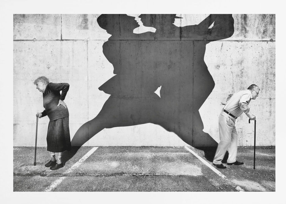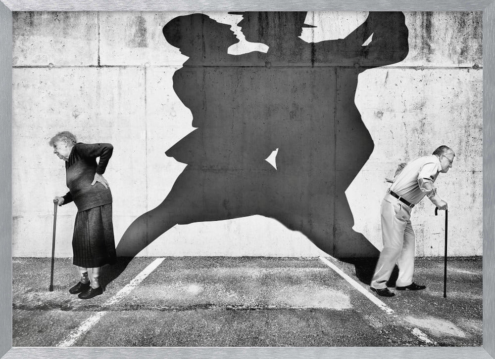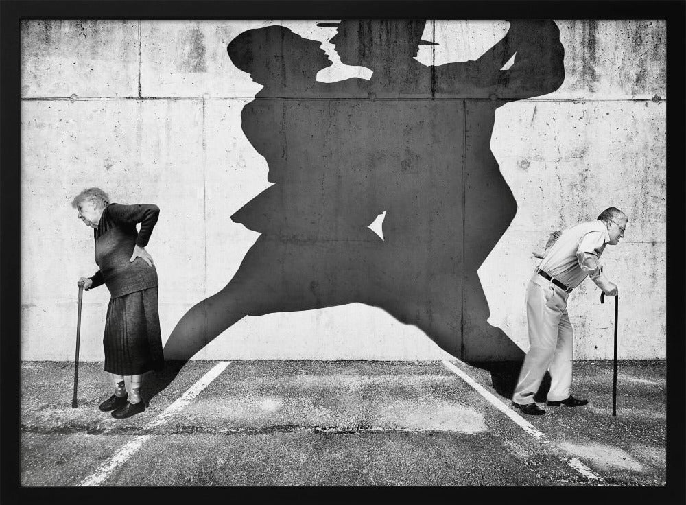 Denna unika poster 'Inside Young' från Pristine Clothes fångar en fascinerande surrealistisk berättelse i svartvitt. En äldre man med käpp och hatt dansar med sin egen unga skugga, vilket skapar en lekfull och tankeväckande kontrast mellan ålder och ungdom. Verket kombinerar humor med ett djupare koncept om livets gång.