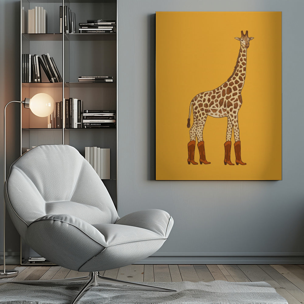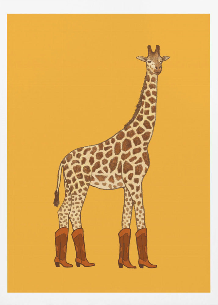 Denna underbara poster, skapad av Anyone Can Yeehaw, presenterar Jolene, den kaxiga cowgiraffen, redo för äventyr i Vilda Västern. Med sin gula bakgrund och iögonfallande färger sprider denna handritade design glädje och en humoristisk twist som passar perfekt för barnrummet eller den som älskar unika djurmotiv.