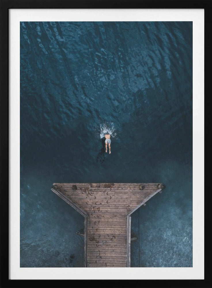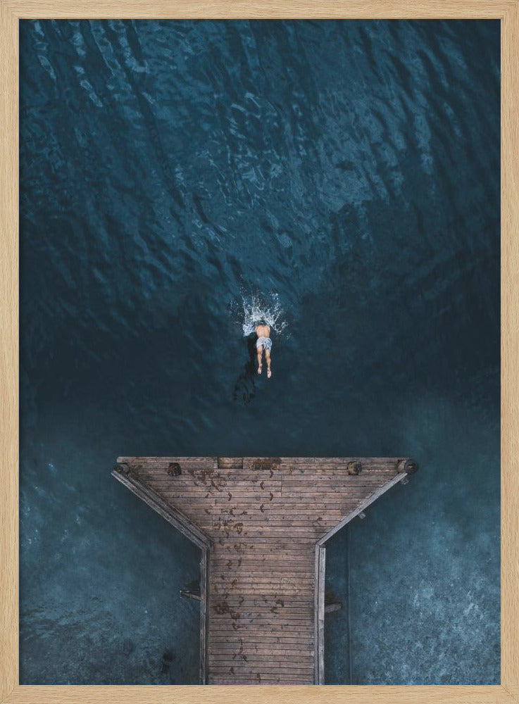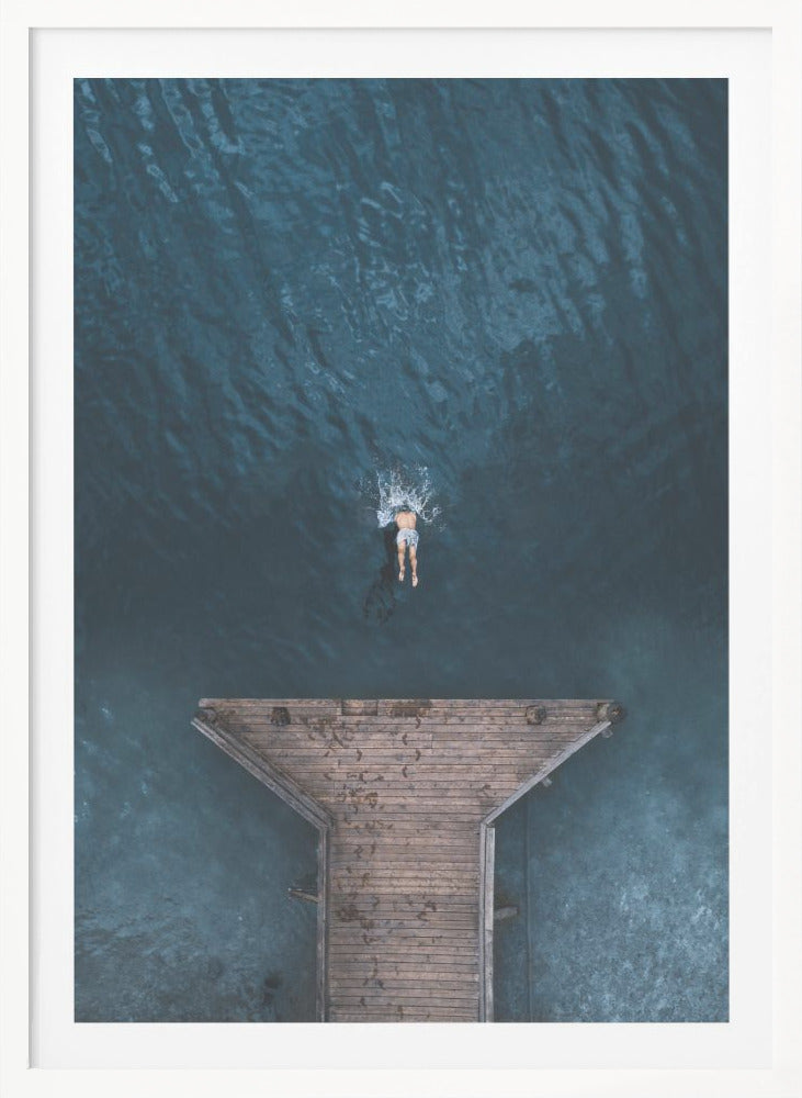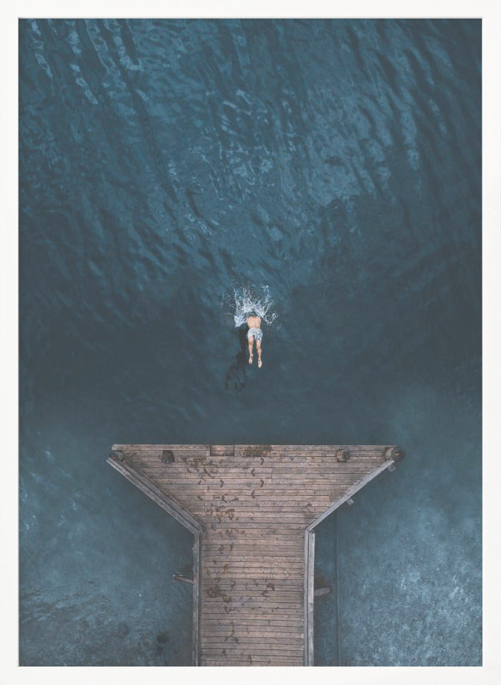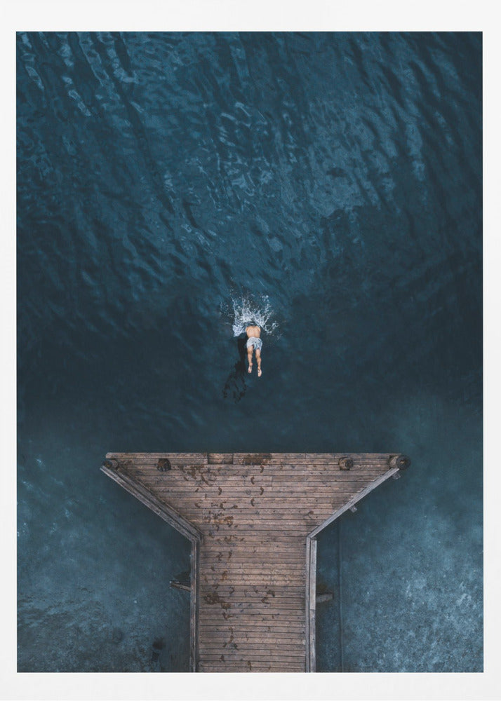 Dyk in i Witold Ziomeks fängslande verk "JUMP", en poster som perfekt fångar ögonblickets magi. Bilden, med sin rena estetik och avskalade komposition, visar en man som modigt hoppar från en brygga rakt ut i det inbjudande vattnet. Denna minimalistiska bild skapar en känsla av frihet och oändlig sommarglädje, perfekt för att förvandla vilket rum som helst till en lugn tillflyktsort.