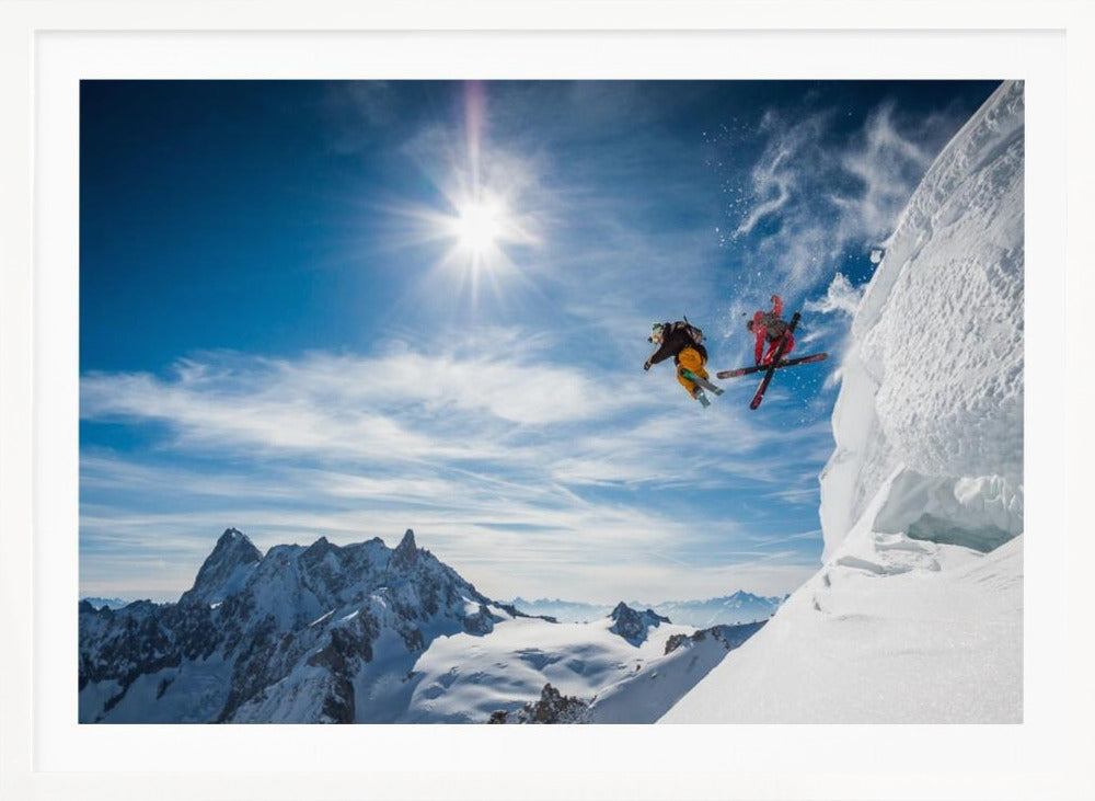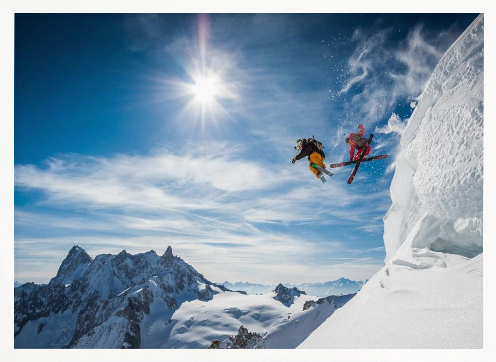 Upplev spänningen med denna dynamiska poster 'Jumping Legends' av den hyllade fotografen Tristan Shu. Fångad i en spektakulär freestyle-manöver över ett snötäckt alplandskap, förmedlar bilden ren adrenalin och frihet. Den dramatiska solstrålen och den frysta luften skapar en magisk aura, perfekt för äventyrsälskare.