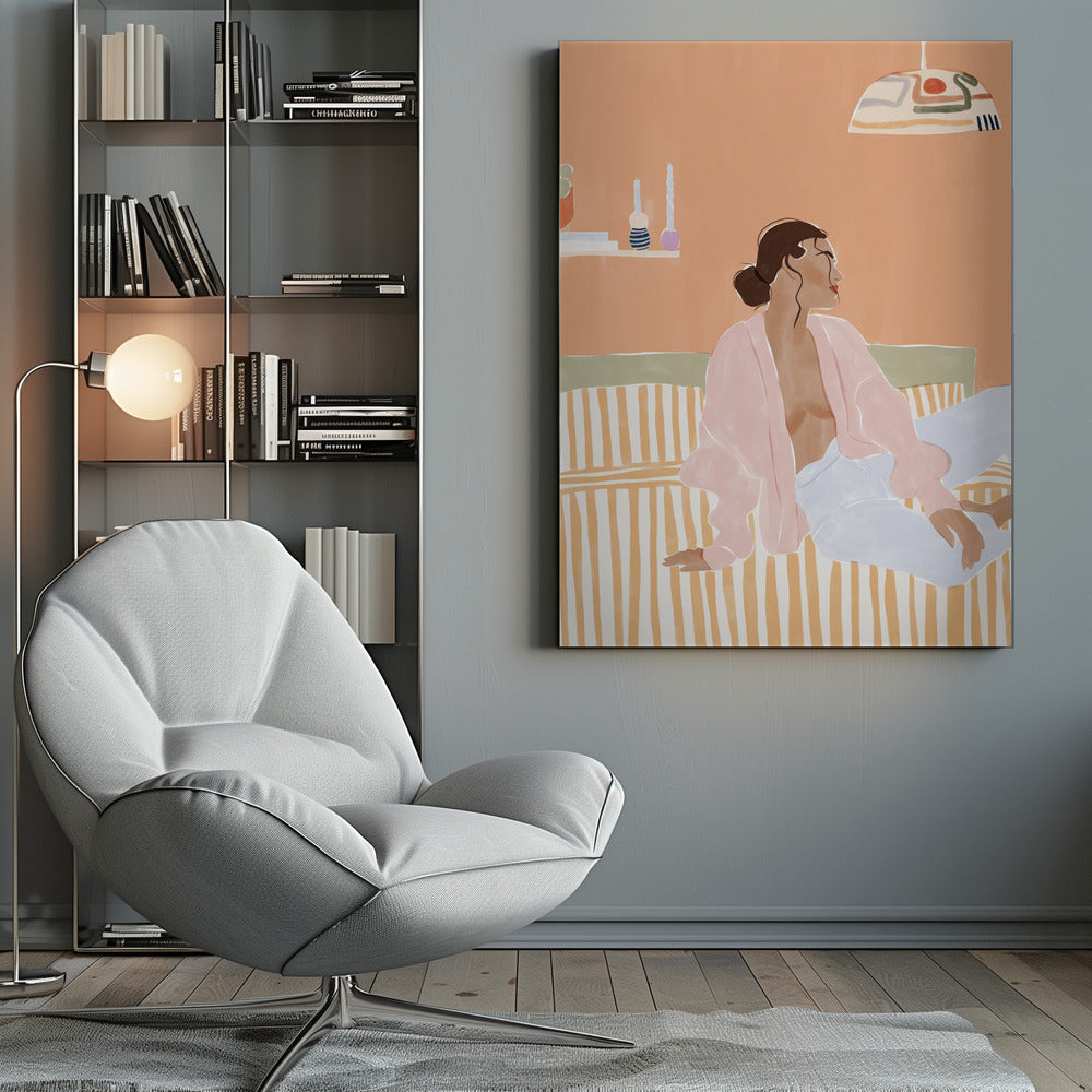 Koppla av med ”Just Let Me Chill” från Ivy Green Illustrations, ett vackert konsttryck som fångar den sköna känslan av total avkoppling. Denna figurativa affisch med en kvinna i randig pyjamas som vilar i sängen, omsvept av varma persika- och orange toner, förmedlar en lugn och inbjudande atmosfär. Ett perfekt tillskott för att skapa en avslappnad livsstil i ditt hem.