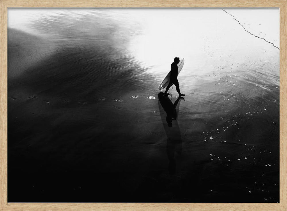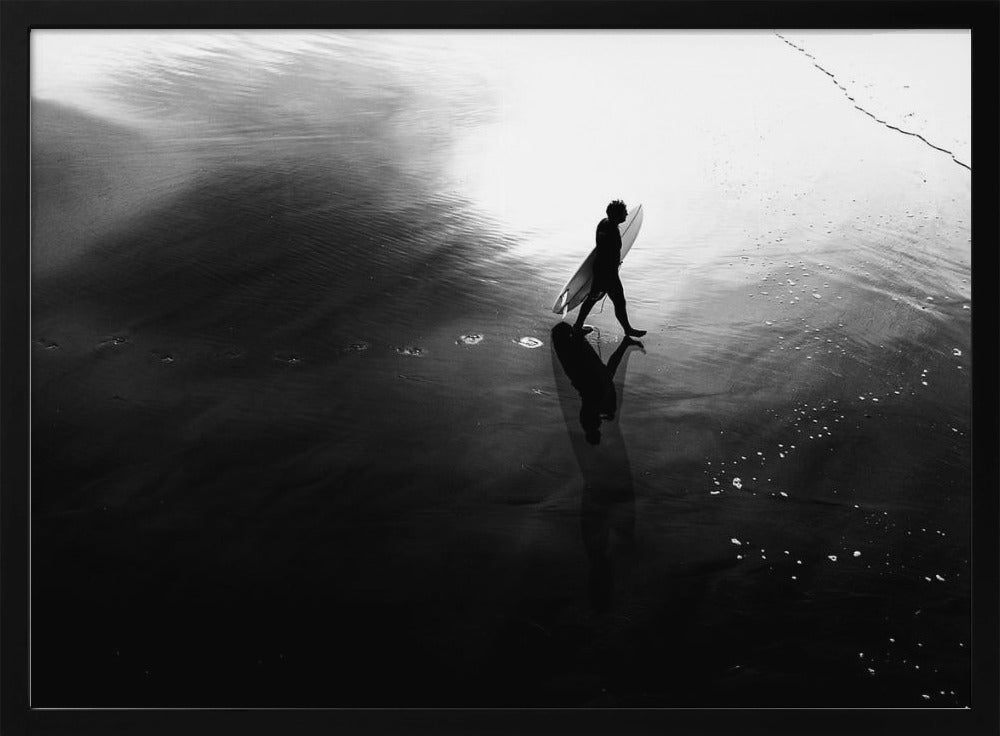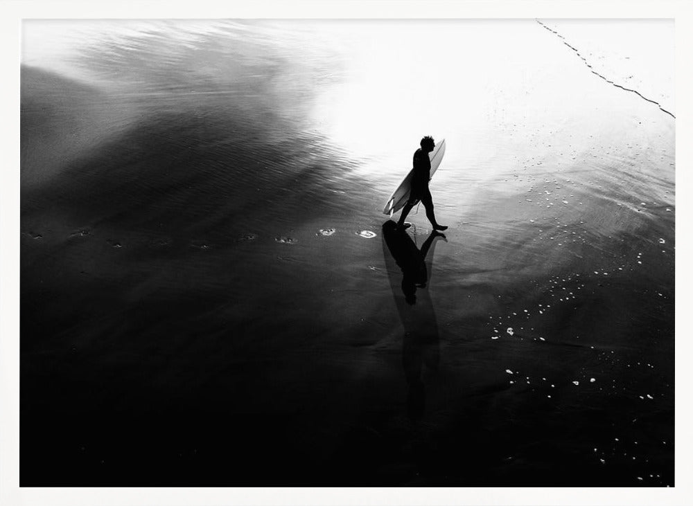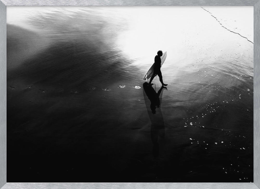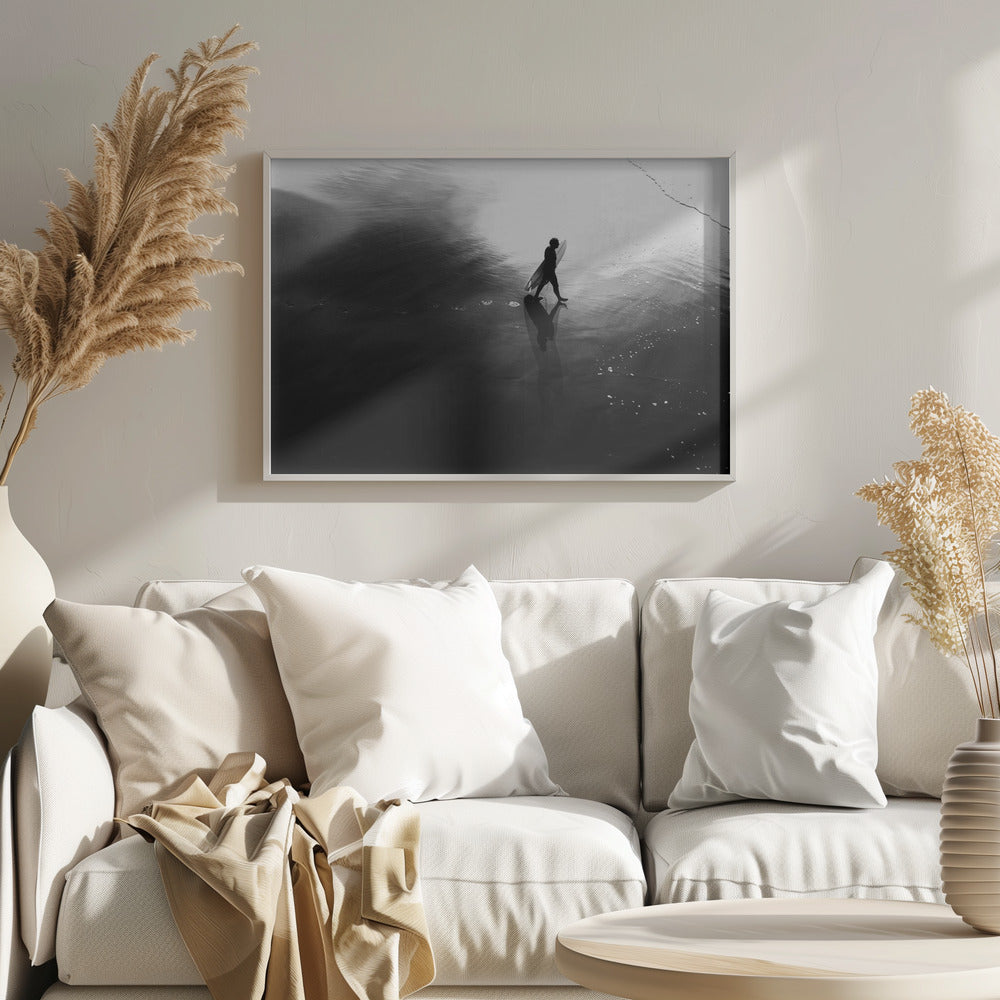 Massimo Della Lattas verk "La farfalla" är en hypnotiserande svartvit affisch som fångar den råa skönheten hos havet och en ensam surfare. Bilden, med dess dramatiska kontraster och fina toner, förmedlar en känsla av stillhet och frihet. Den monokroma paletten framhäver vågornas rörelse och strandens lugna horisont, vilket skapar en tidlös och reflekterande stämning i ditt hem.