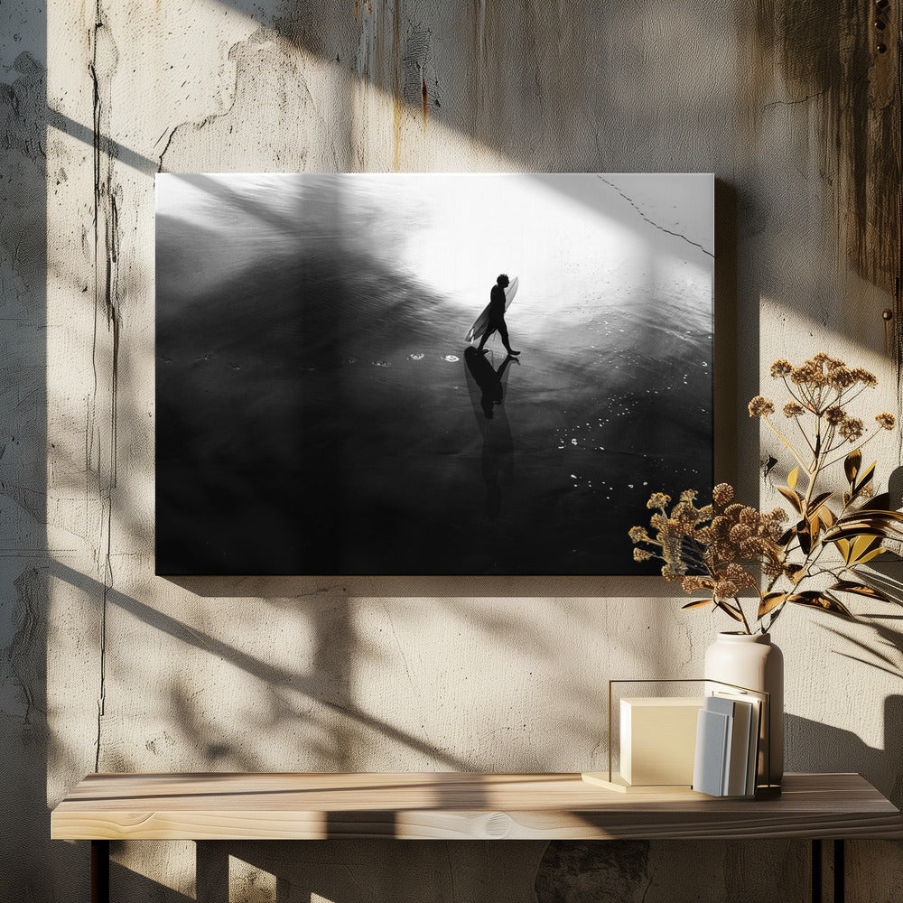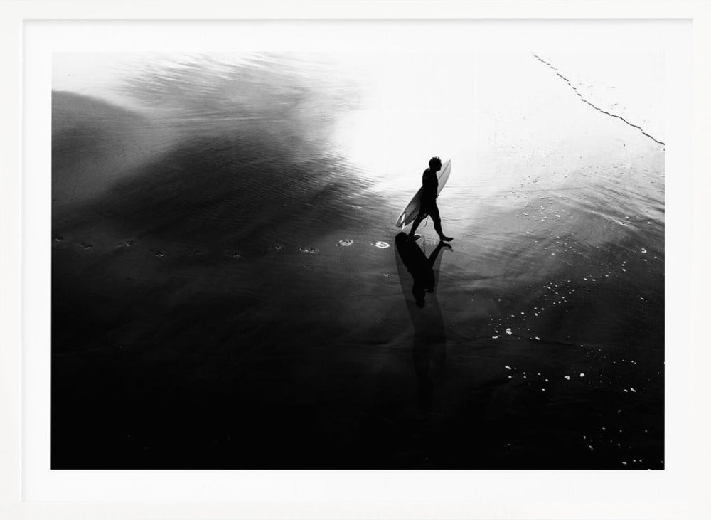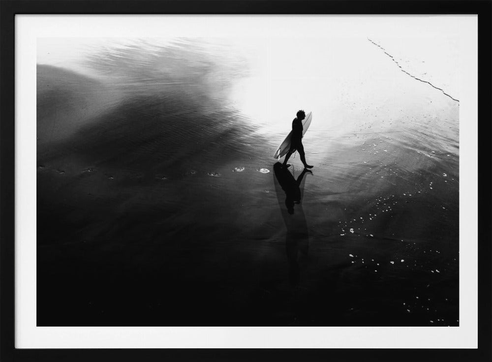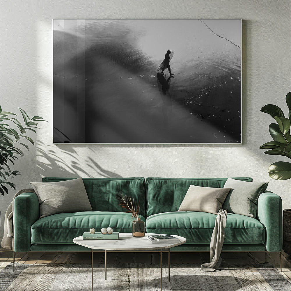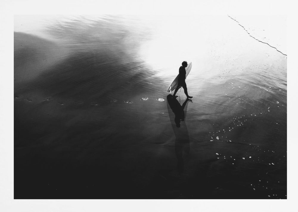 Massimo Della Lattas verk "La farfalla" är en hypnotiserande svartvit affisch som fångar den råa skönheten hos havet och en ensam surfare. Bilden, med dess dramatiska kontraster och fina toner, förmedlar en känsla av stillhet och frihet. Den monokroma paletten framhäver vågornas rörelse och strandens lugna horisont, vilket skapar en tidlös och reflekterande stämning i ditt hem.