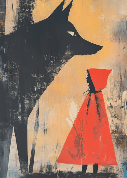 Låt dig förtrollas av Andreas Magnussons suggestiva tolkning av den klassiska sagan om Rödluvan. Denna unika affisch fångar Rödluvan och vargen i en mystisk och stämningsfull skogsmiljö. Konstverket balanserar lekfullhet med en mörkare, mer drömsk underton, vilket skapar en verkligt fängslande visuell upplevelse för alla som älskar sagornas värld.