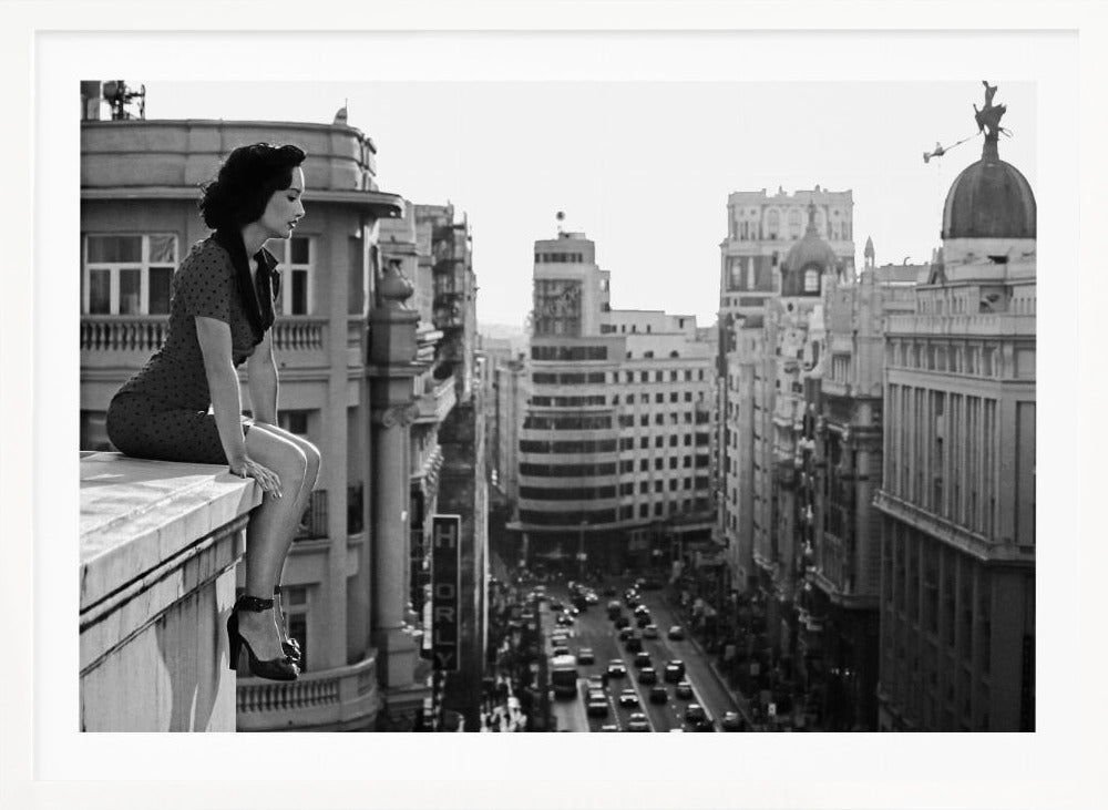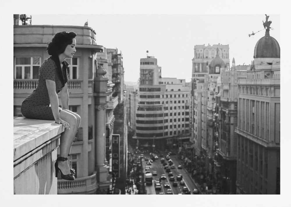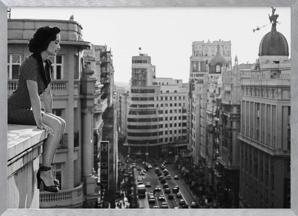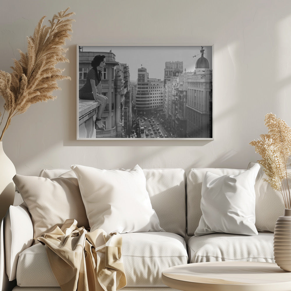 Dyk in i Madrids pulserande hjärta med Alejandro Marcos fängslande verk "Mad Madrid". Denna stilfulla poster fångar en kvinna elegant placerad på ett tak, blickandes ut över stadens myllrande gator och ikoniska arkitektur. Den tidlösa svartvita paletten och den retroinspirerade känslan från 1950-talet ger en sofistikerad nostalgi.