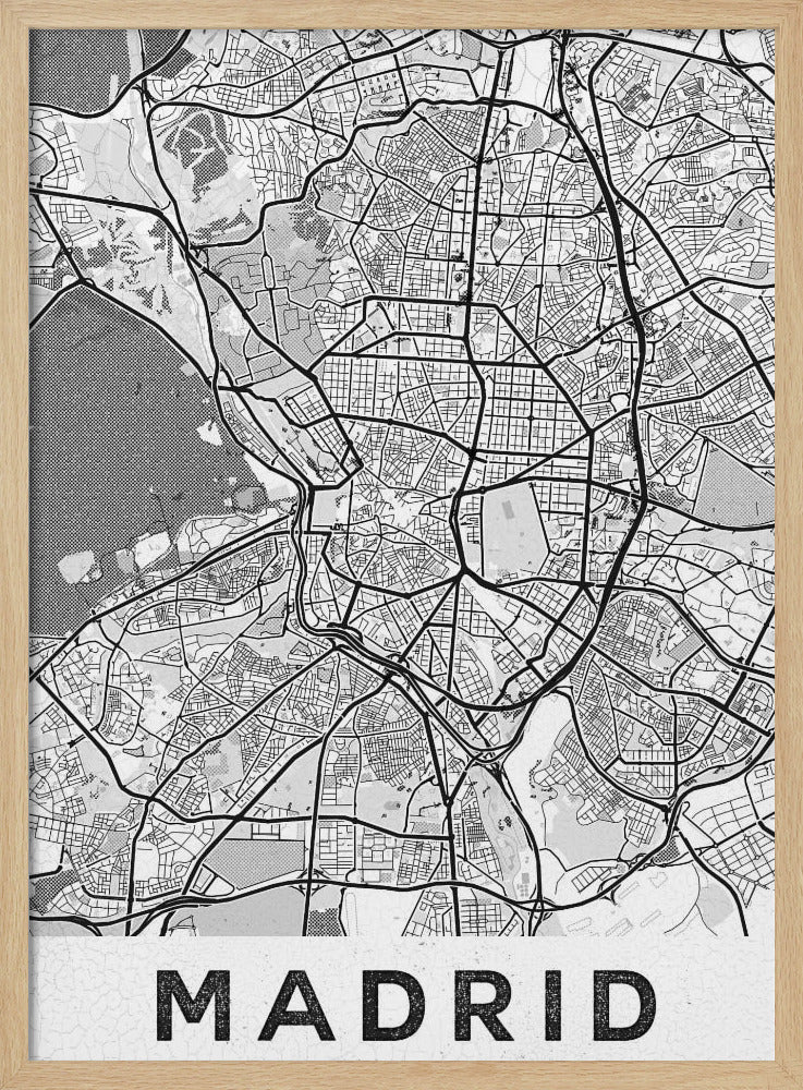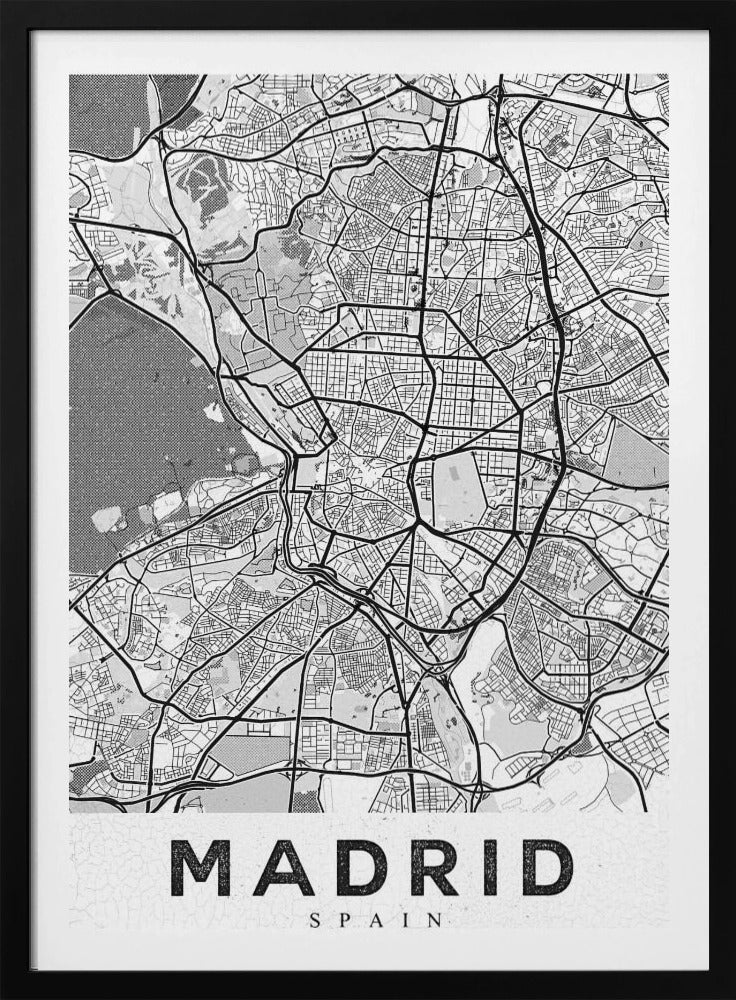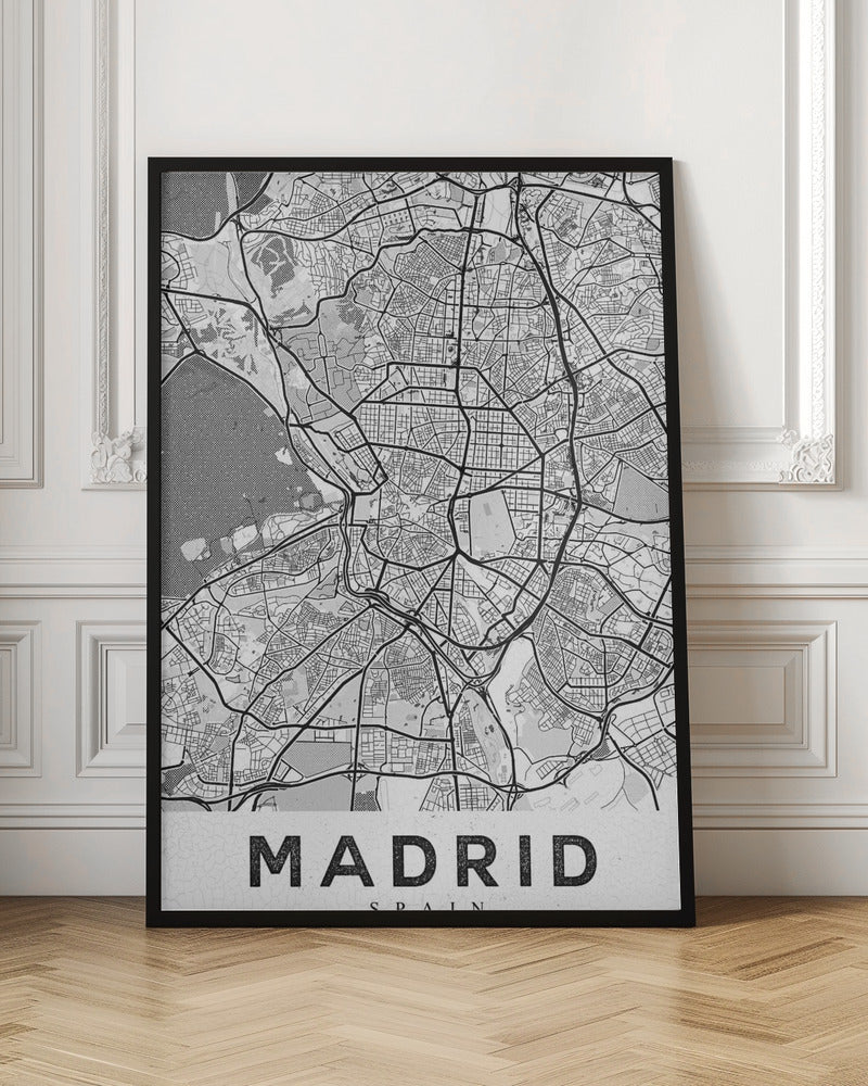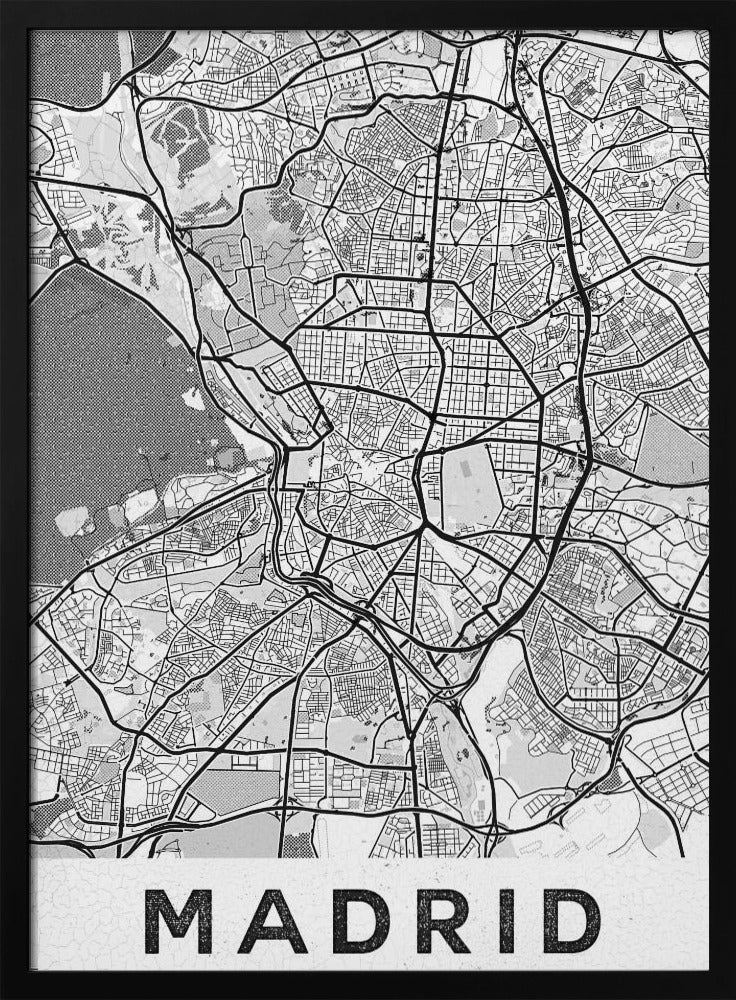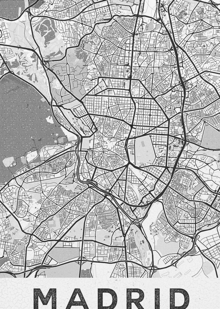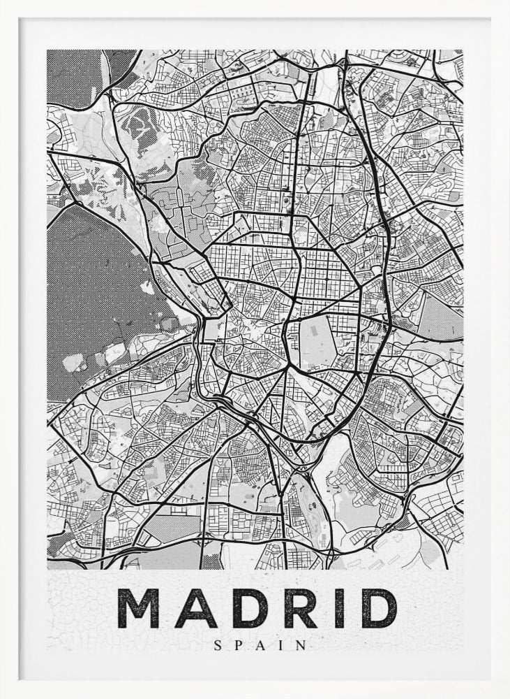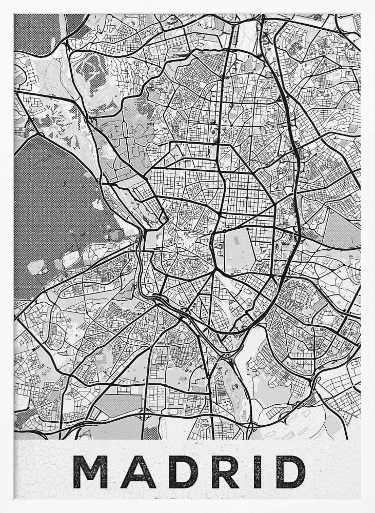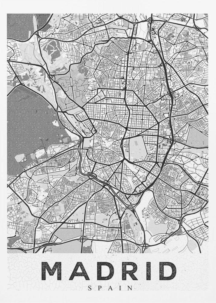 Denna fängslande affisch "Madrid White", skapad av StudioSix, hyllar den spanska huvudstaden med en minimalistisk och elegant design. Med sin stilrena typografi och abstrakta kartliknande textur fångar den essensen av Madrid i svartvitt. En perfekt detalj för att addera en touch av urban nostalgi och sofistikation till ditt hem, idealisk för den som älskar textbaserad konst och grafiska motiv.