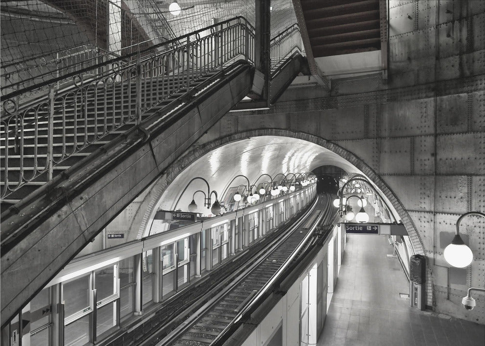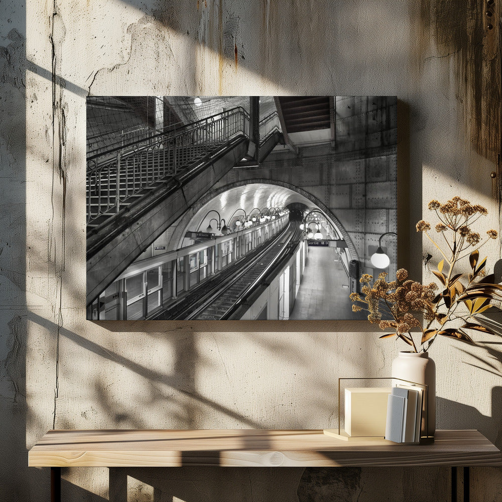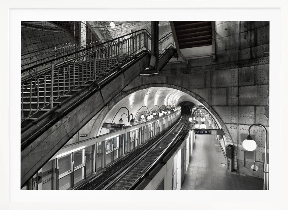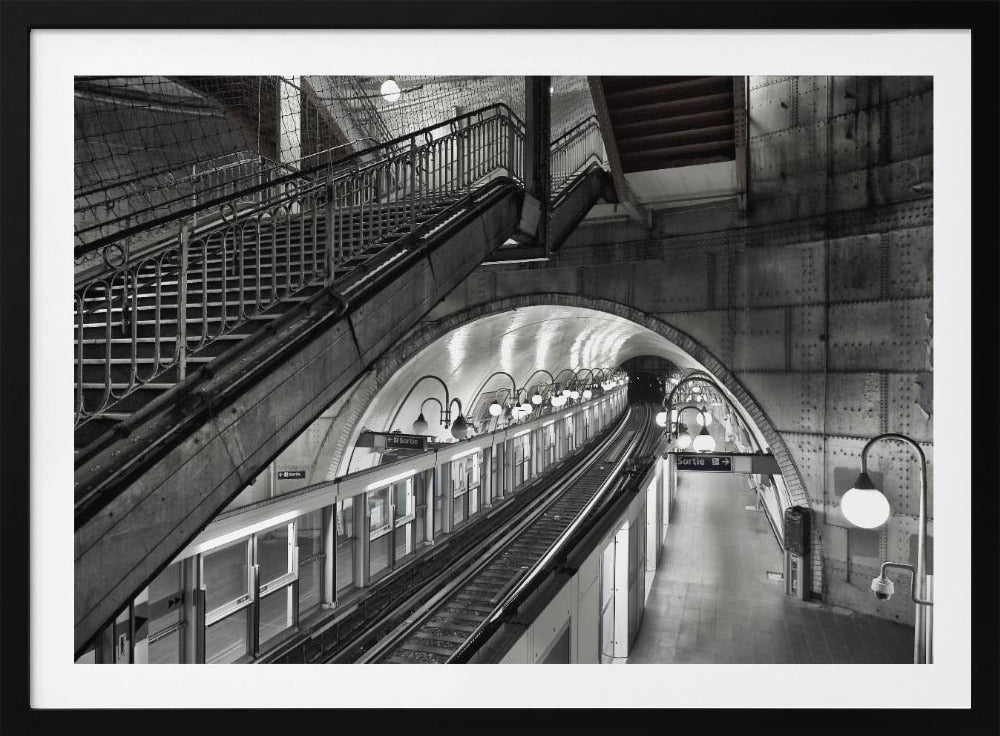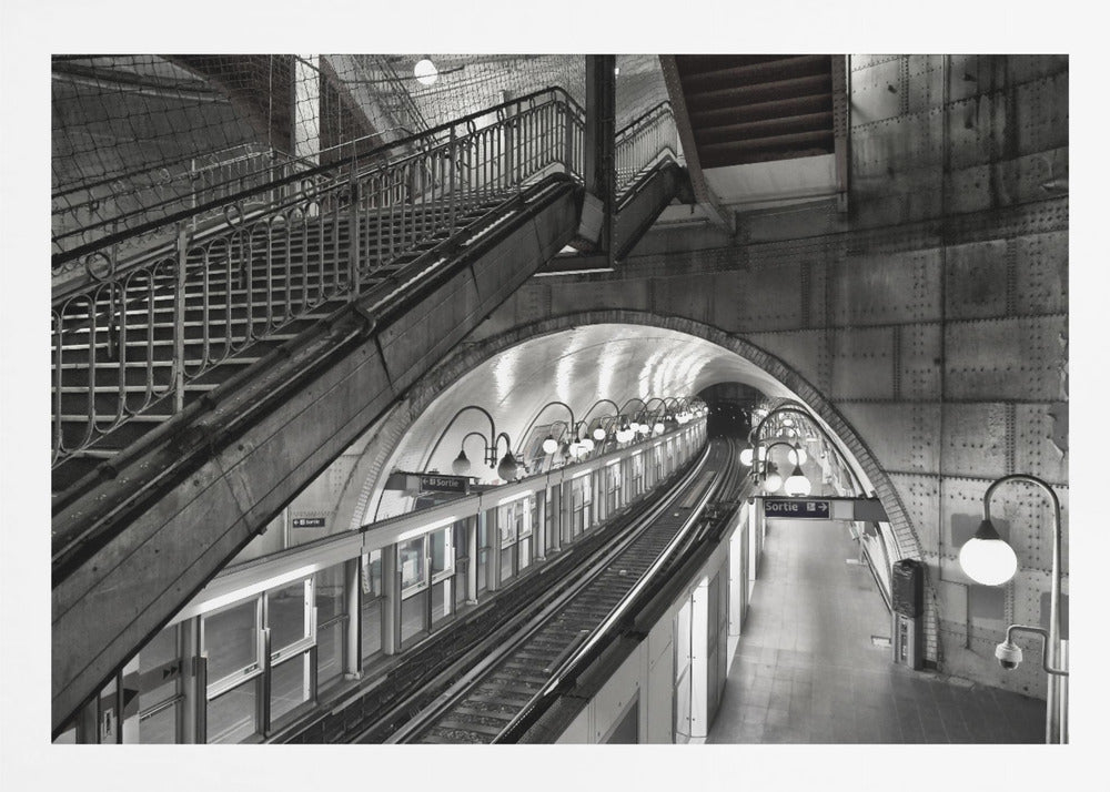 Renate Reichert fångar på detta konstverk skickligt atmosfären i Paris tunnelbanesystem. Denna affisch presenterar en fascinerande vy över en tunnelbanestation, där trappor leder ner i djupet. Den svartvita paletten förstärker arkitekturen och skapar en känsla av mystik och rörelse i denna ikoniska stad. Ett grafiskt mästerverk som passar alla hem.