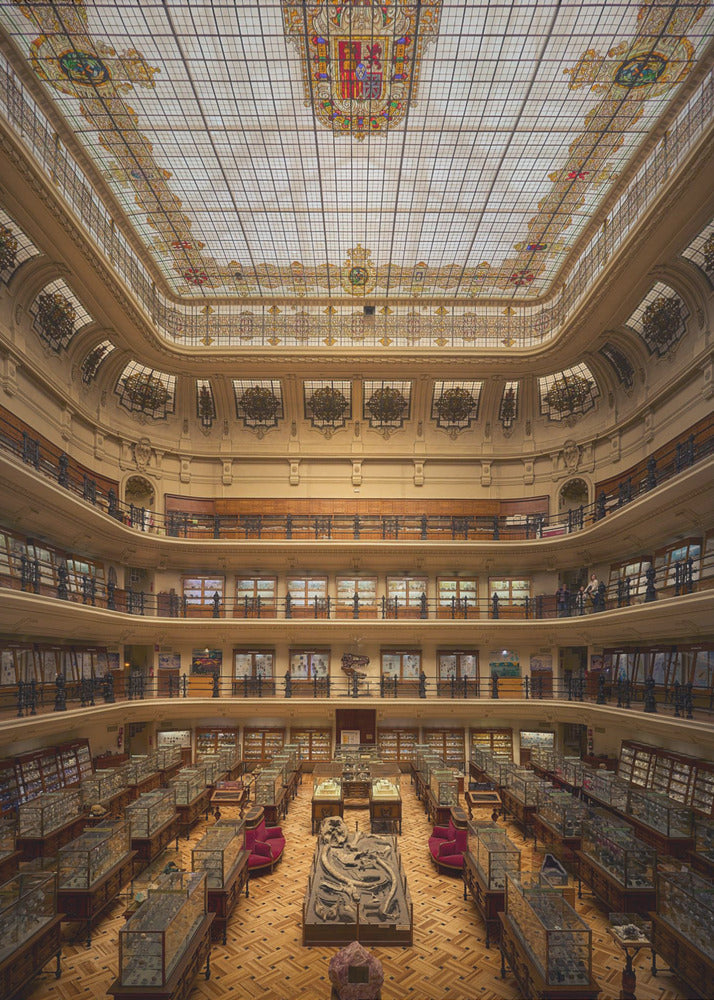 Denna fängslande poster, skapad av Carlos Hernández Martínez, fångar storheten i Museo Geominero i Madrid. Med sin imponerande vertikala komposition framhäver verket en fantastisk arkitektonisk symmetri som drar blicken uppåt.