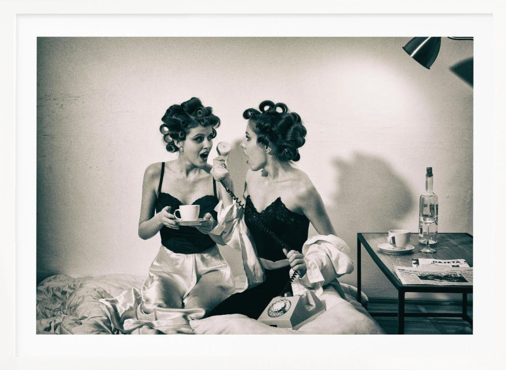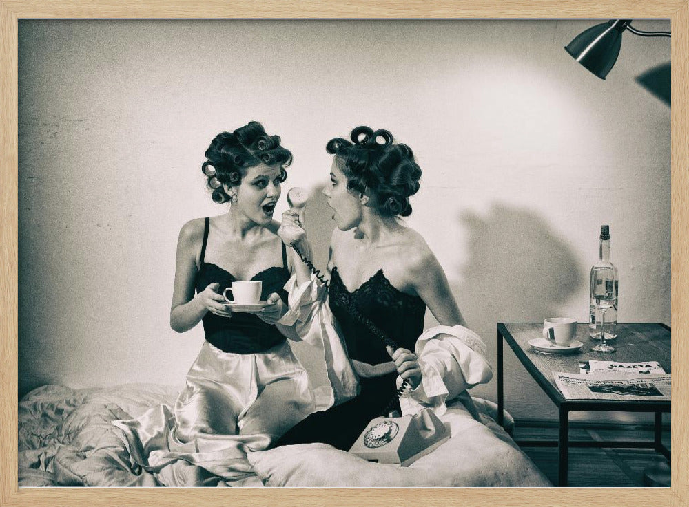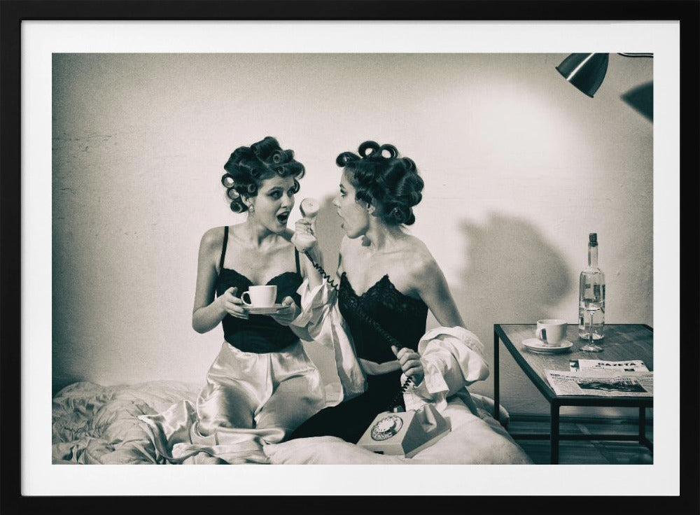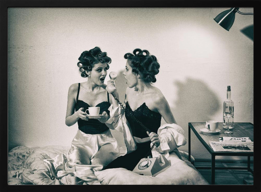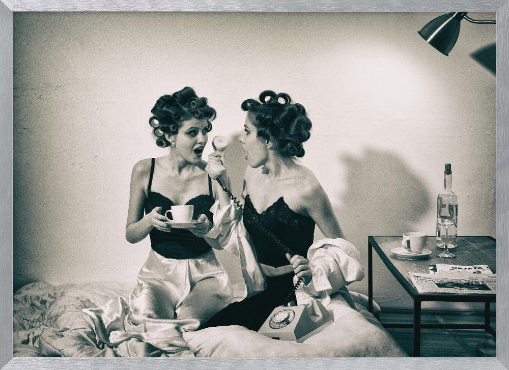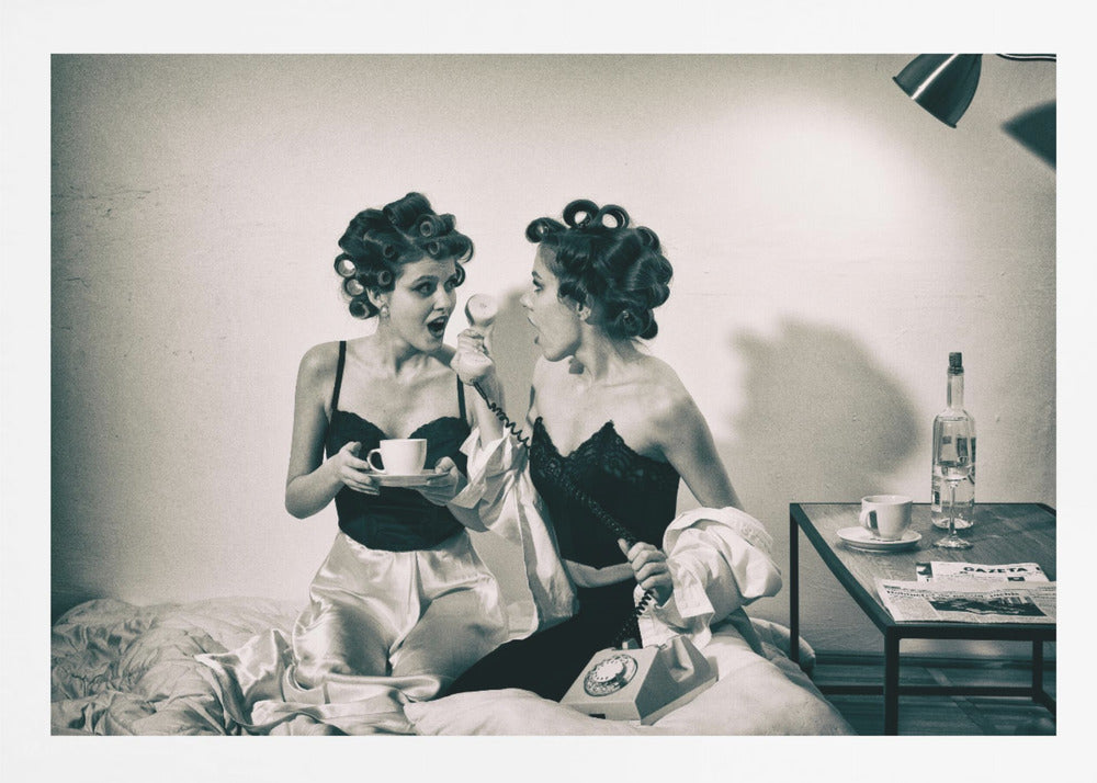 Fånga den tidiga morgonstundens lugn med denna atmosfäriska poster av Mihai Bogdan R. Bilden, med sin starka känsla av retro och tidlös elegans, porträtterar en kvinna försjunken i sin egen värld. Ett tidningsuppslag och en kopp kaffe indikerar startskottet på en ny dag, medan telefonen antyder en oväntad nyhet eller ett samtal. Den svartvita paletten förstärker det klassiska uttrycket.