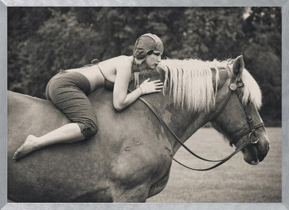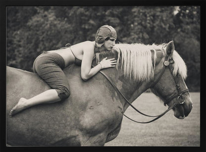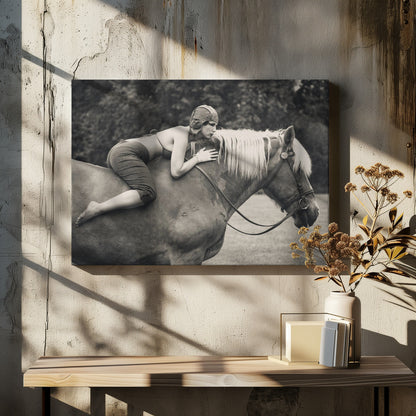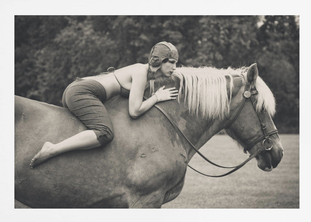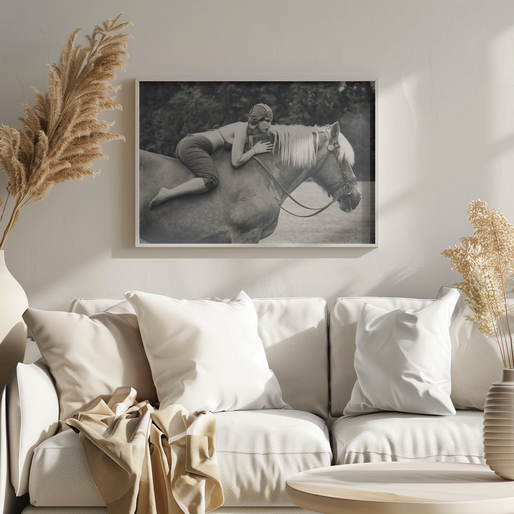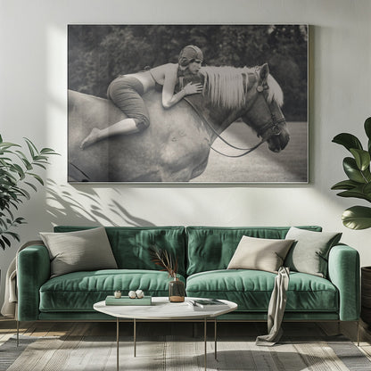 Fånga den dynamiska energin från galoppbanan med denna slående poster, "Off to the Races", skapad av JAE. Verket är en hyllning till den klassiska ridsporten, med en figurativ stil och varma, tonade sepiatoner som ger en tidlös och dramatisk känsla. Den fångar perfekt spänningen och elegansen hos både ryttare och häst i full fart, vilket gör den till ett unikt konstverk för varje vägg.