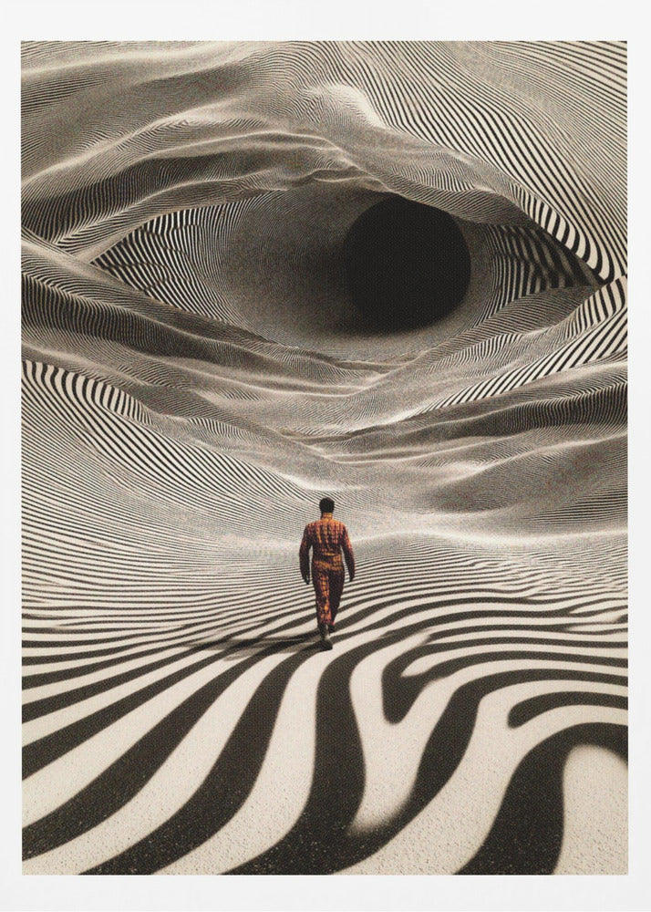 Kliv in i Taudalpois fascinerande värld med "Op Art Journey", en konstposter som förvandlar landskapet till en hypnotisk syn. Denna kreativa redigering kombinerar en majestätisk zebra med ökenlandskap och sanddyner, vilket skapar en fängslande optisk illusion i svartvitt. En psykedelisk upplevelse för väggen.