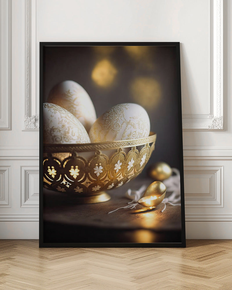 Låt dig förtrollas av Treechilds utsmyckade ägg – en lyxig poster som fångar påskens magi med en tidlös stillhet. Detta konsttryck framhäver gyllene, intrikat dekorerade ägg i en elegant skål, perfekt för att addera en känsla av tradition och rikedom till ditt kök eller vardagsrum. En sann hyllning till fest och firande.
