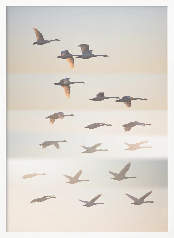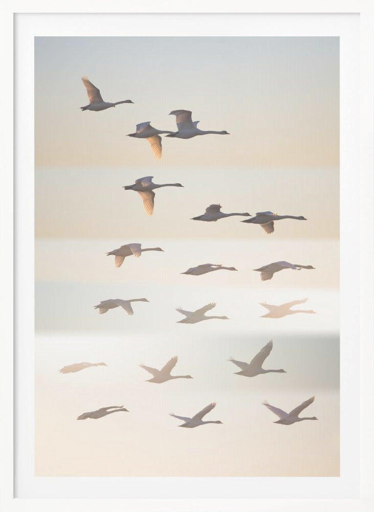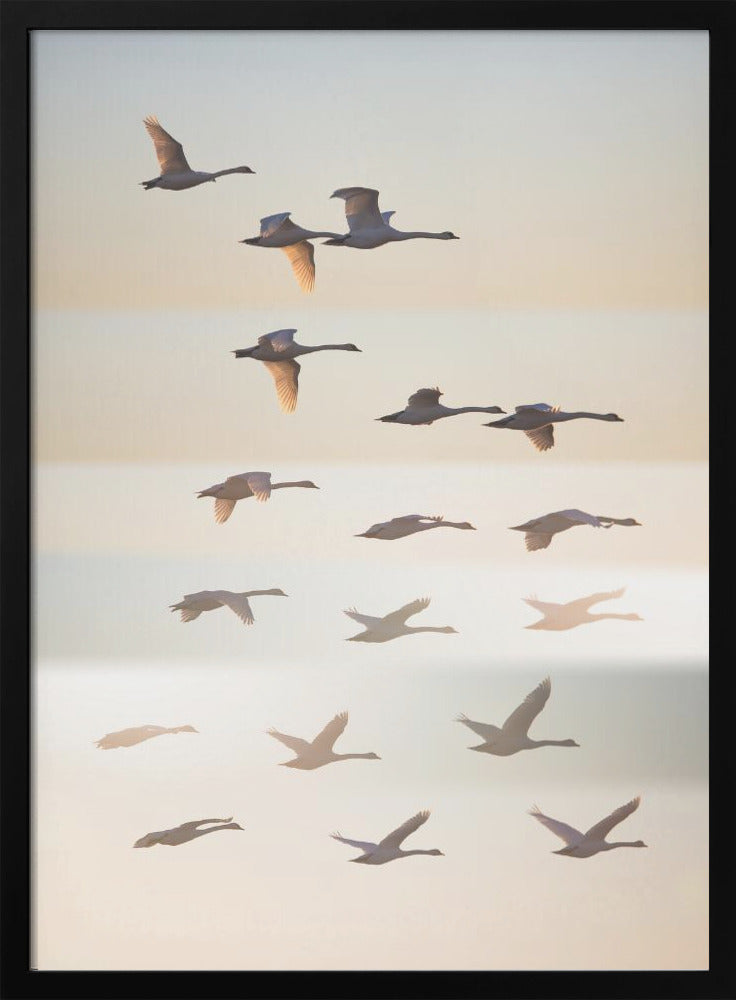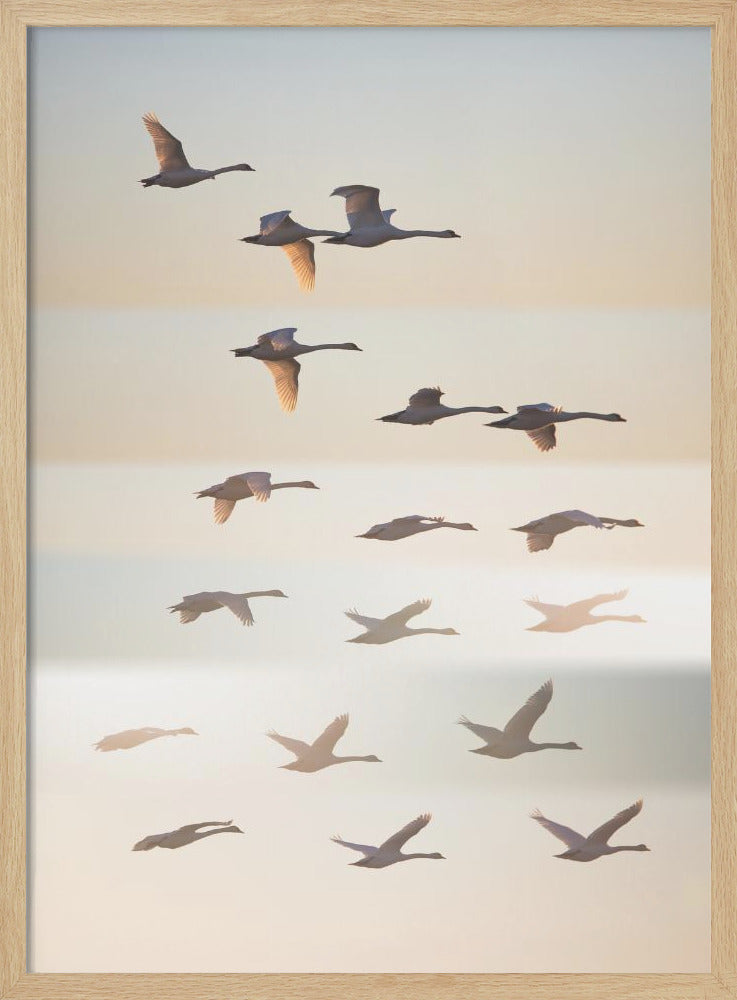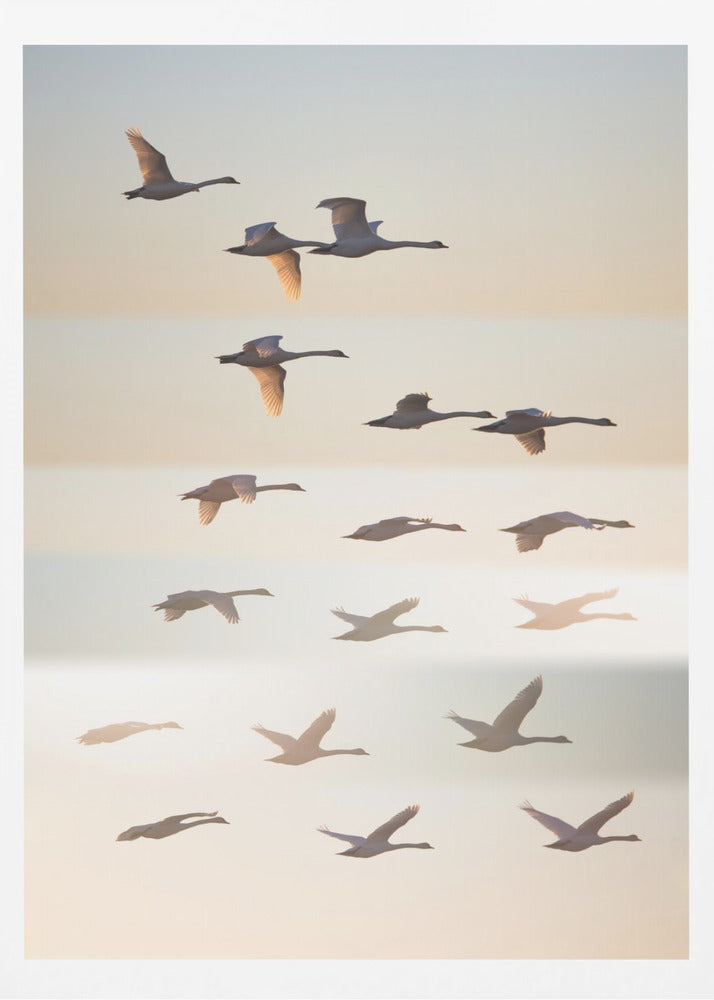 Denna fascinerande poster av Leif Løndal fångar ögonblicket då svanar majestätiskt sträcker sig mot den nedgående solen. Verket, "Past the sun.", utstrålar en känsla av lugn och rörelse. Den grafiska stilen och den dynamiska kompositionen med fåglarnas formation mot den ljusa himlen skapar en tidlös bild av naturens skönhet och den ständiga resan.