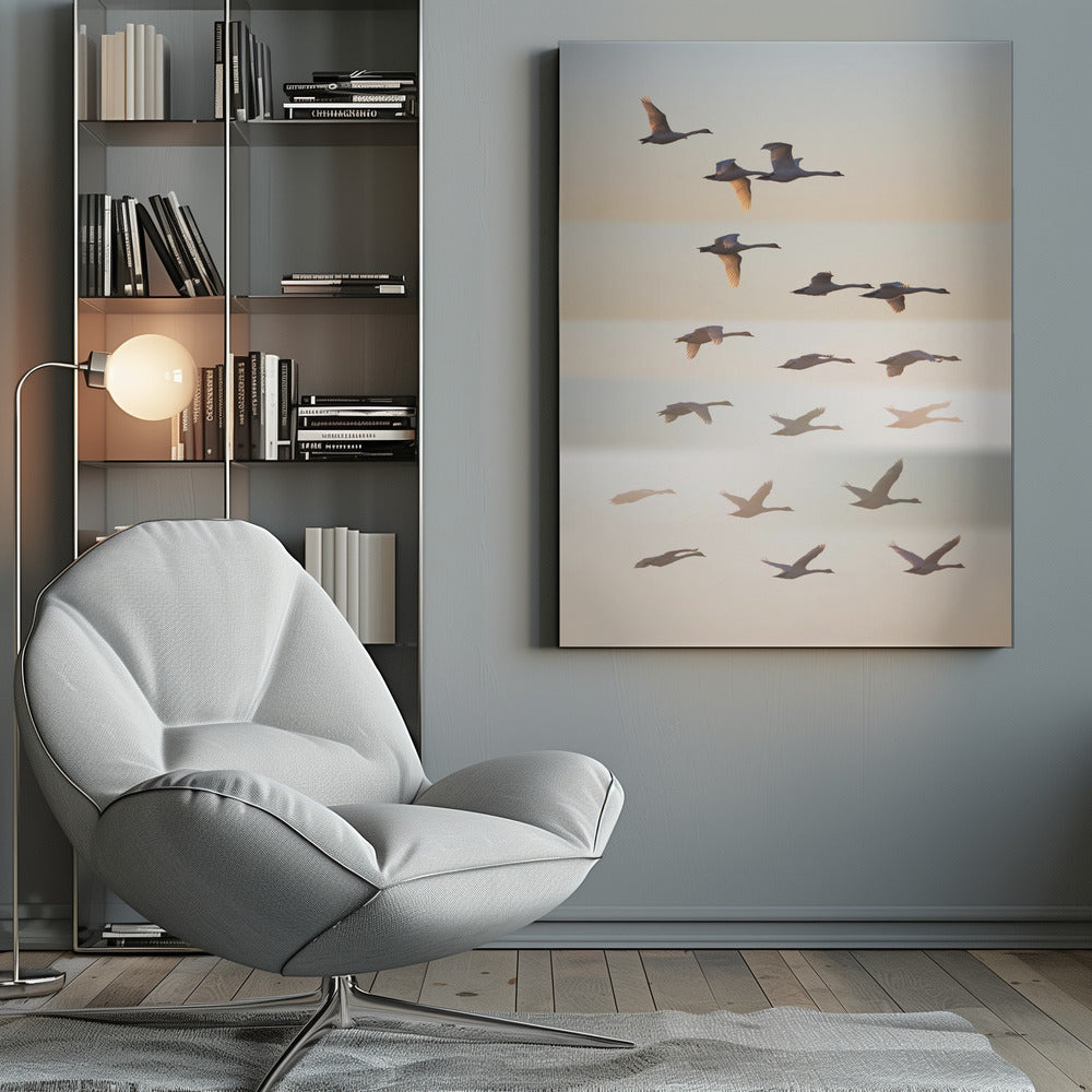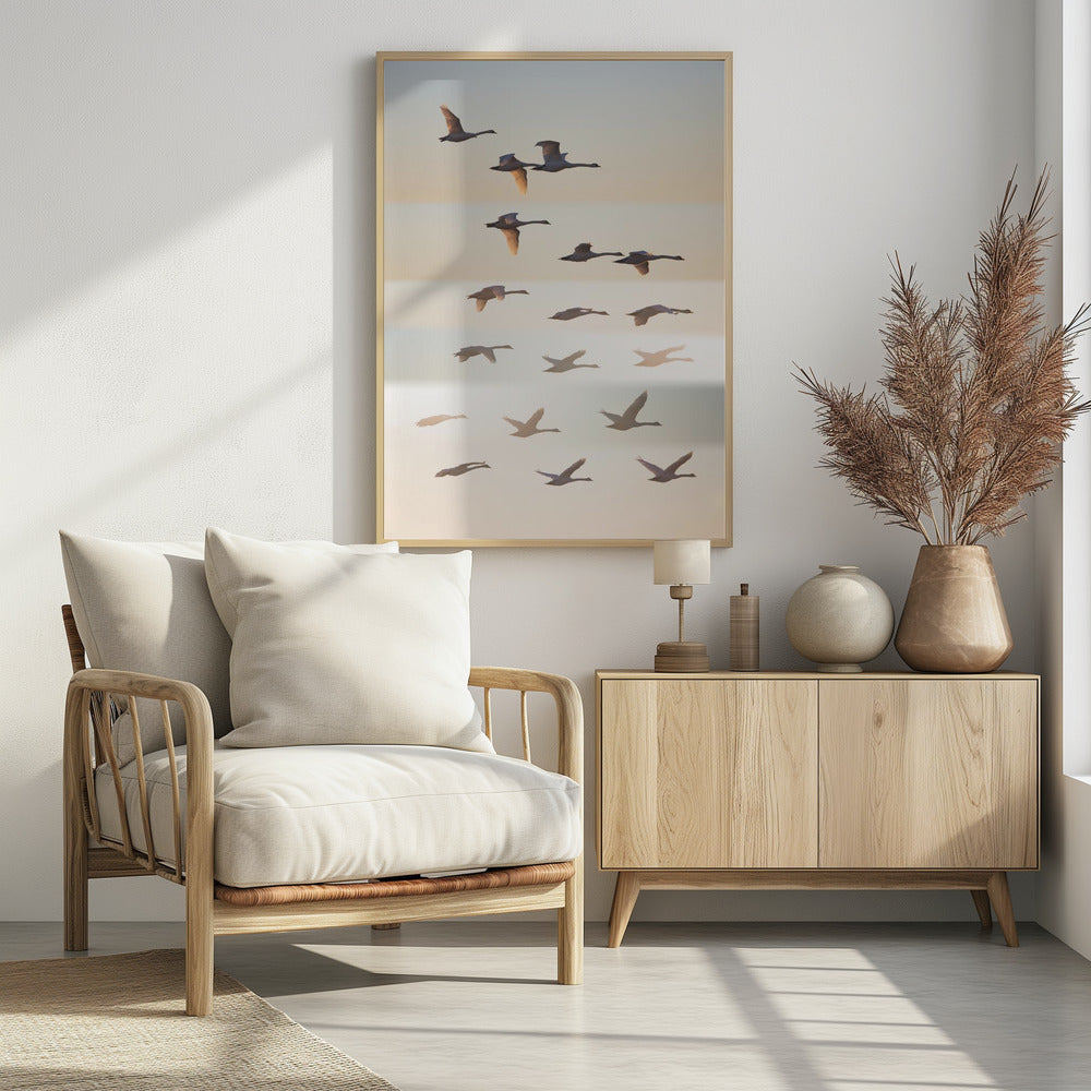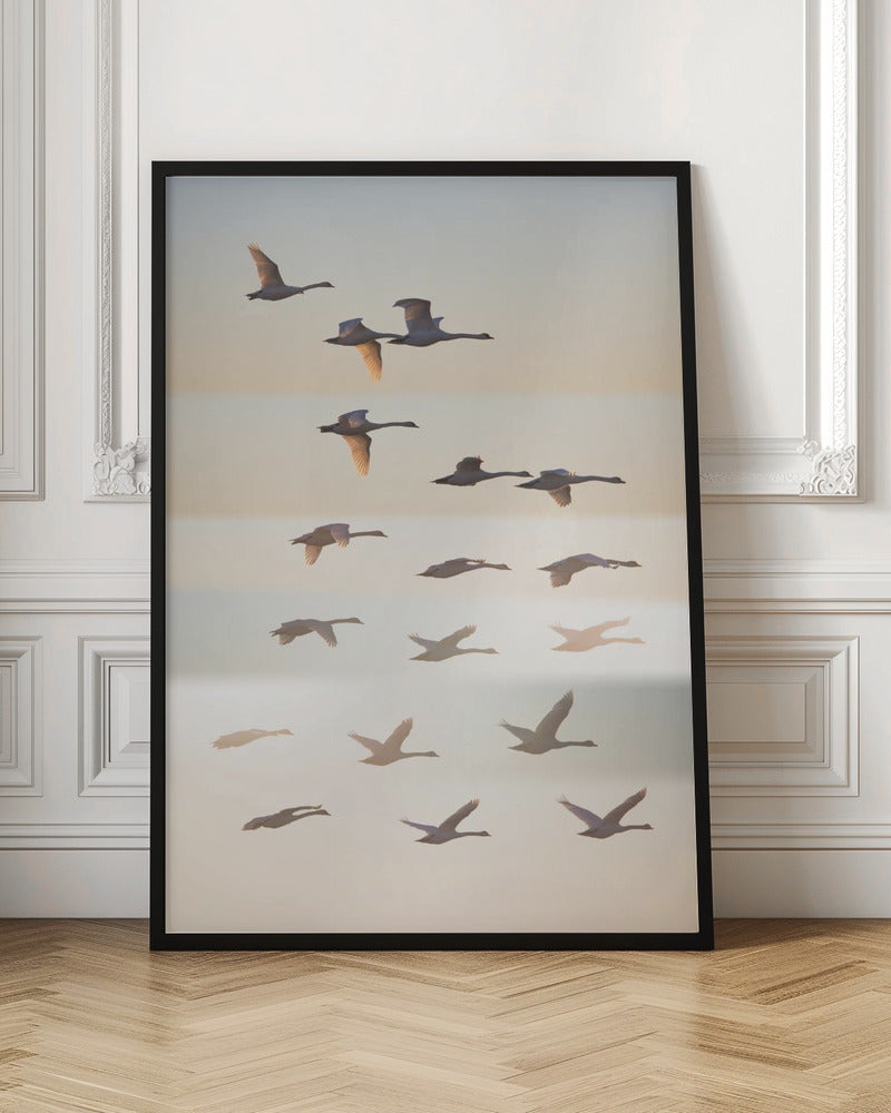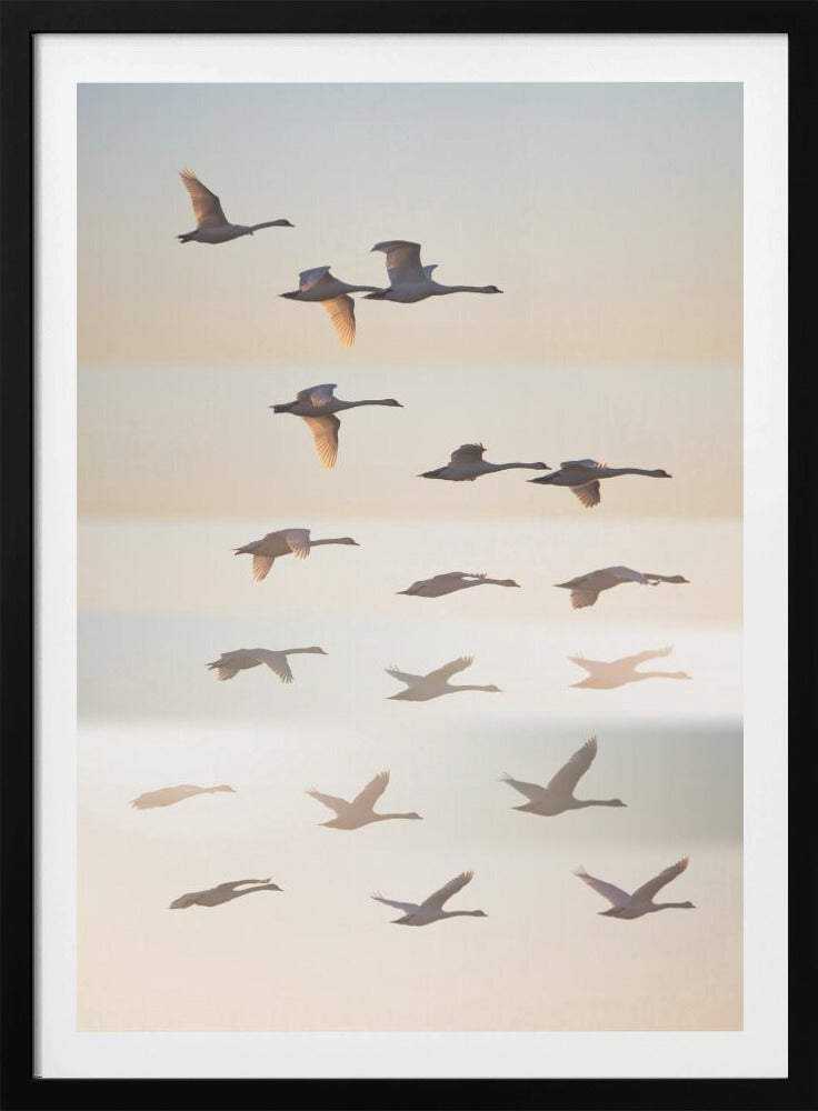 Denna fascinerande poster av Leif Løndal fångar ögonblicket då svanar majestätiskt sträcker sig mot den nedgående solen. Verket, "Past the sun.", utstrålar en känsla av lugn och rörelse. Den grafiska stilen och den dynamiska kompositionen med fåglarnas formation mot den ljusa himlen skapar en tidlös bild av naturens skönhet och den ständiga resan.