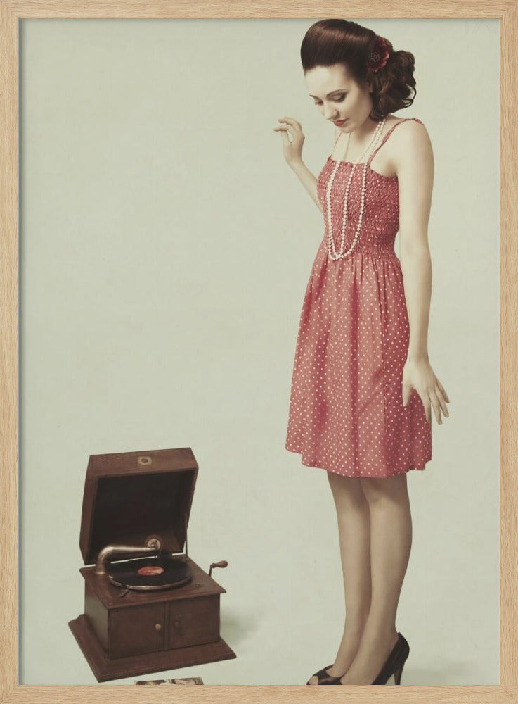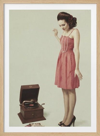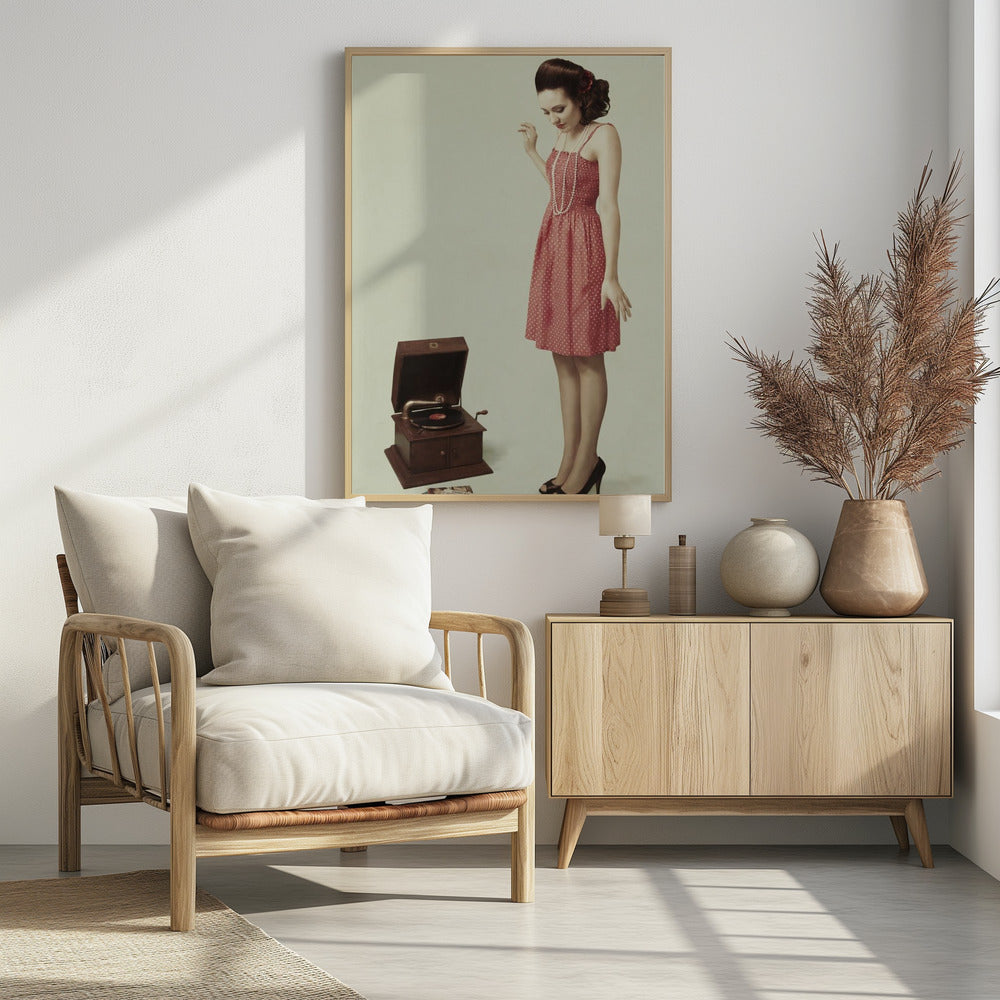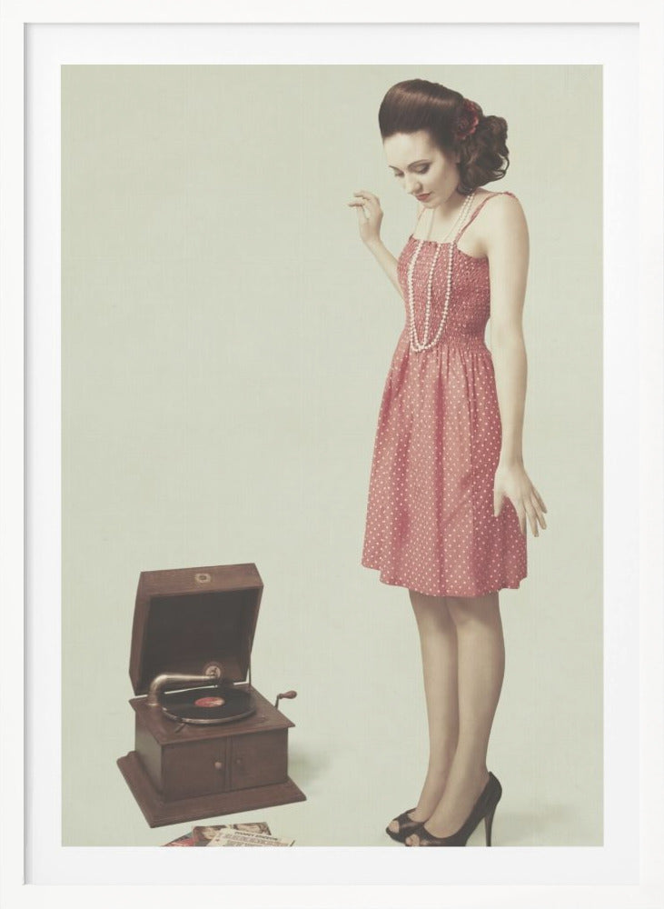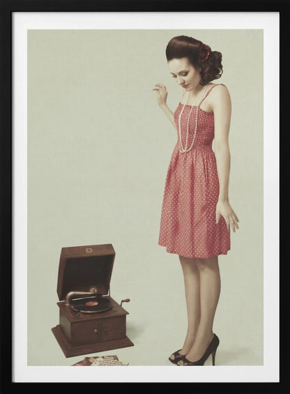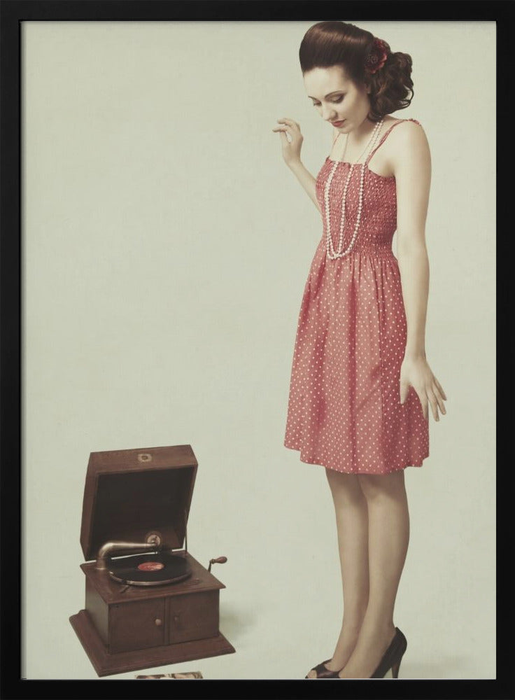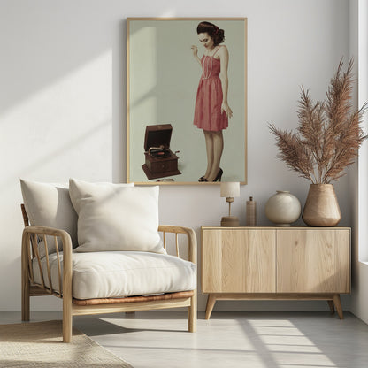 Denna klassiska poster, "Pin Up Girl III" av konstnären Bart Peeters, fångar en tidlös charm med sin retroinspirerade design. En elegant kvinna i röd klänning poserar vid en vintage grammofon, utstrålande både skönhet och nostalgi. Färgerna är levande och detaljerna skarpa, vilket gör detta till ett perfekt konstverk för alla som älskar vintage och pinup-stil.