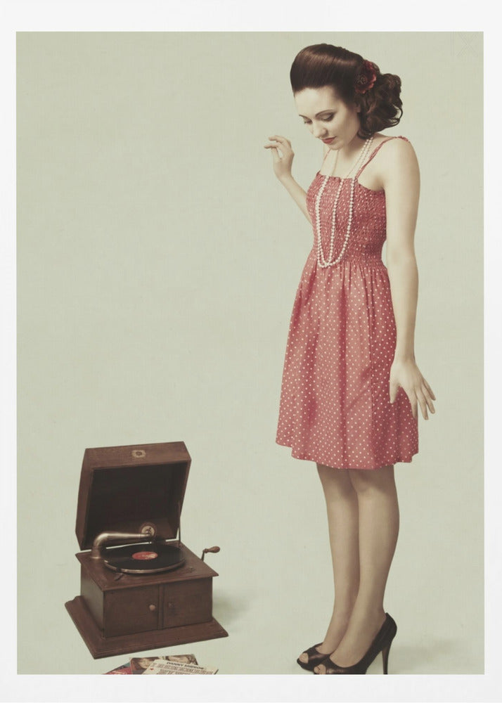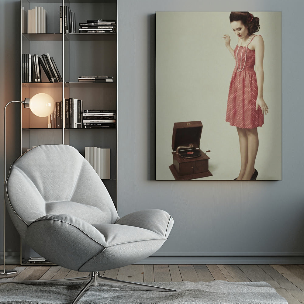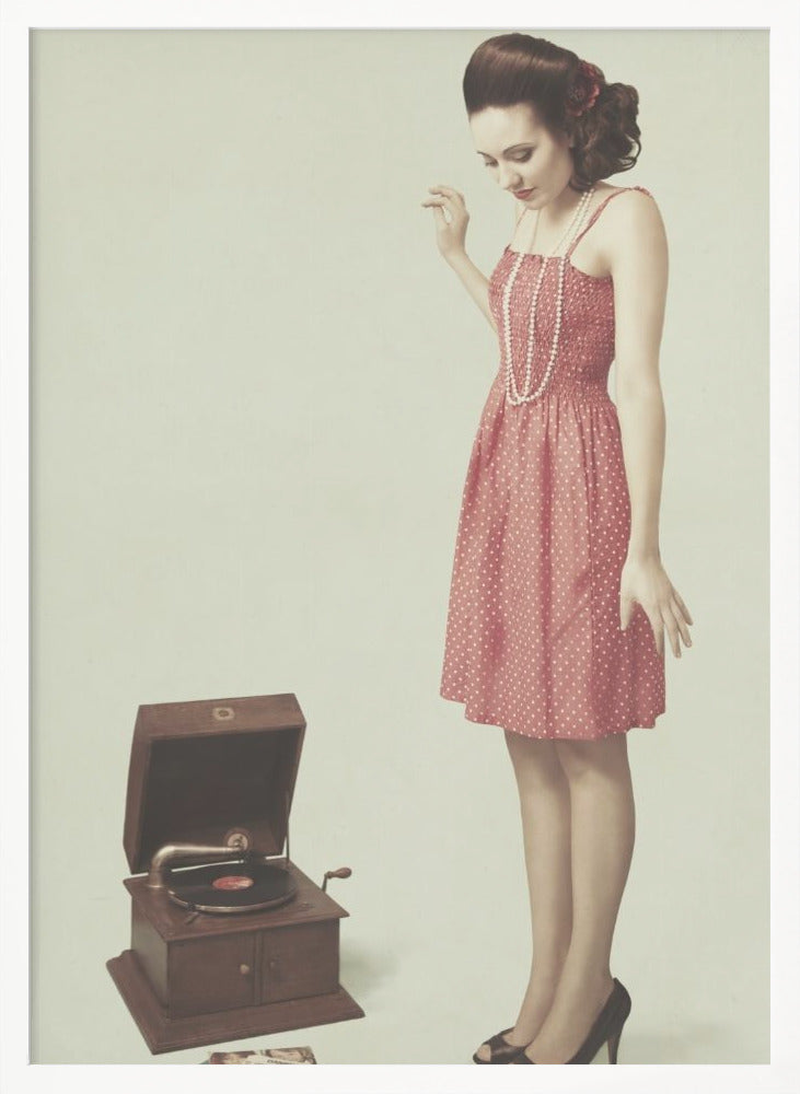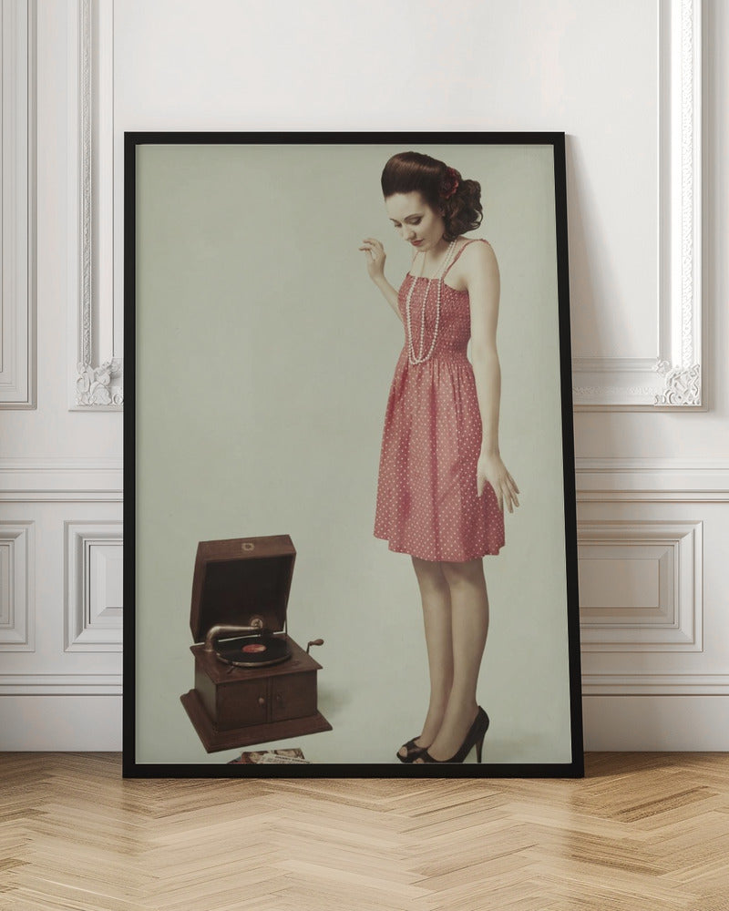 Denna klassiska poster, "Pin Up Girl III" av konstnären Bart Peeters, fångar en tidlös charm med sin retroinspirerade design. En elegant kvinna i röd klänning poserar vid en vintage grammofon, utstrålande både skönhet och nostalgi. Färgerna är levande och detaljerna skarpa, vilket gör detta till ett perfekt konstverk för alla som älskar vintage och pinup-stil.