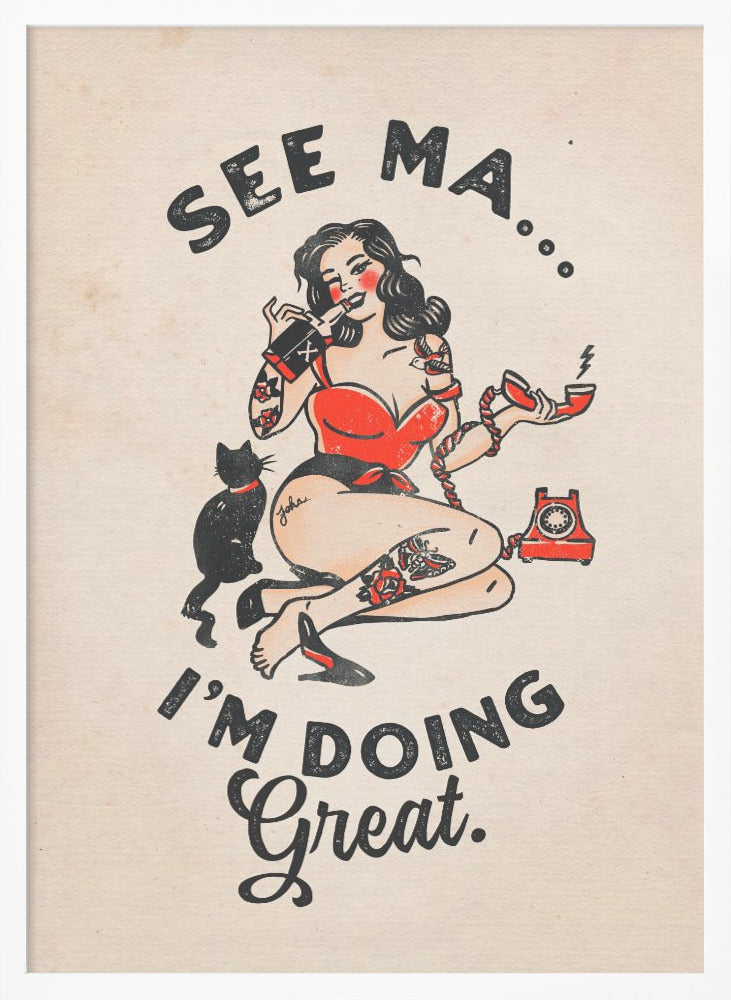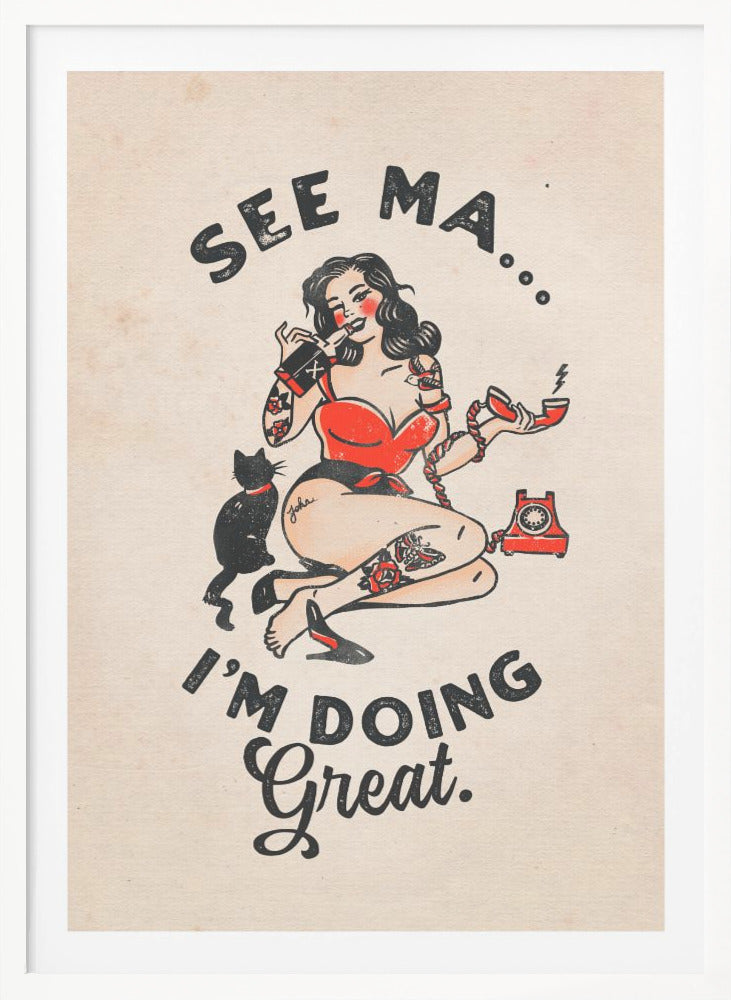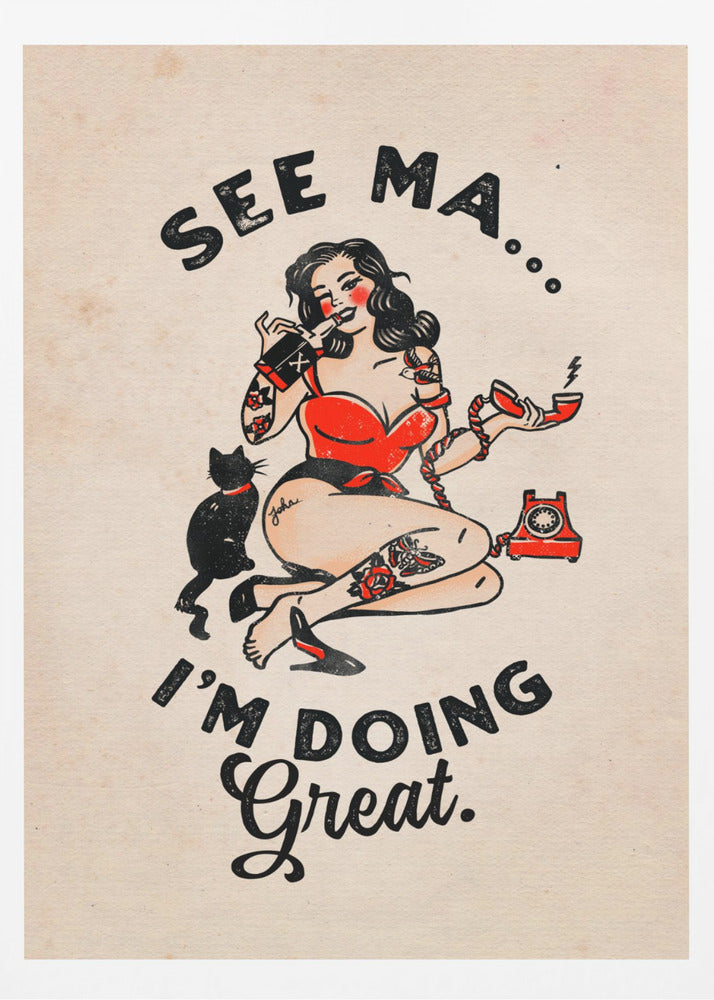 Se dig mätt på denna humoristiska "See Ma" poster från The Whiskey Ginger, en rolig och fräckig tolkning av den klassiska pinup-konsten. Denna unika vintageinspirerade illustration med en lekfull katt och sarkastisk text kombinerar humor med en distinkt grafisk stil som sticker ut. En perfekt tavla för den som älskar retrotecknad konst med en twist och unika detaljer.