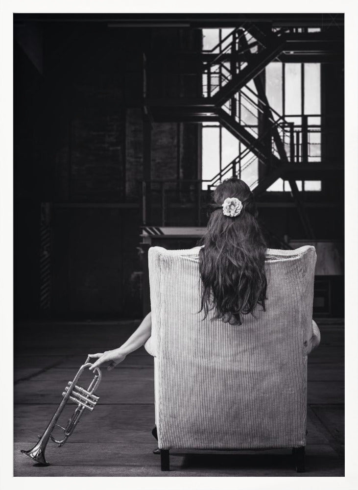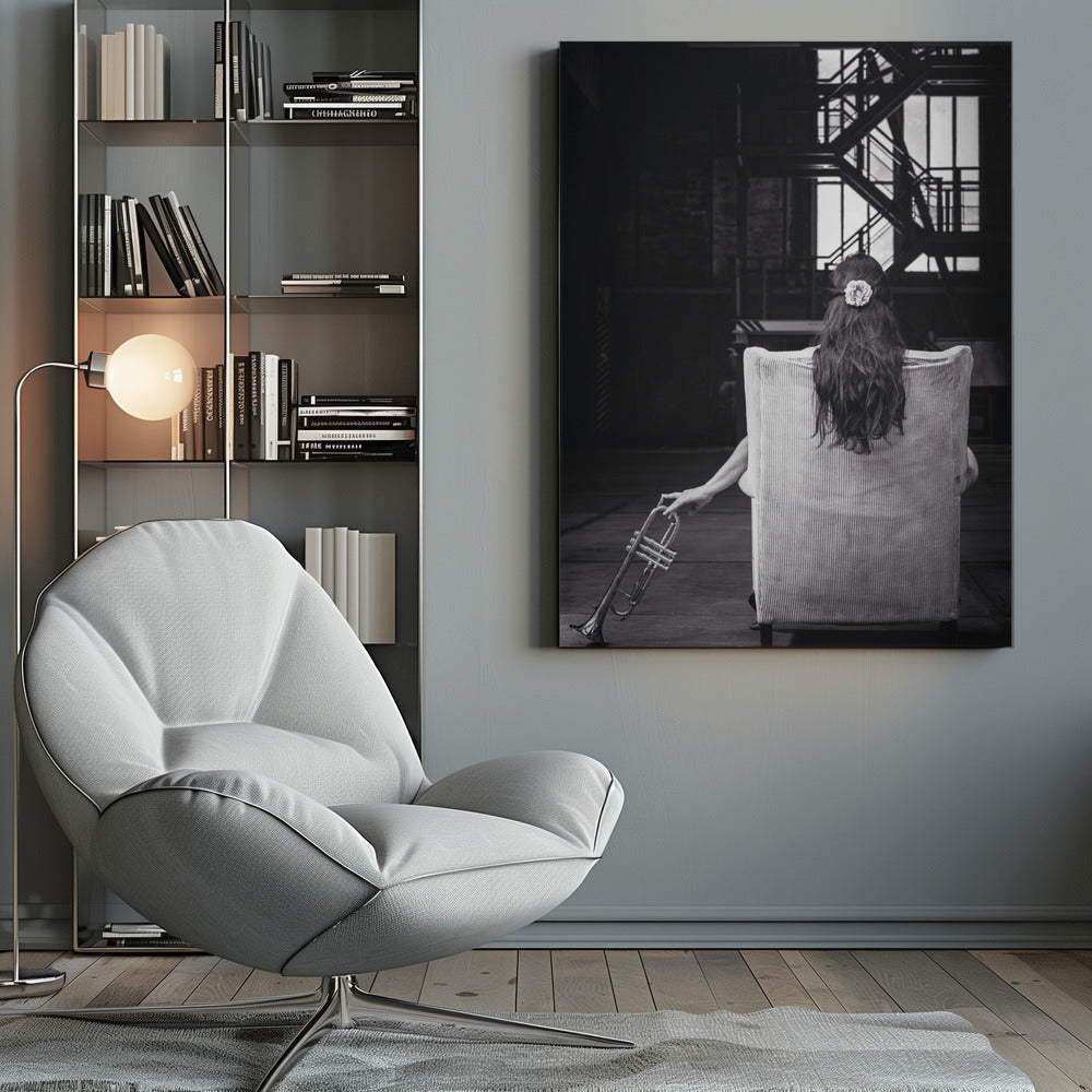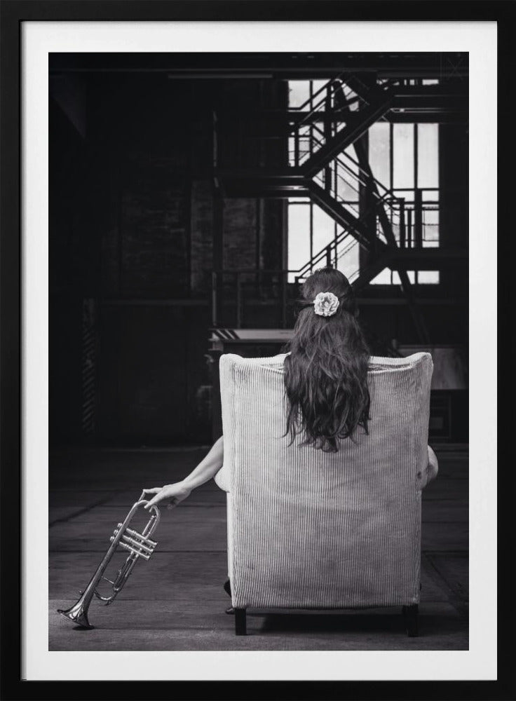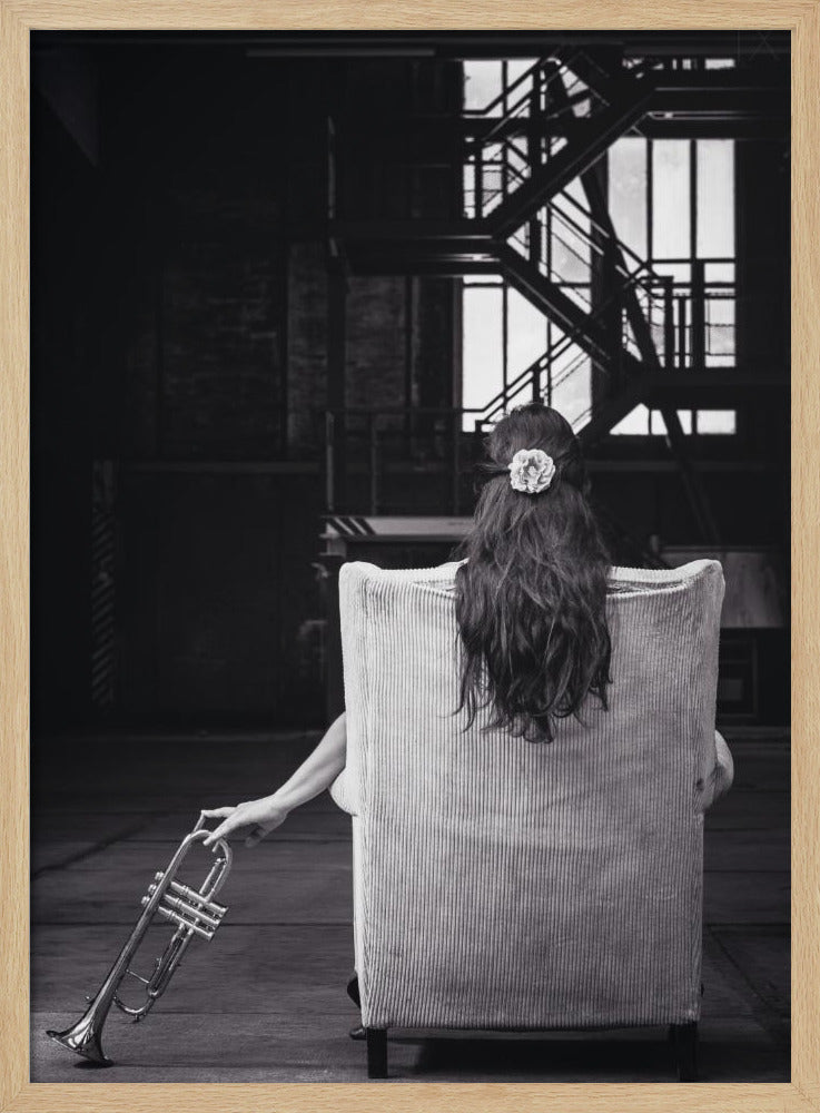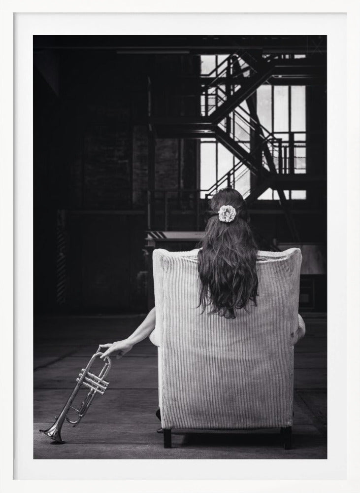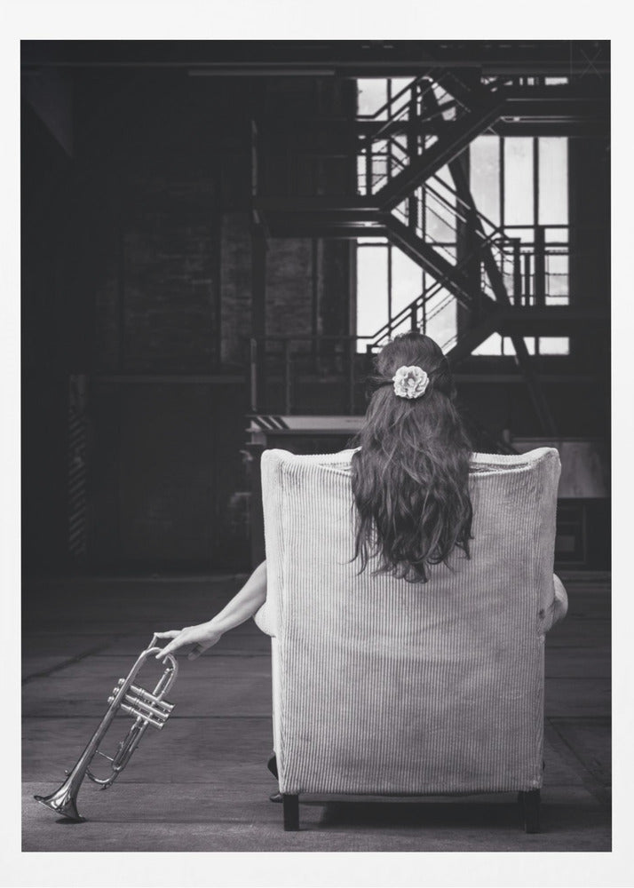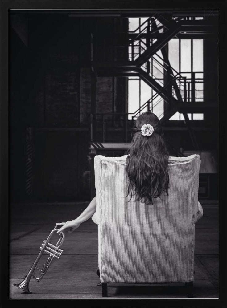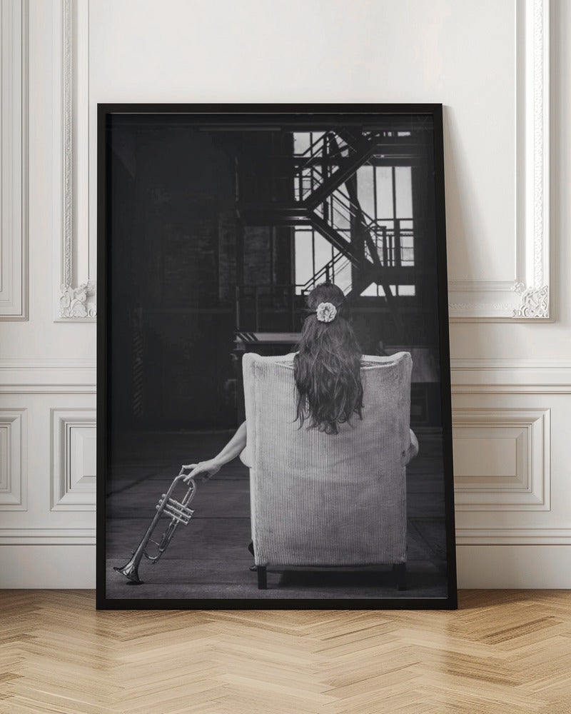 Denna fängslande poster, "Sentimental sounds", av Padurariu Alexandru, fångar essensen av melankolisk skönhet i svartvitt. Bilden visar en kvinna försjunken i musik, med en trumpet vilande nära henne, omgiven av en diskret blomstrande miljö. Det monokroma utförandet förstärker känslan av tidlöshet och djup, vilket gör den till ett perfekt tillskott för den som uppskattar konst med själ och stämning.
