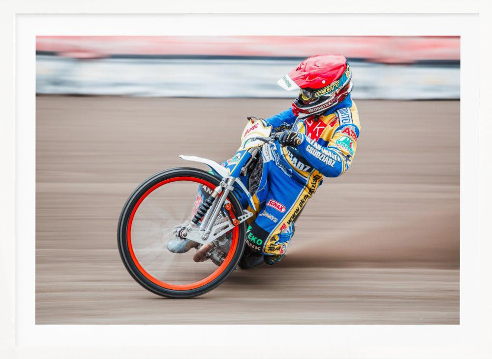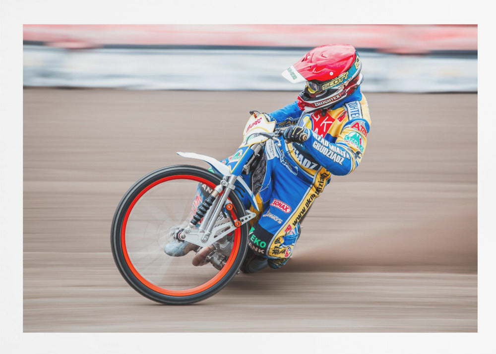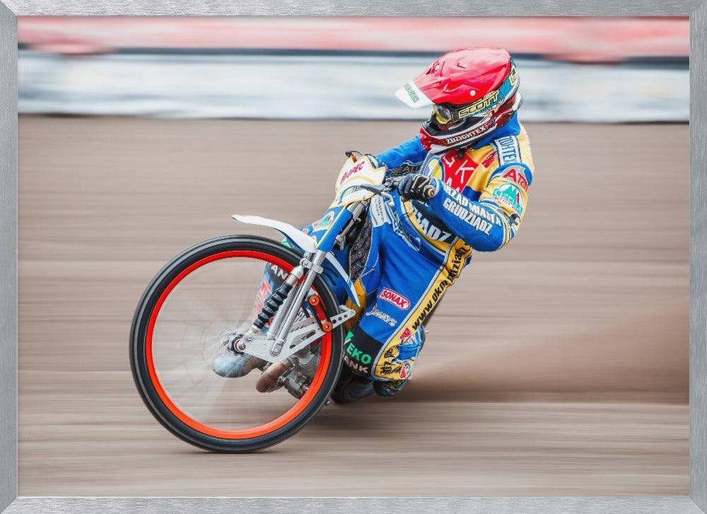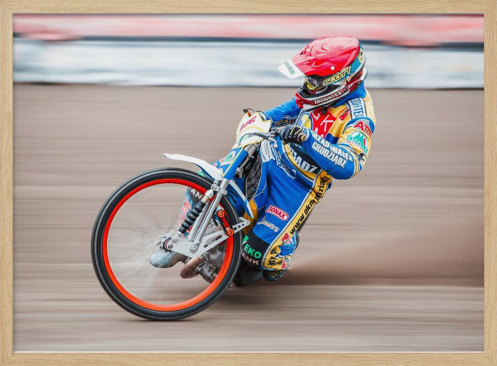 Dyk ner i den actionfyllda världen skildrad av konstnären Wojciech Łączkowski med denna fängslande Speedway poster. Trycket fångar den råa energin och spänningen från motorsporten med en imponerande känsla för rörelse och hastighet. Se hur smuts sprutar och motorcyklarna susar förbi, perfekt för motorsportentusiaster som älskar snabba tävlingar och adrenalinfyllda ögonblick.