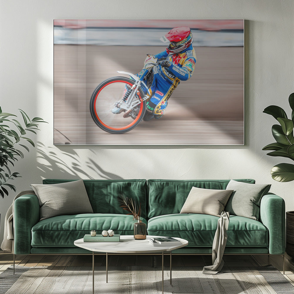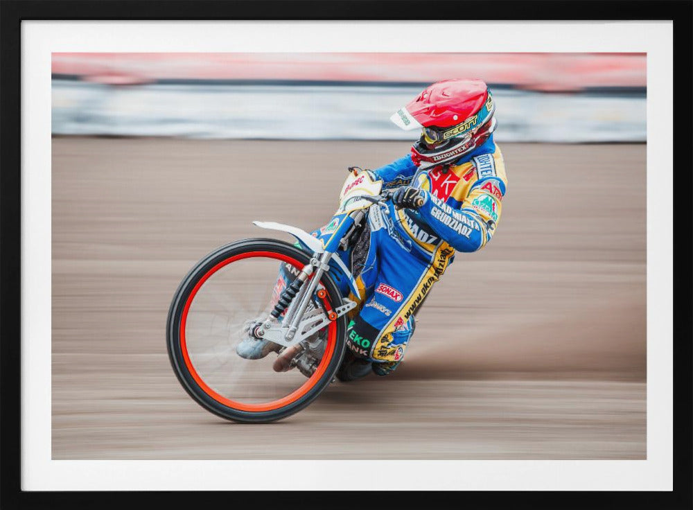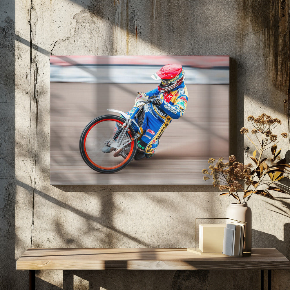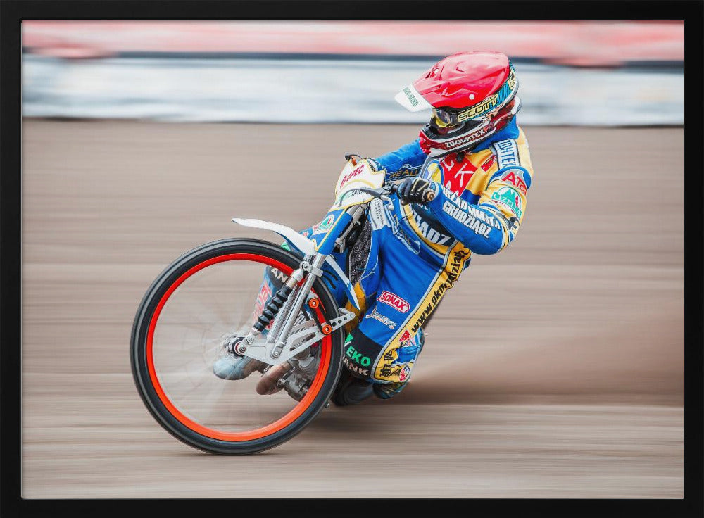 Dyk ner i den actionfyllda världen skildrad av konstnären Wojciech Łączkowski med denna fängslande Speedway poster. Trycket fångar den råa energin och spänningen från motorsporten med en imponerande känsla för rörelse och hastighet. Se hur smuts sprutar och motorcyklarna susar förbi, perfekt för motorsportentusiaster som älskar snabba tävlingar och adrenalinfyllda ögonblick.