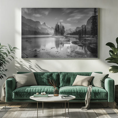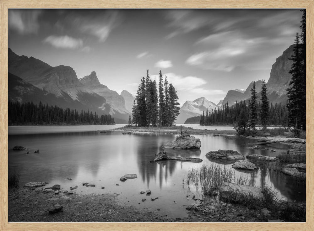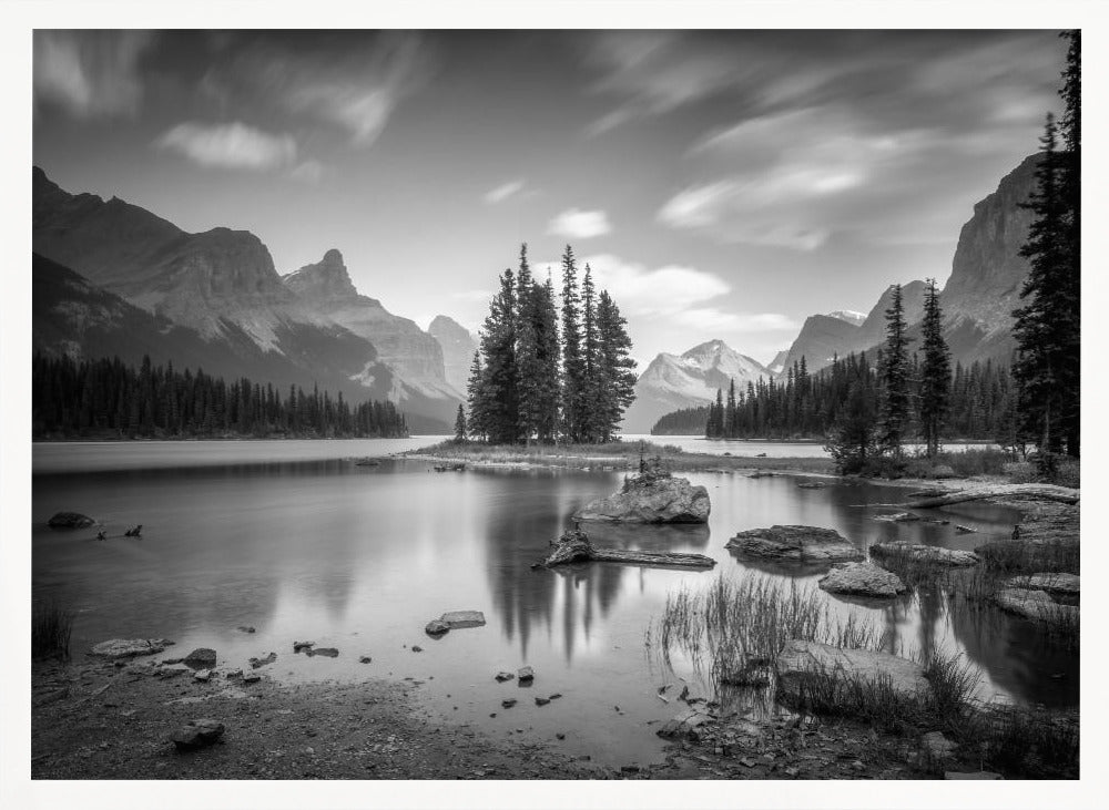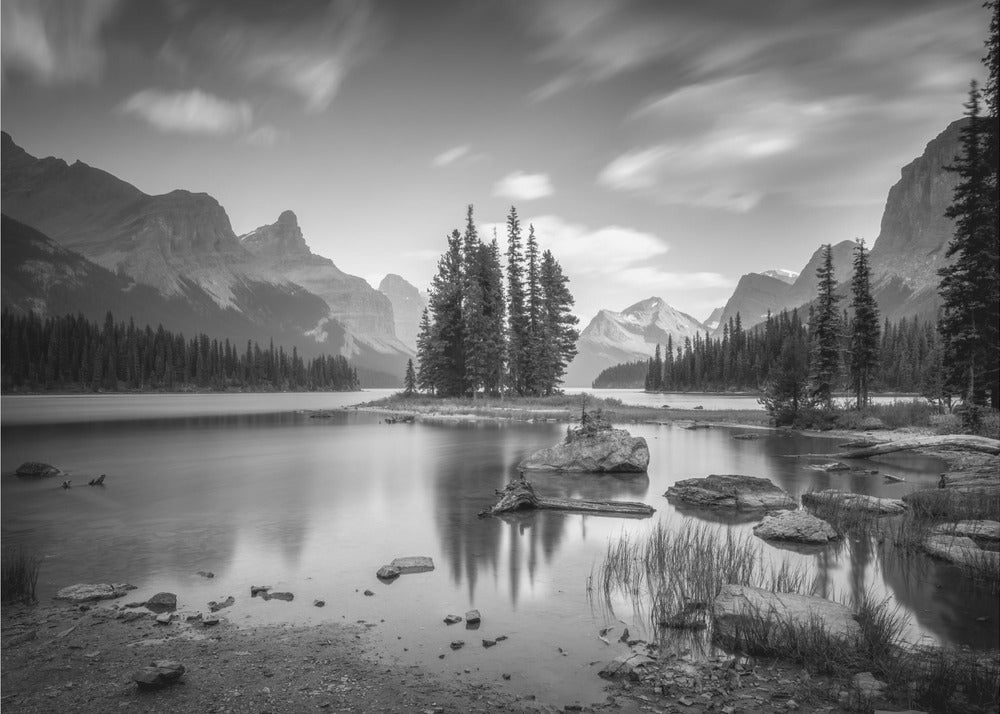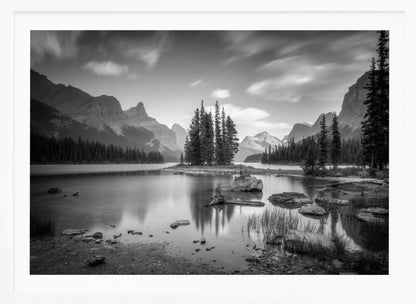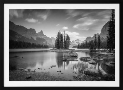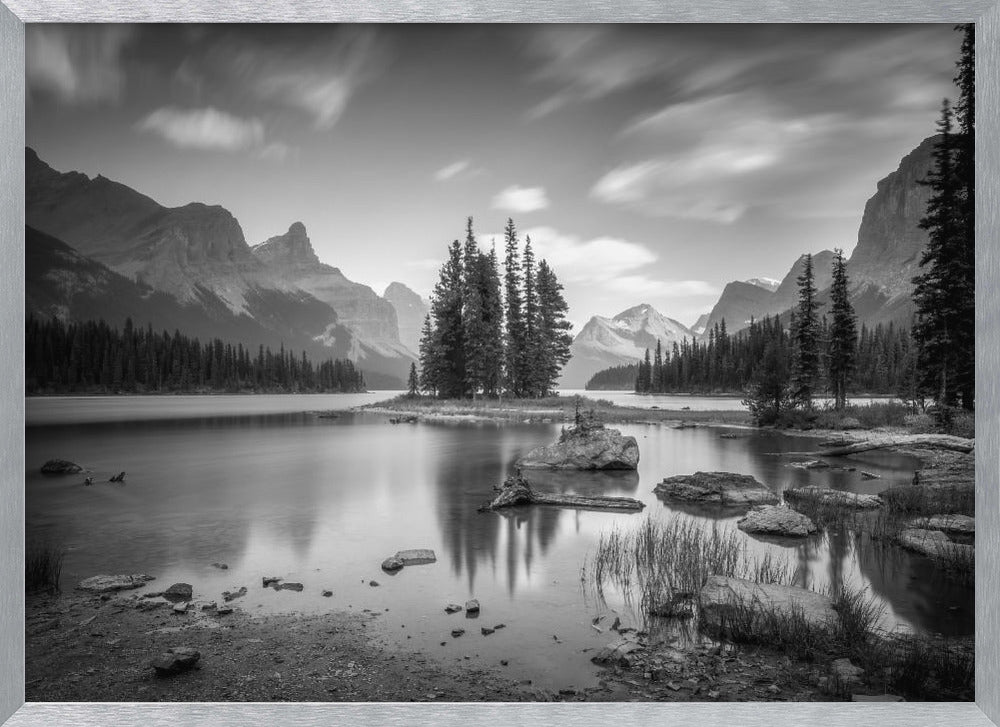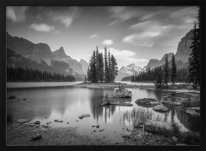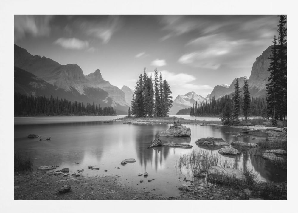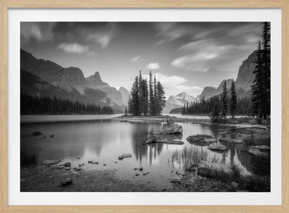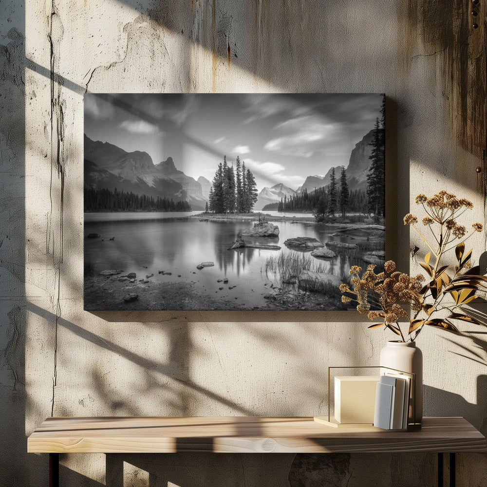 Denna fängslande poster av Christoph Schaarschmidt föreställer ikoniska Spirit Island i Jasper Nationalpark, Kanada. Bilden är ett mästerverk i svartvitt, där de snötäckta bergen reser sig majestätiskt över den stilla sjön och skapar en spegling av tidlös skönhet och ro. Den monokroma paletten förstärker det dramatiska landskapet och ger en känsla av lugn och storslagenhet.