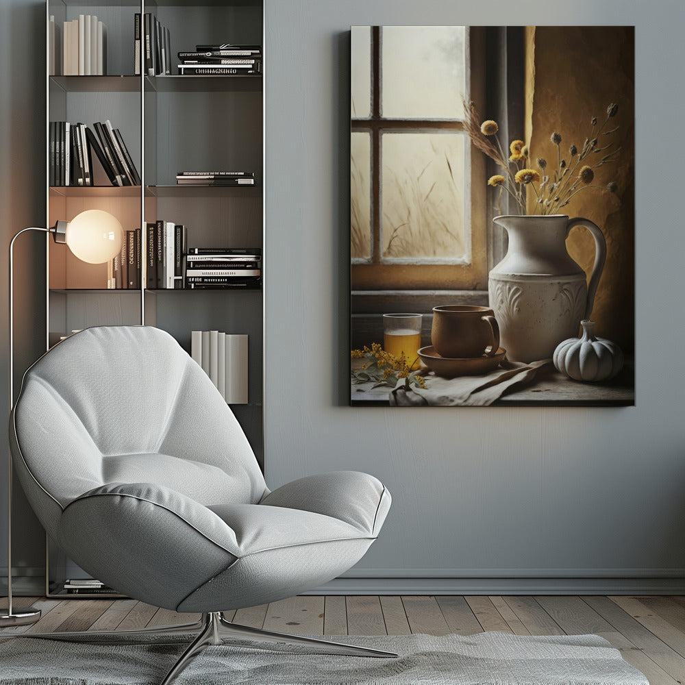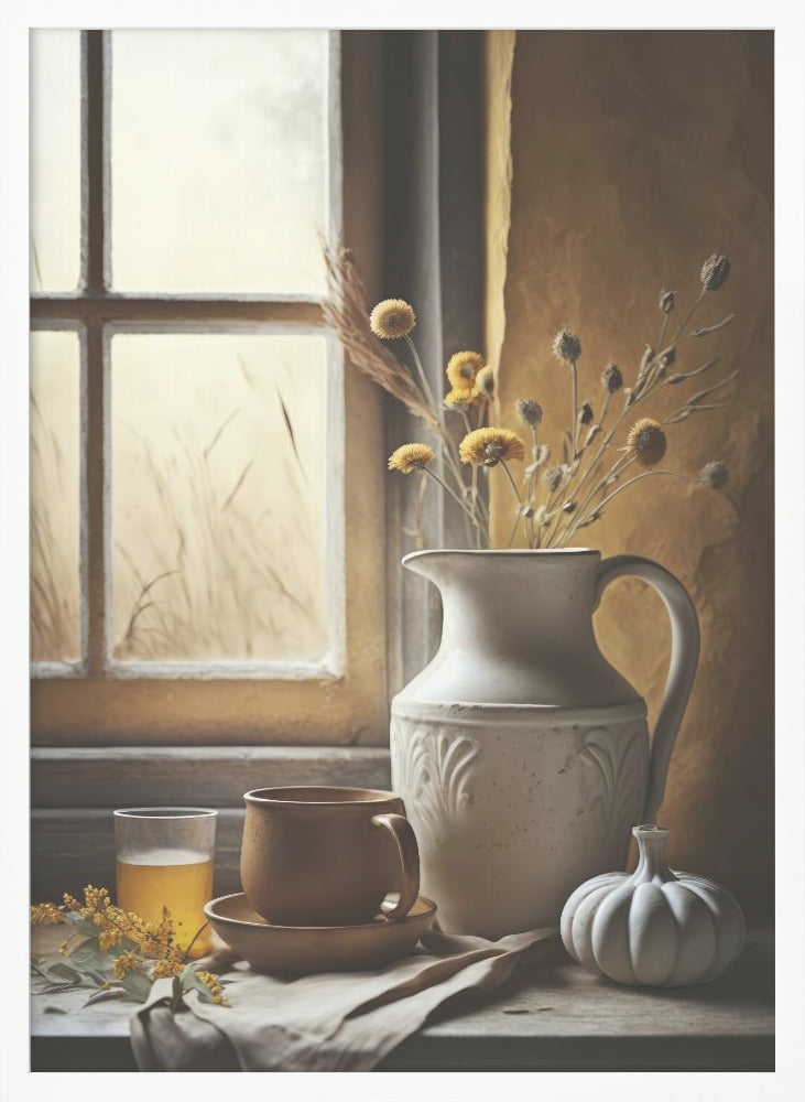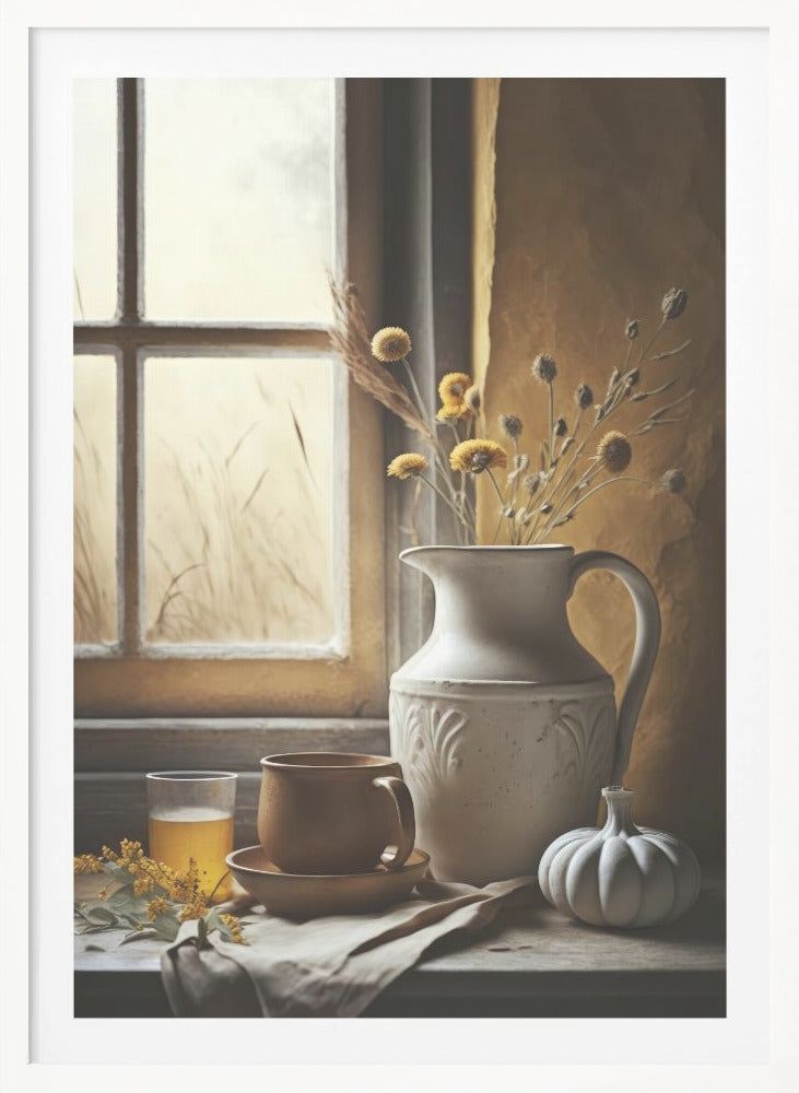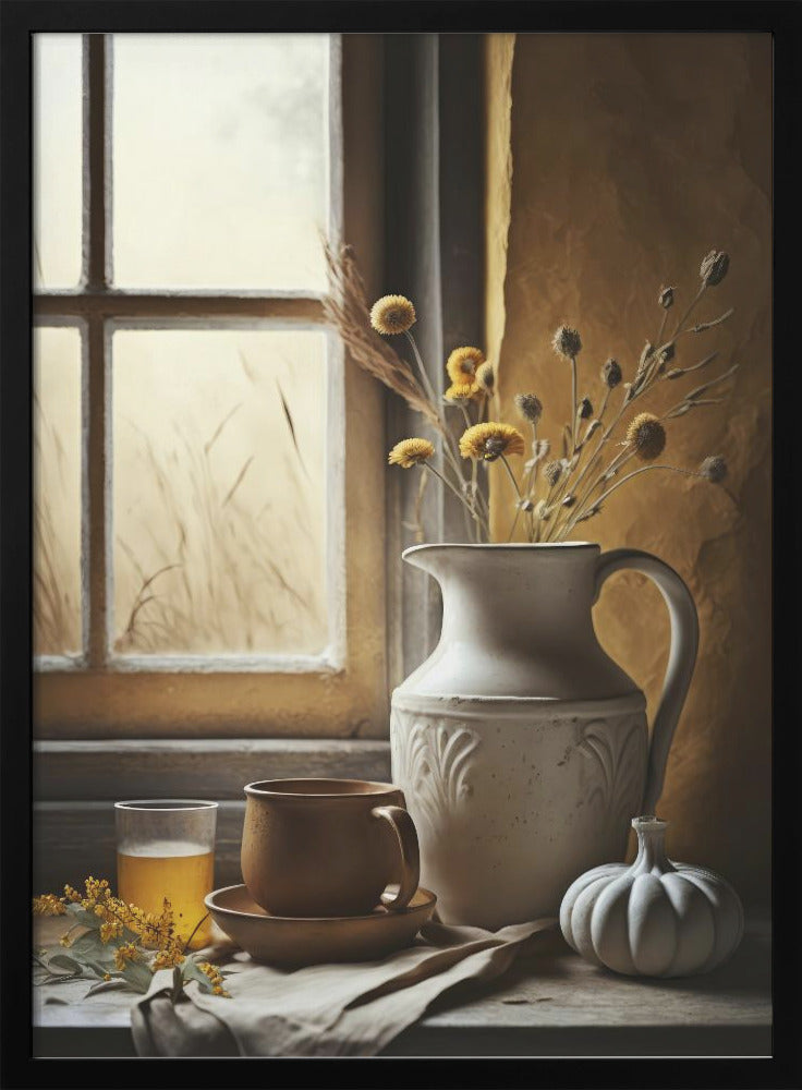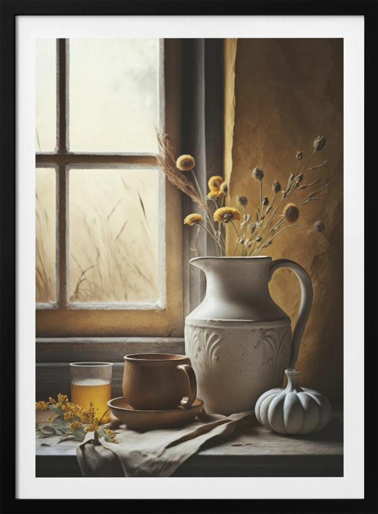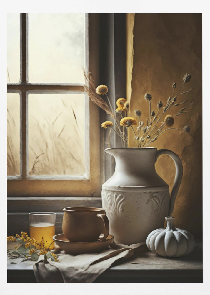 Från konstnären Treechild kommer 'Still Life Impressions No 7', en förtrollande poster som fångar vardagens skönhet. Detta konstverk presenterar ett modernt stilleben med en mysig atmosfär, där en pumpa och en vas med blommor samspelar med en enkel tekopp. Med sina mjuka färger och impressionistiska stil skapar den en varm och inbjudande känsla i ditt kök eller vardagsrum.