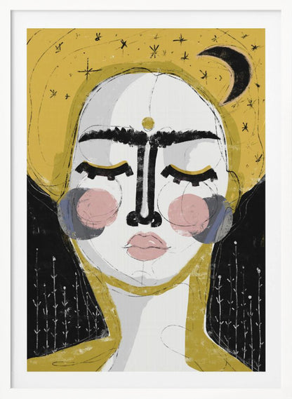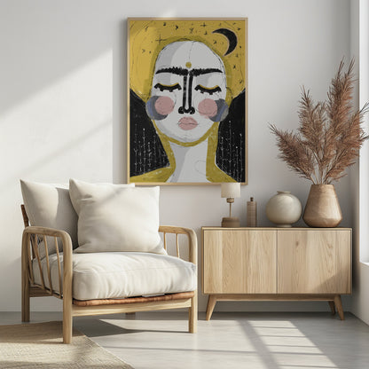 Upplev den mystiska dragningskraften hos "The Goddess Of The Night", ett fängslande verk av Treechild. Denna poster presenterar en majestätisk gudinnagestalt med strålande ögon, omgiven av en stjärnklar natthimmel och en lysande måne. De varma gula och ockrafärgade tonerna skapar en målerisk och suggestiv känsla, perfekt för att addera en konstnärlig touch till ditt hem. Ett slående porträtt som drar blickarna till sig.