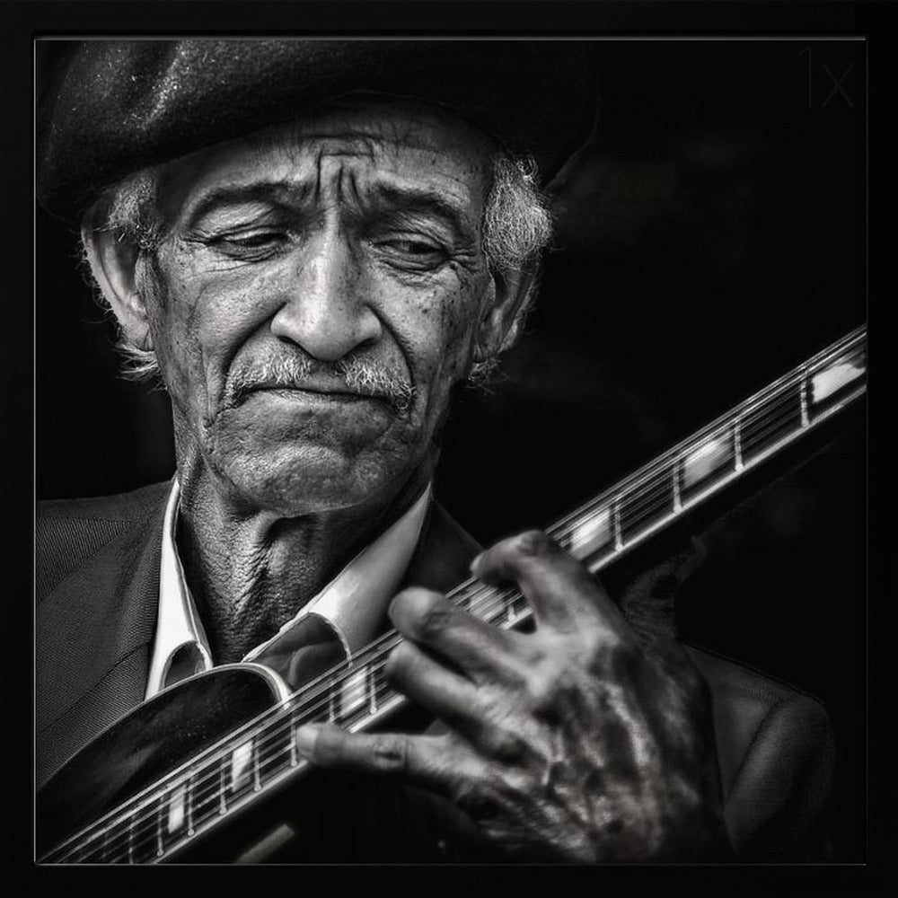 Konstnären Piet Flours verk "The Guitarist" fångar essensen av en musiker djupt försjunken i sin jazz. Den svartvita kompositionen och den lågmälda belysningen skapar en intim och tidlös atmosfär, där varje detalj framhäver gitarristens koncentration och passion. Ett starkt porträtt av musikens själ.