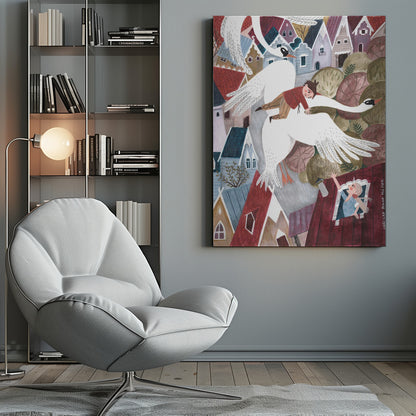 Upptäck den förtrollande världen med denna poster av Caroline Bonne Müller, en konstnär som mästerligt fångar sagornas magi. Detta konstverk skildrar en hjärtvärmande scen med flygande vildgäss och barn, inspirerad av klassiska äventyr som Nils Holgersson. De mjuka färgerna och den drömska stilen gör den perfekt för barnrummet eller för den som älskar fantasifulla berättelser.