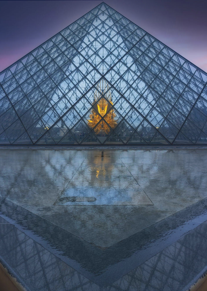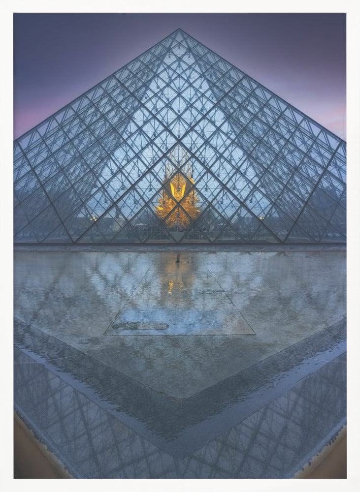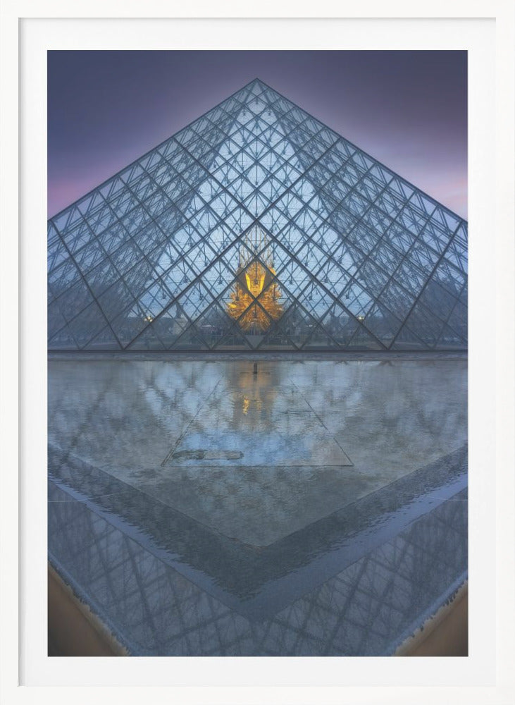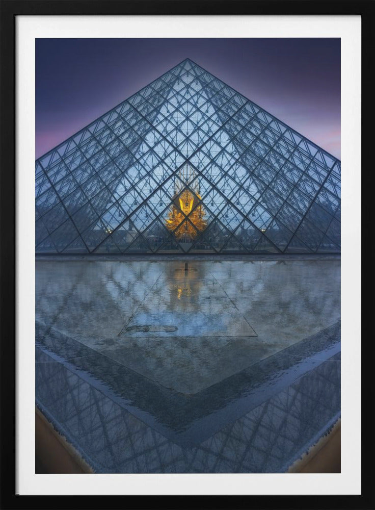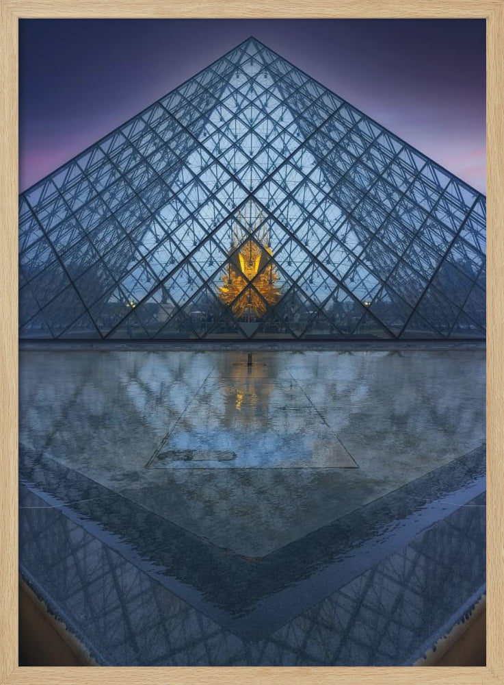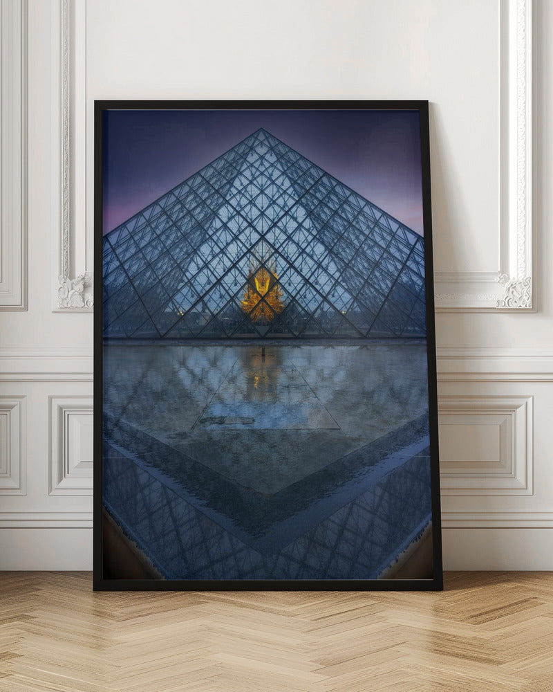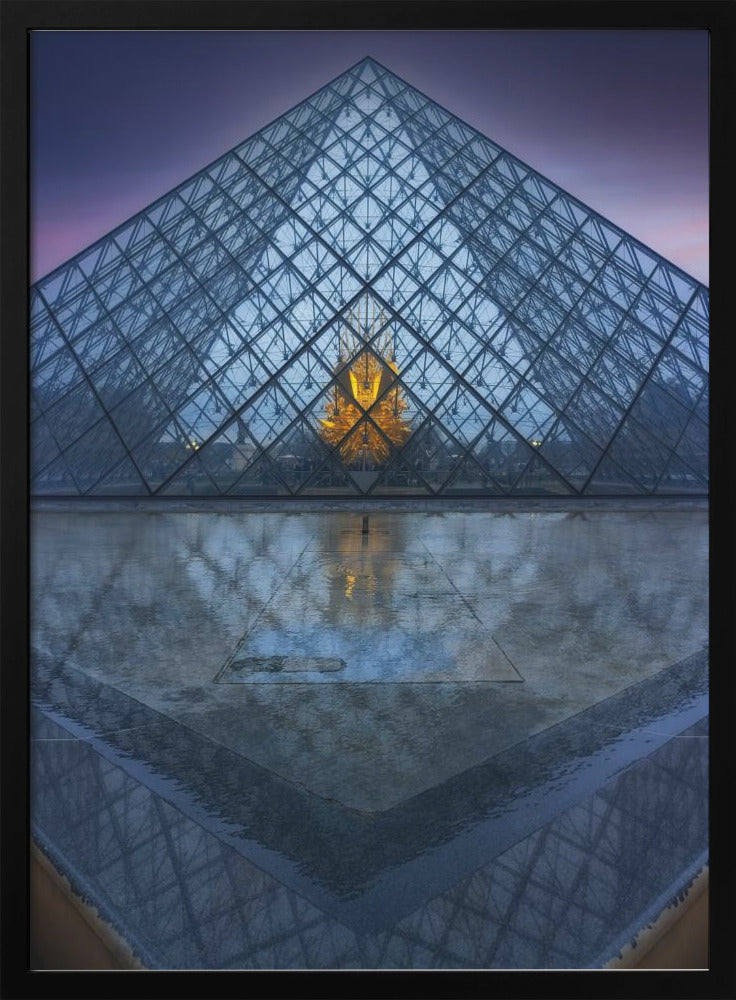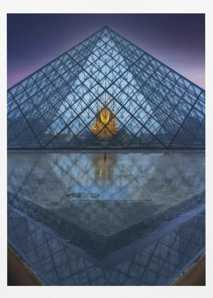 Upptäck "The piramid" av Jorge Lopez Noval, en fascinerande poster som fångar Louvrens ikoniska glaspyramid i Paris. Detta abstrakta och geometriska fotografi leker mästerligt med reflektioner och blå nyanser, vilket skapar en illusion av oändlighet och modern arkitektur. Det är en kreativ redigering som förvandlar ett klassiskt landmärke till ett fängslande konstverk med fokus på former och ett unikt ljusspel.