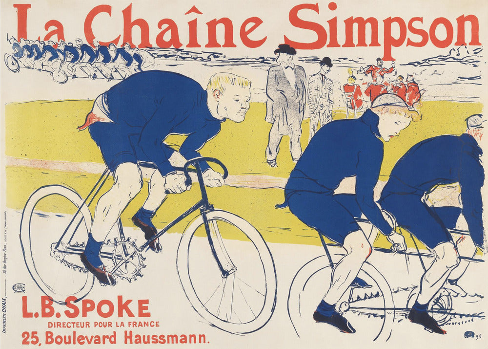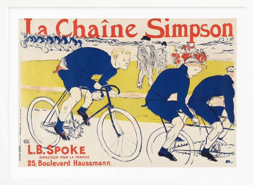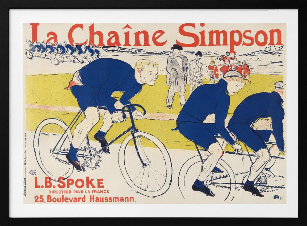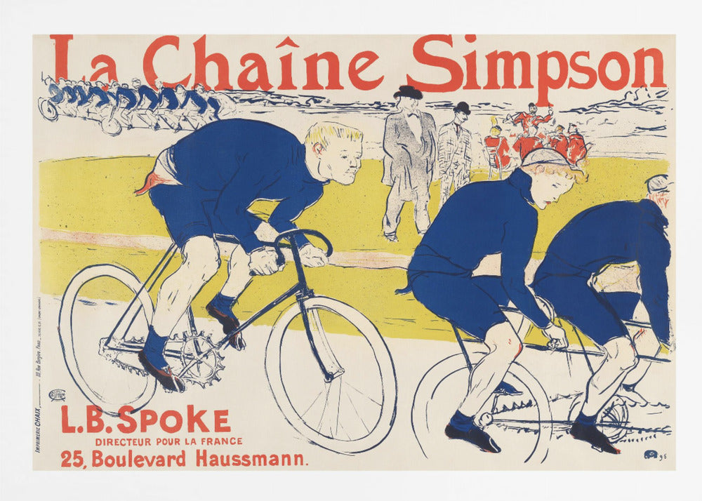 TOULOUSE LAUTREC fångar med mästerskap cykelsportens dynamik i 'The Simpson Chain (1896)'. Detta klassiska konsttryck, med sina karakteristiska penseldrag och livfulla färgpalett, utstrålar en energi som är typisk för impressionismen. Det är en hyllning till rörelse och det tidiga sportlivet.