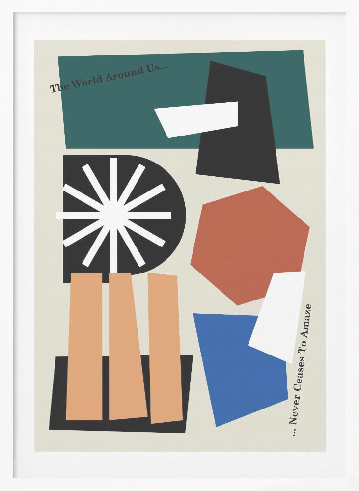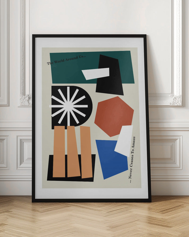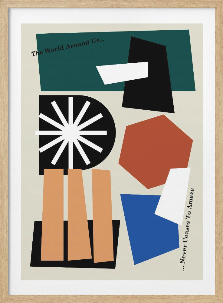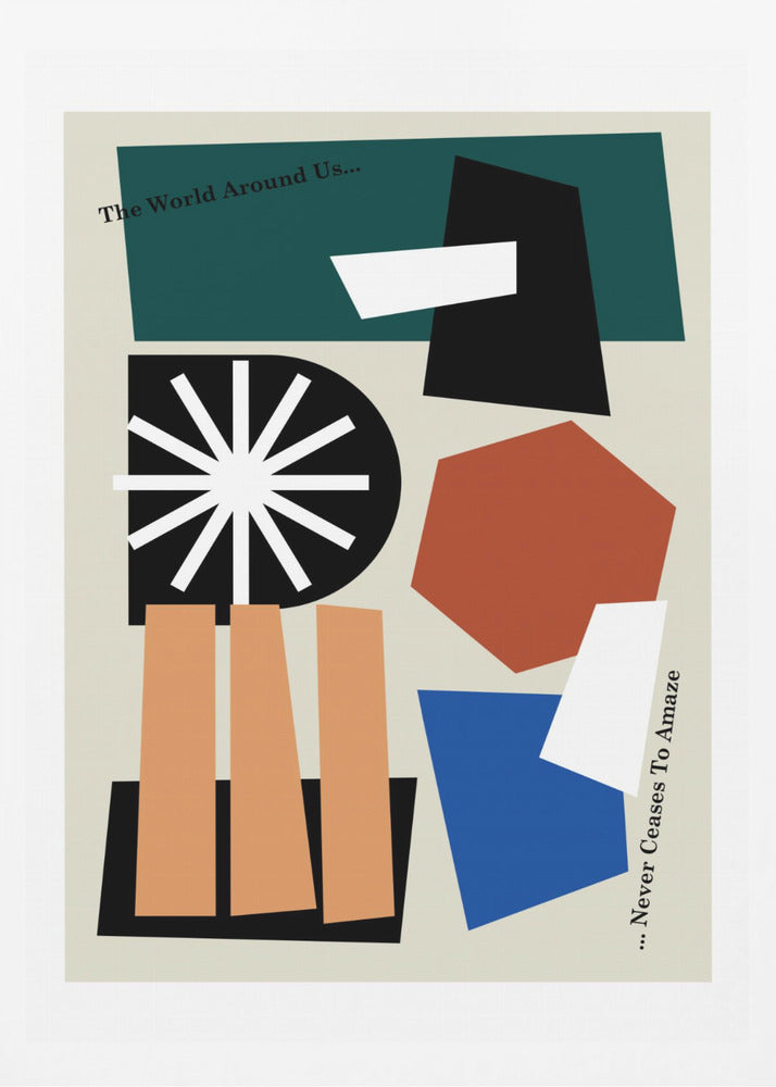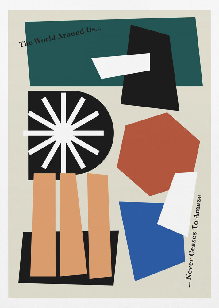 Dyk in i en värld av former och färger med "The World Around Us Greige", ett fängslande konstverk skapat av Frances Collett. Denna poster kombinerar abstrakt geometri med subtila nyanser av greige, inspirerad av Bauhaus-estetiken. Den skapar en harmonisk och modern känsla som tillför en sofistikerad touch till varje rum. Den unika typografin och de grafiska elementen berikar din inredning med stil och djup.