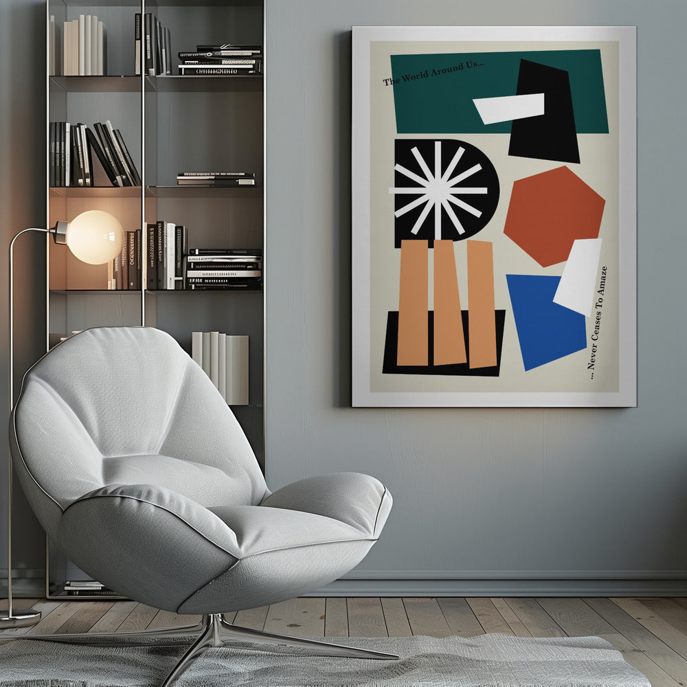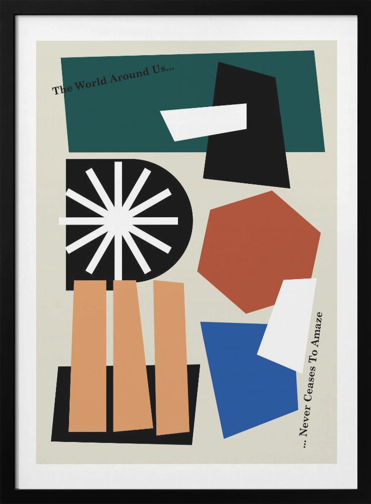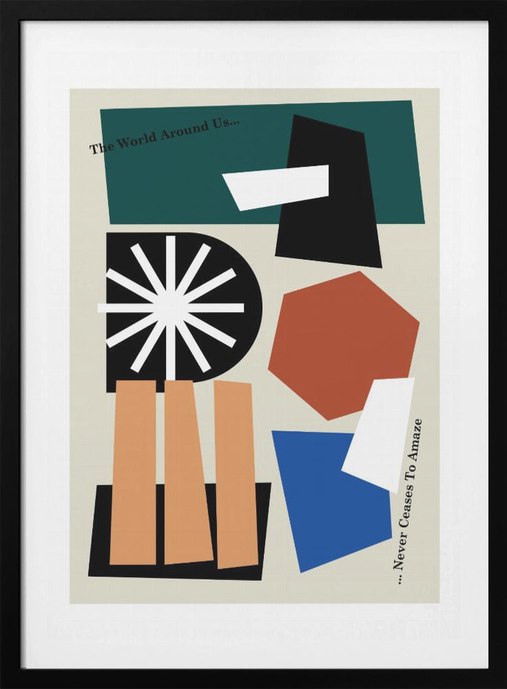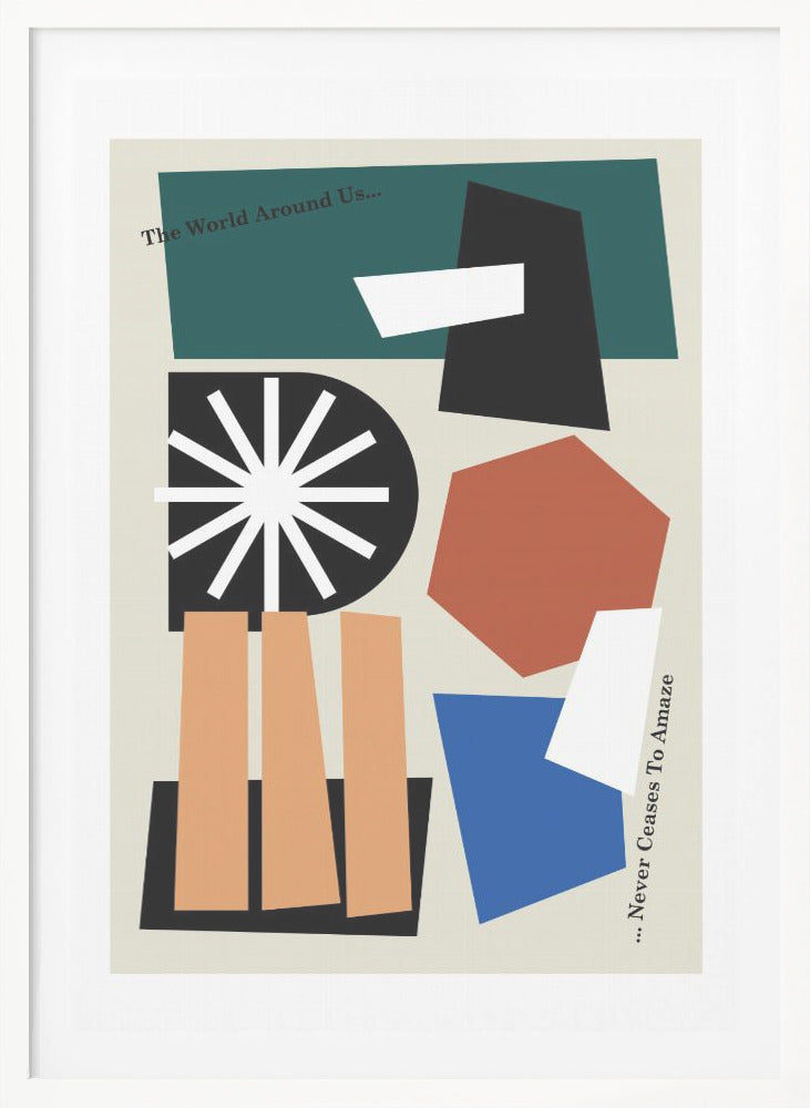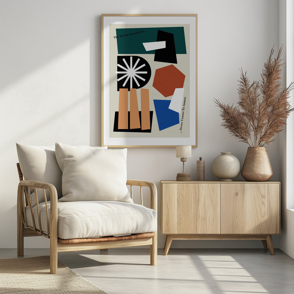 Dyk in i en värld av former och färger med "The World Around Us Greige", ett fängslande konstverk skapat av Frances Collett. Denna poster kombinerar abstrakt geometri med subtila nyanser av greige, inspirerad av Bauhaus-estetiken. Den skapar en harmonisk och modern känsla som tillför en sofistikerad touch till varje rum. Den unika typografin och de grafiska elementen berikar din inredning med stil och djup.