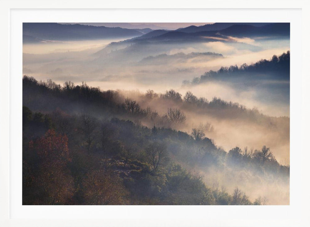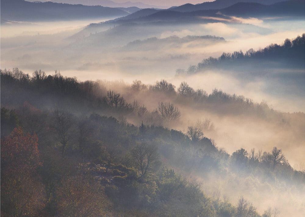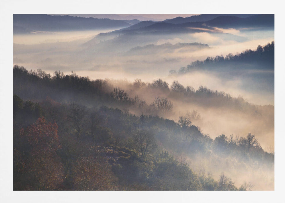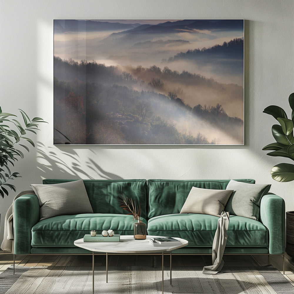 Upplev magin i Dora Artemiadis konstverk "These Magic Moments", en hisnande poster som fångar den mystiska atmosfären i Epirus nationalpark under en dimmig morgon. Med lager av träd som tonar bort i diset och ett mjukt ljus som bryter igenom, skapas en drömsk och majestätisk landskapsvy. Denna tavla förmedlar en känsla av lugn och tidig höst.