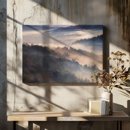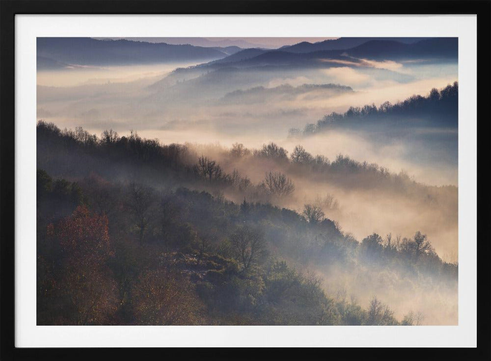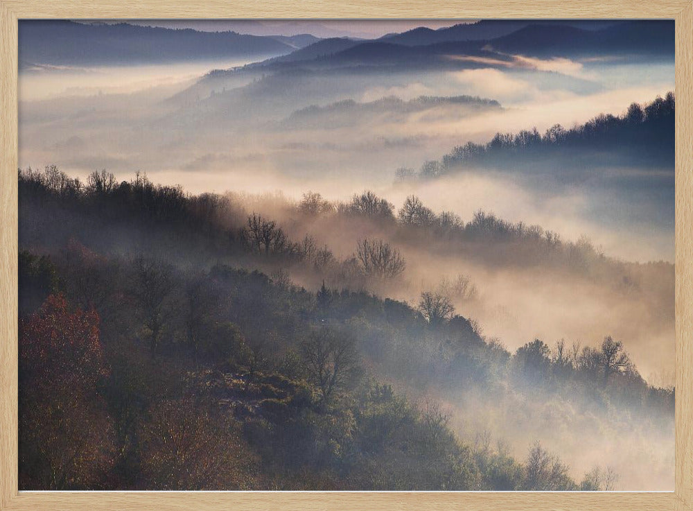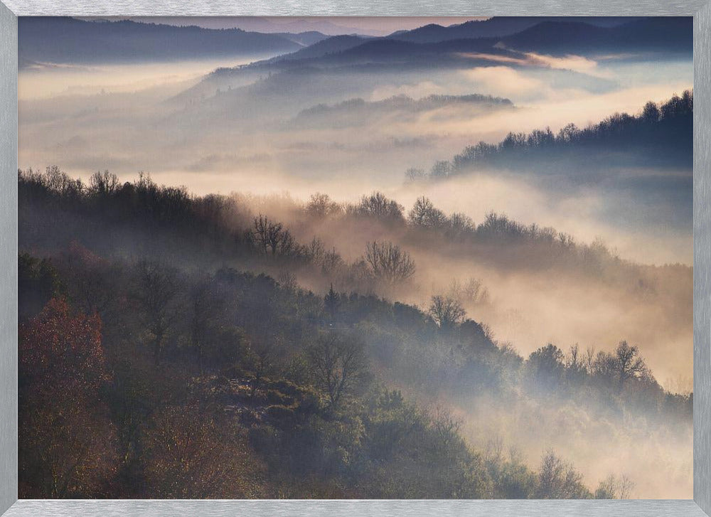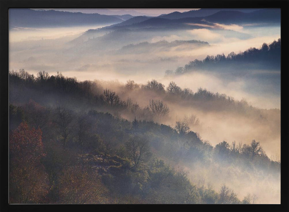Upplev magin i Dora Artemiadis konstverk "These Magic Moments", en hisnande poster som fångar den mystiska atmosfären i Epirus nationalpark under en dimmig morgon. Med lager av träd som tonar bort i diset och ett mjukt ljus som bryter igenom, skapas en drömsk och majestätisk landskapsvy. Denna tavla förmedlar en känsla av lugn och tidig höst.