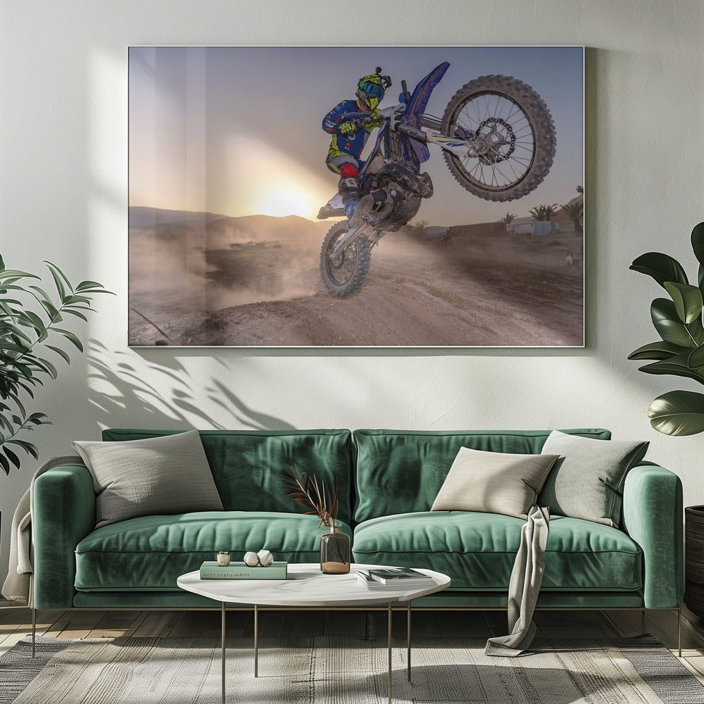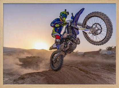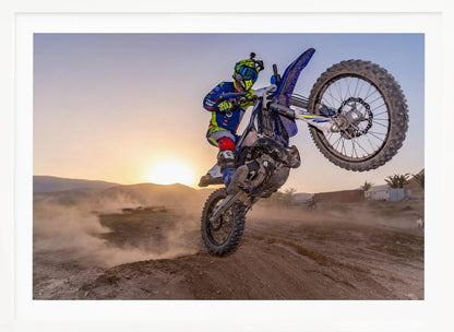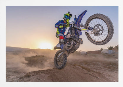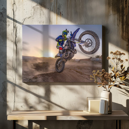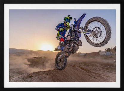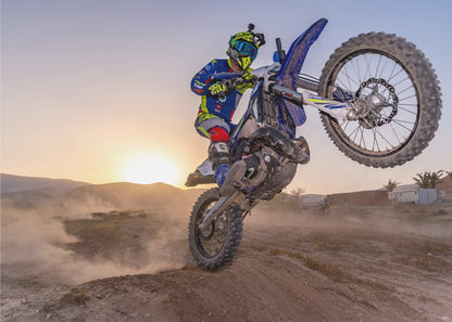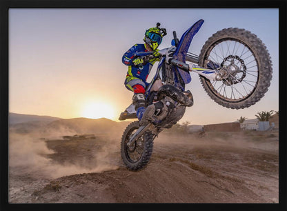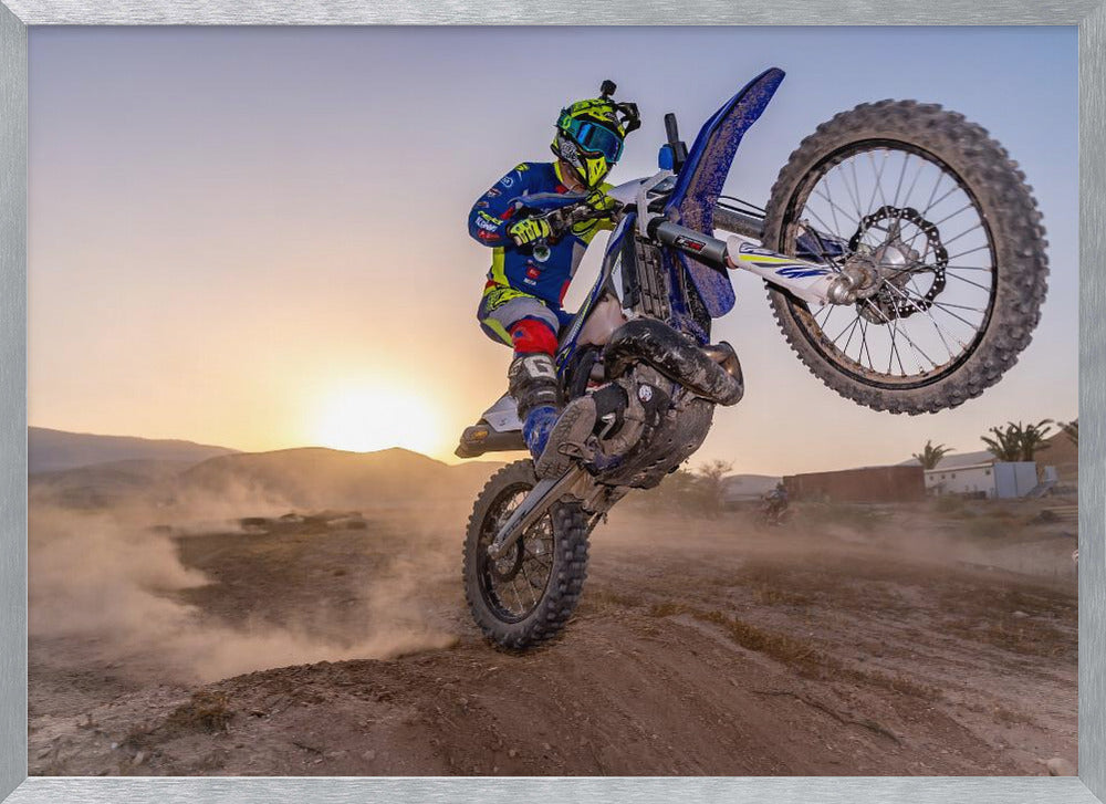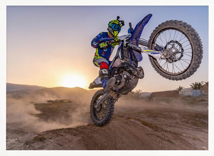 Denna dynamiska poster, skapad av den talangfulle konstnären Omri Gutman, fångar essensen av extrem motorsport i en adrenalinfylld ögonblicksbild. Med titeln "They Say Jump, I say I'm Mario", ser vi en motorcykelförare i full aktion som trotsar gravitationen under ett våghalsigt hopp, omgiven av virvlande damm och kraftfull energi. Den råa känslan och den detaljrika kompositionen gör denna bild till ett perfekt inslag för alla som älskar fart, spänning och motorcykelkultur.