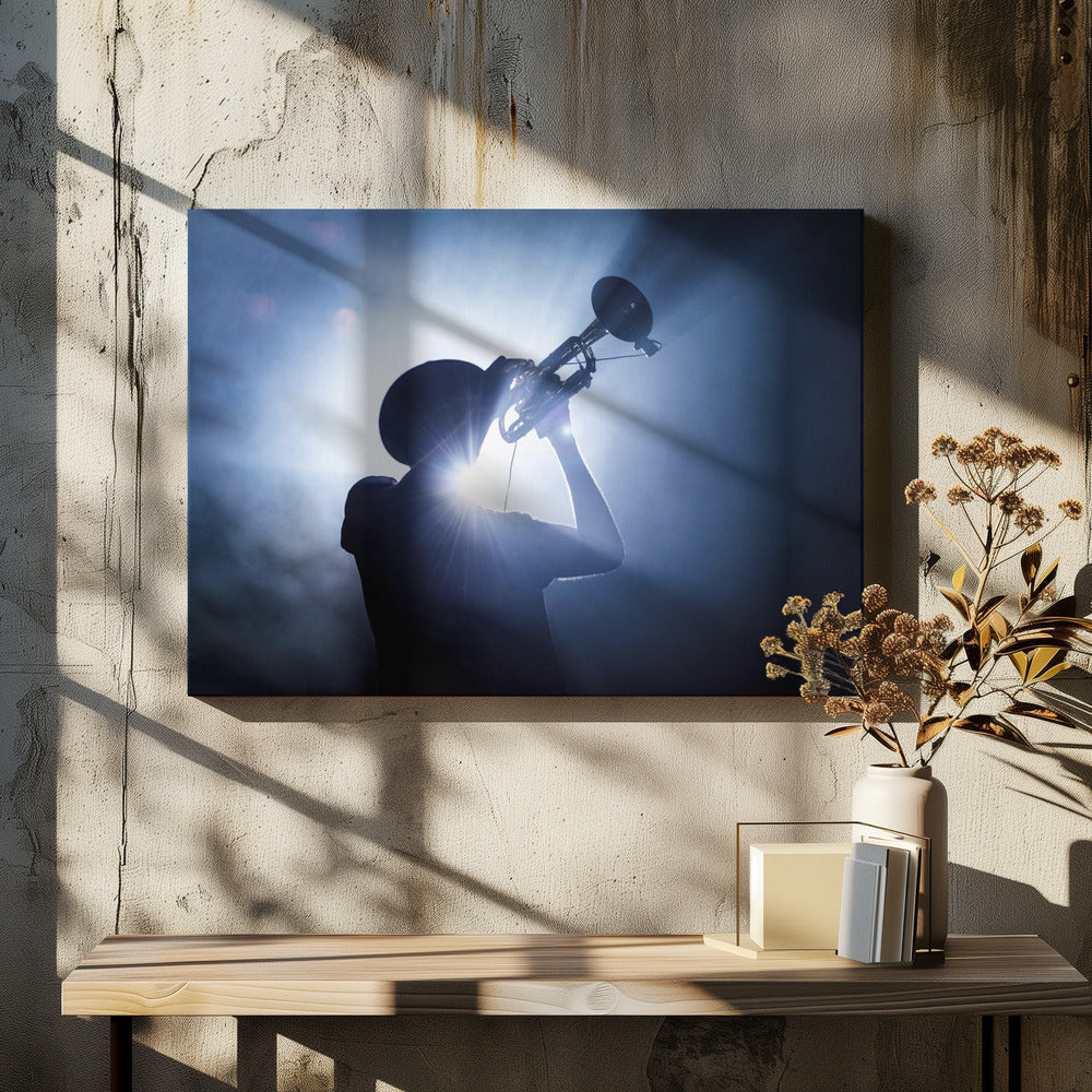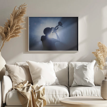 Fånga musiken med Erik de Klercks Trumpet Player-poster, en dynamisk skildring av en trumpetare i strålkastarljuset. Den dramatiska silhuetten mot den blåtonade bakgrunden skapar en intensiv atmosfär som omedelbart drar ögat till sig. En konstnärlig hyllning till jazzens och rockens värld, perfekt för musikälskare.