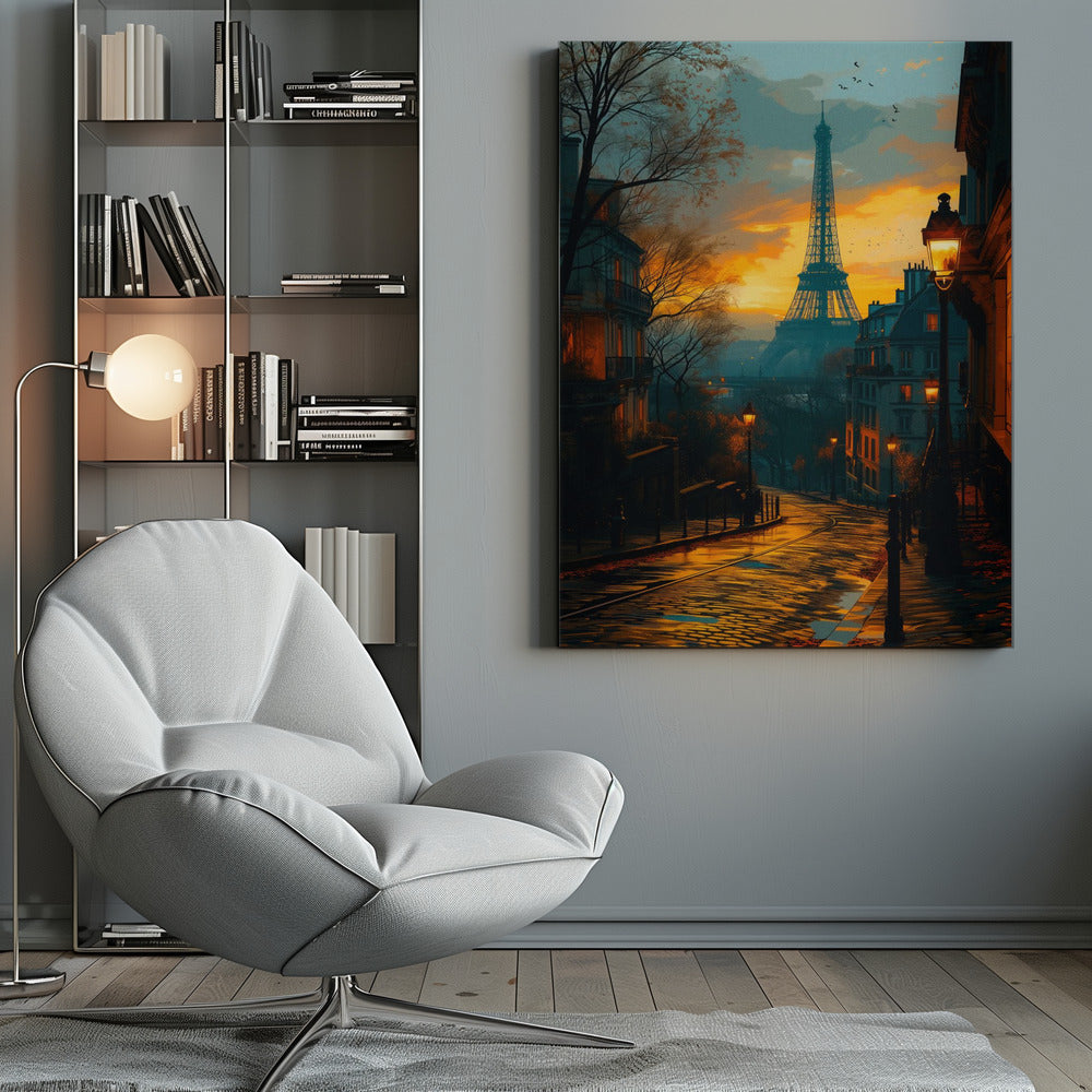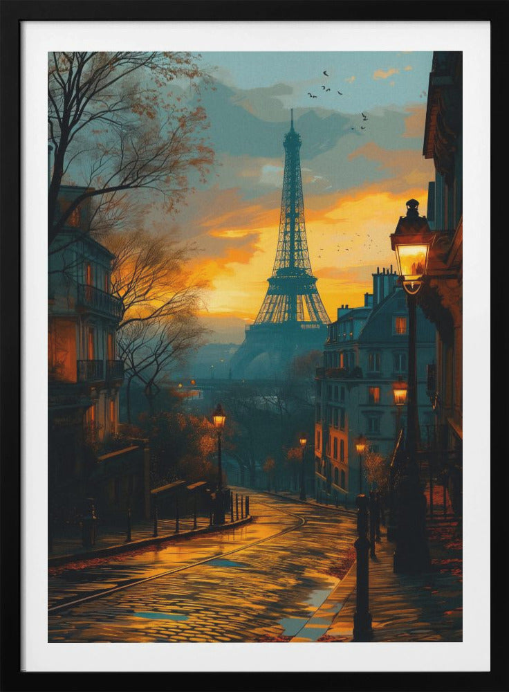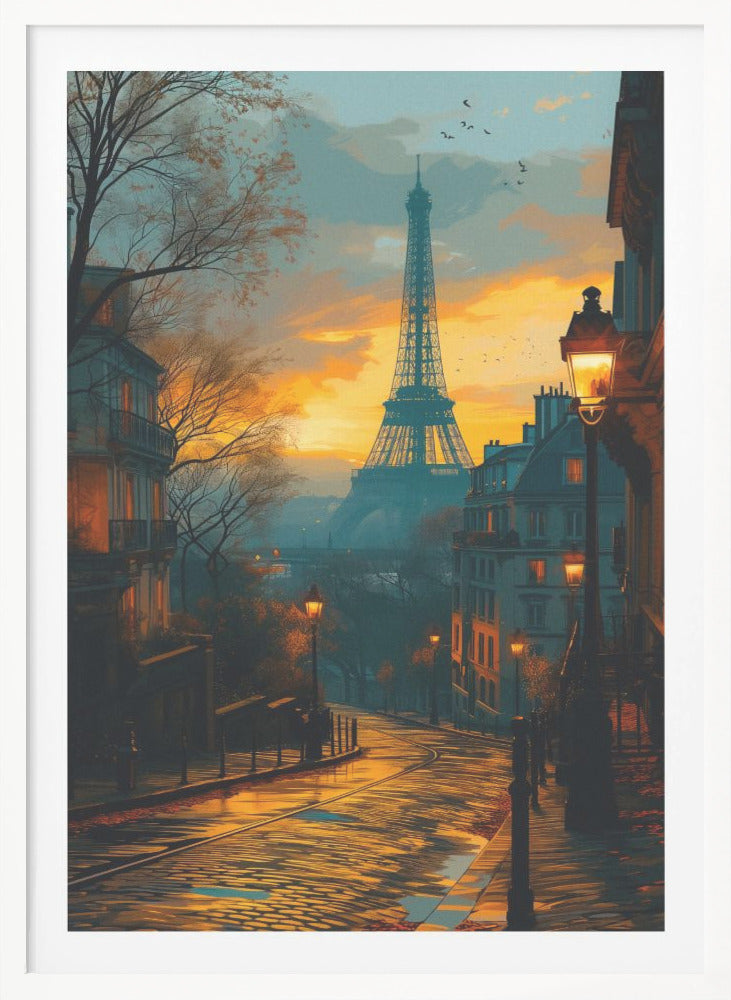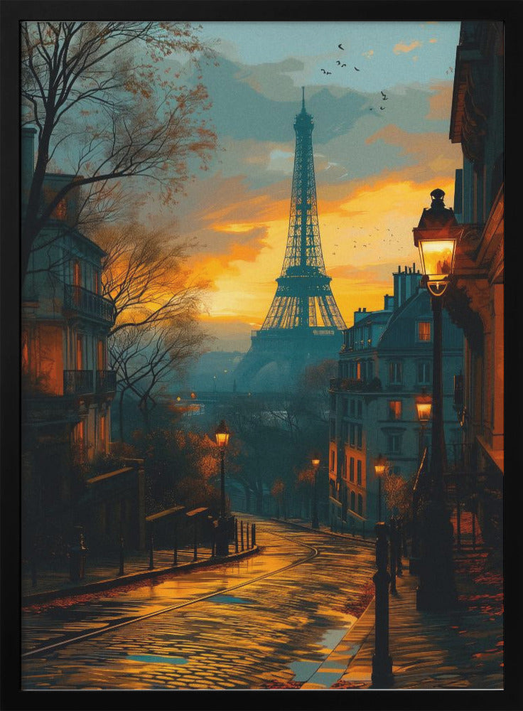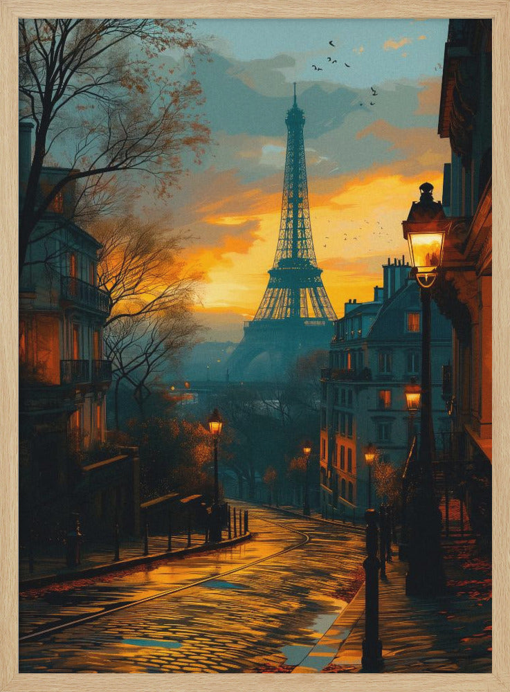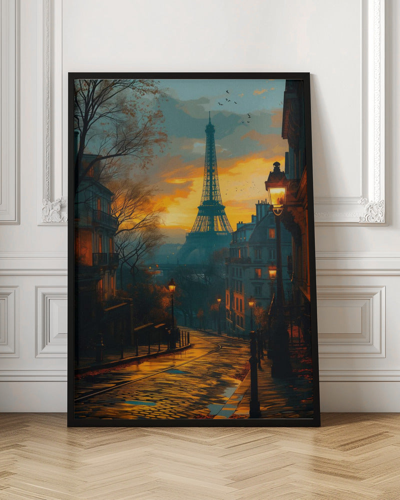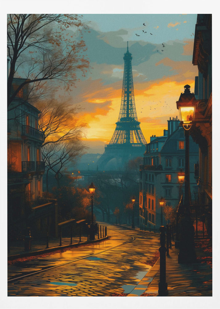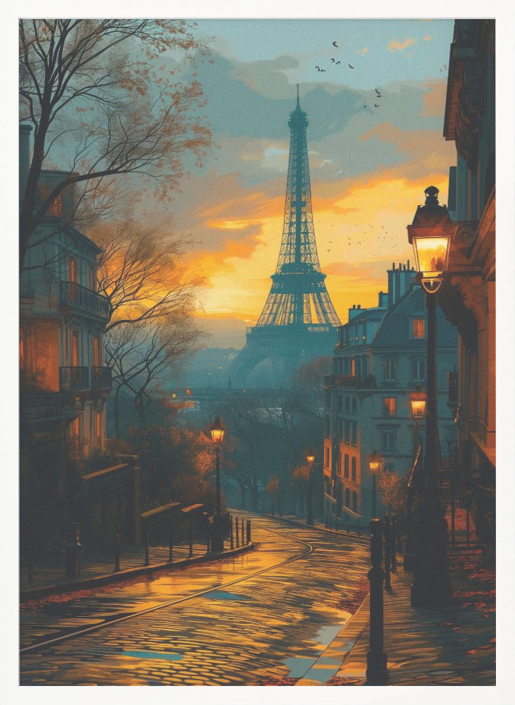 Taudalpoi presenterar "Welcome to Paris" – en förtrollande affisch som tar dig med till Paris i skymningen. Detta digitala konsttryck fångar Eiffeltornets ikoniska silhuett mot en dramatisk himmel, med en retroinspirerad, målerisk stil som ger en drömsk och inbjudande känsla. Perfekt för att skapa en känsla av äventyr i ditt hem.