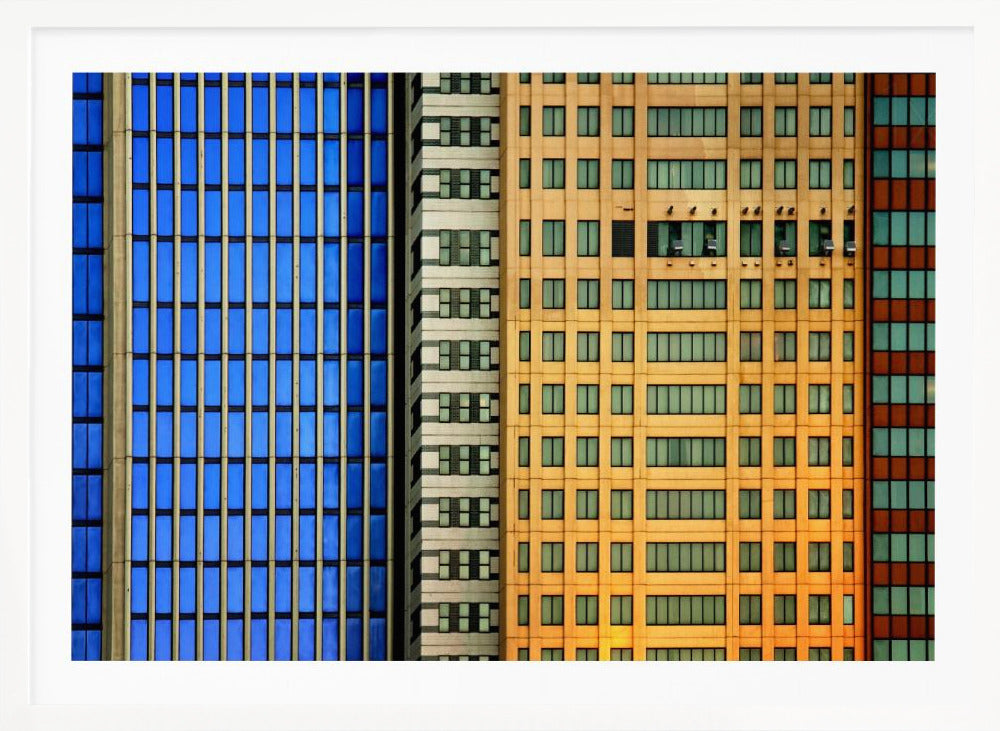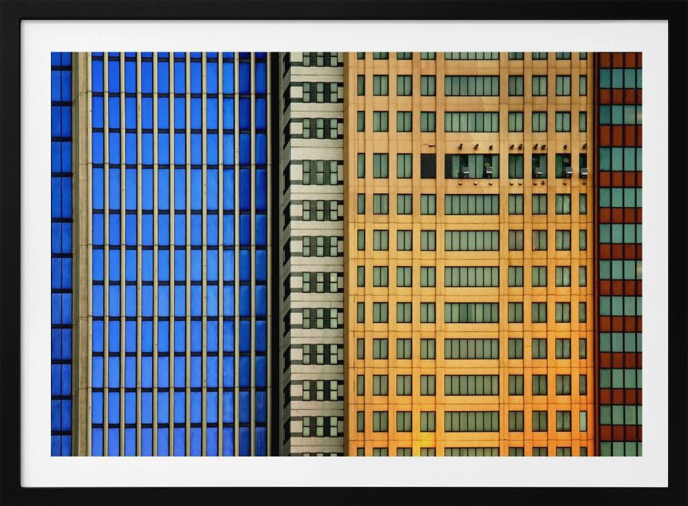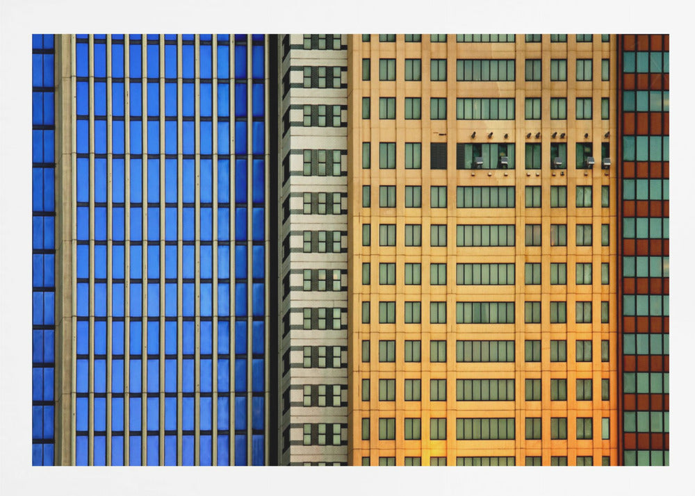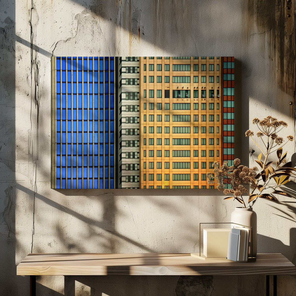 Låt dig fascineras av "Windows on the City", ett konstverk av Mathilde Guillemot som fångar storstadens puls genom en färgstark mosaik av fönster. Denna grafiska bild, med sina rena linjer och geometriska mönster, skapar en abstrakt men ändå igenkännbar bild av en modern skyskrapa. Perfekt för att addera en urban känsla till ditt hem.