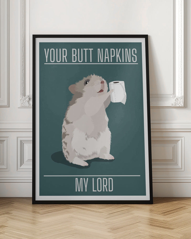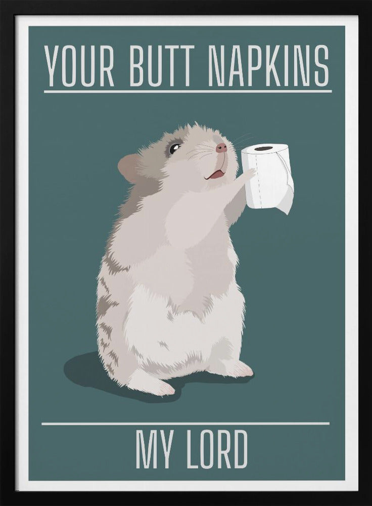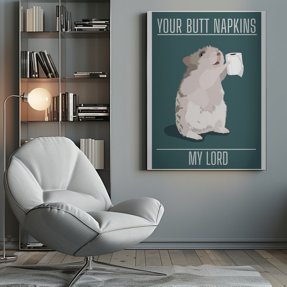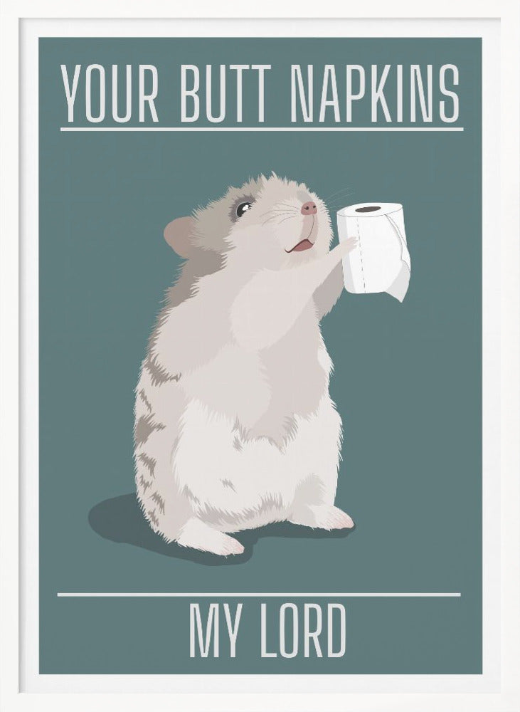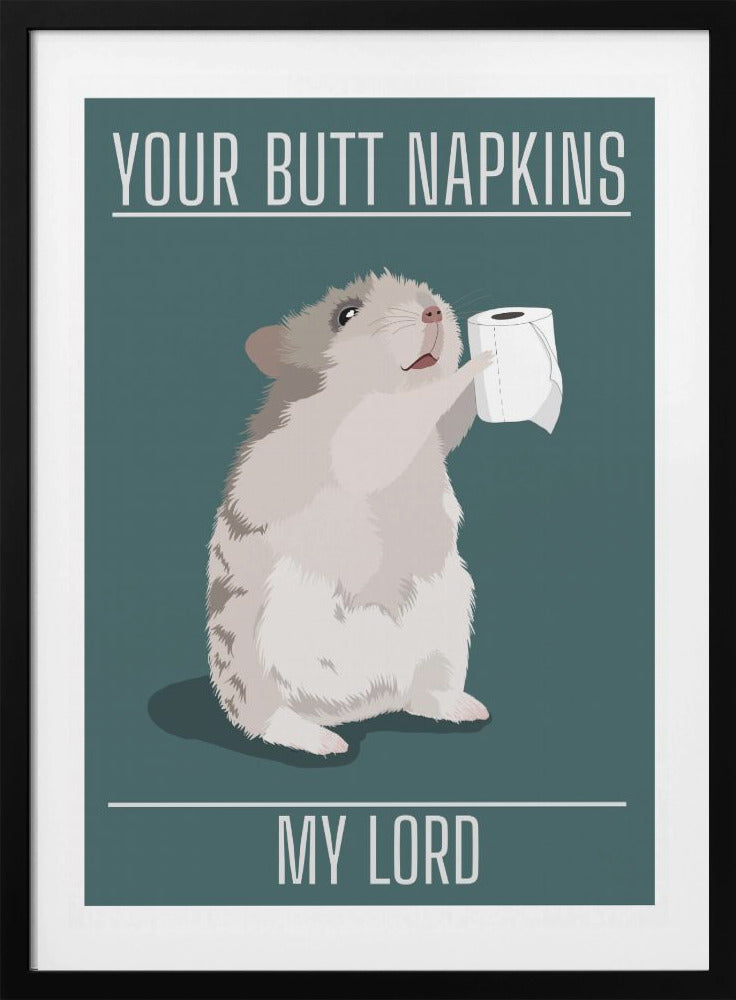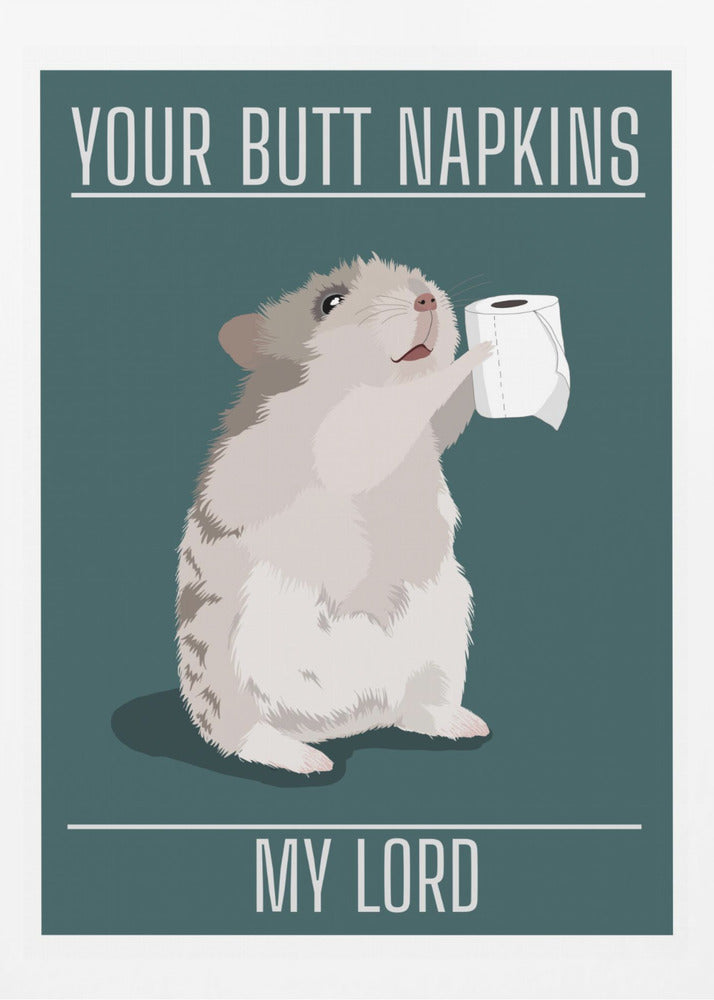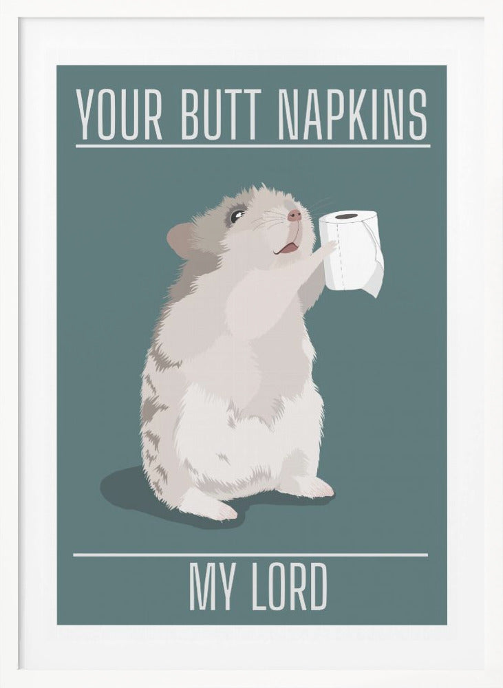 Upptäck den charmiga och humoristiska poster "Your Butt Napkins My Lord" skapad av ByKammille. Denna färgglada affisch fångar omedelbart blicken med sin unika och roliga illustration av en kråka och en hamster i en oväntad interaktion. Med en lekfull typografi i turkosa toner adderar den en inspirerande och lustig touch till vilket rum som helst.